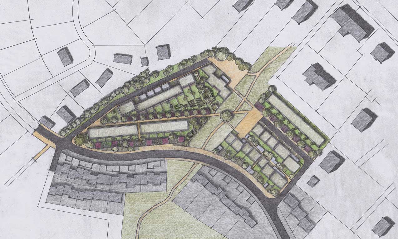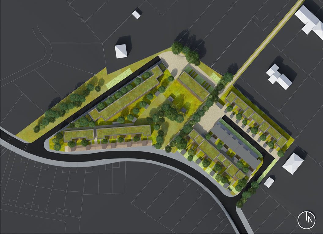 Le projet s’organise autour de deux voies en équerre connectées à la rue de l’Abbé Pierre et bouclées par un parcours piéton. Elles sont rejetées en périphérie des deux lots alloués au projet et introduisent une distance de courtoisie avec les avoisinants. Le cœur des parcelles est ainsi pacifié tout en étant connecté au nord à un cheminement piéton qui relie directement le nouveau quartier au centre bourg de Landouge avec ses services et commerces.