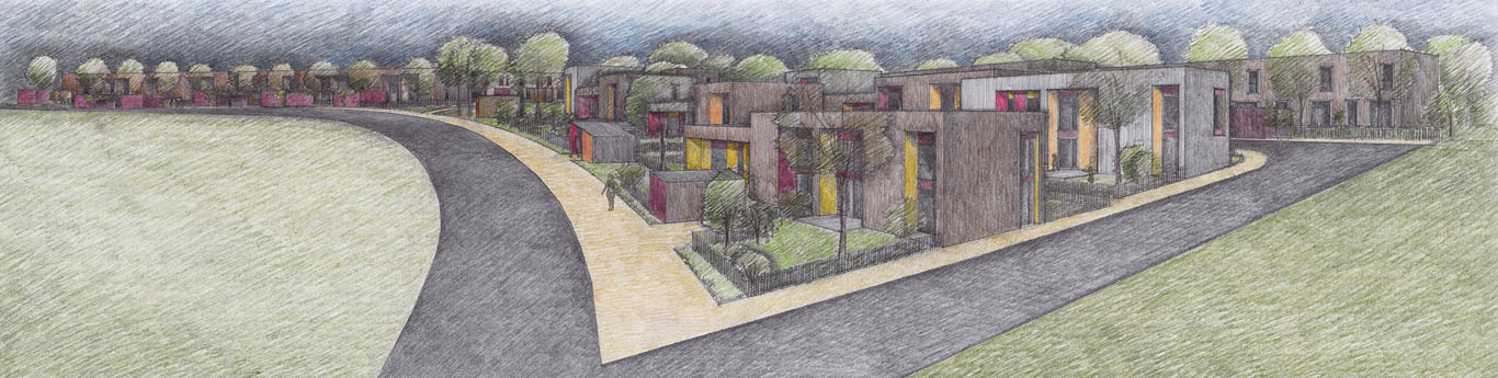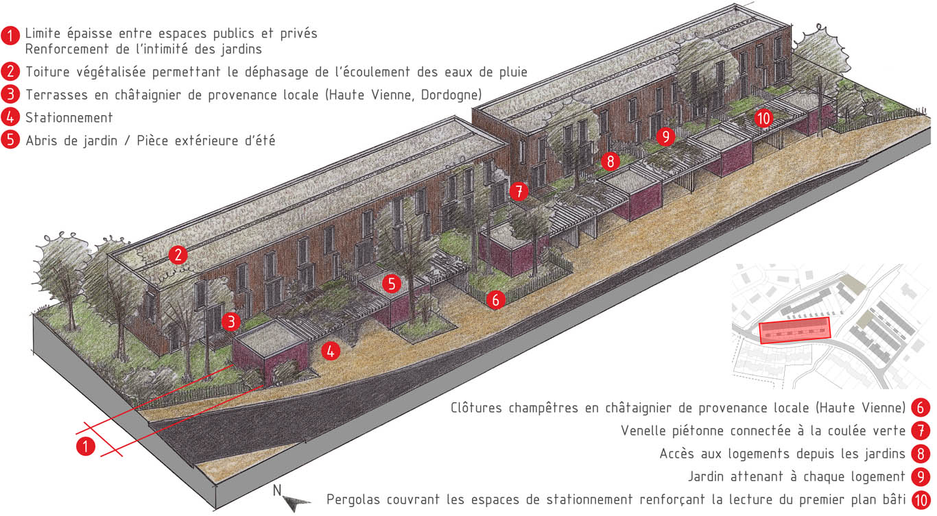 Limoges Habitat lance en 2011 un concours d’architecture pour la conception de 51 habitations groupées à Limoges dans l’ancienne commune de Landouge, à l’ouest de la ville, proche de l’aéroport de Bellegarde. L’atelier d’architecture Simon Teyssou, associé aux BET Seterso, AES, Dejantes et C+, remportent le concours.