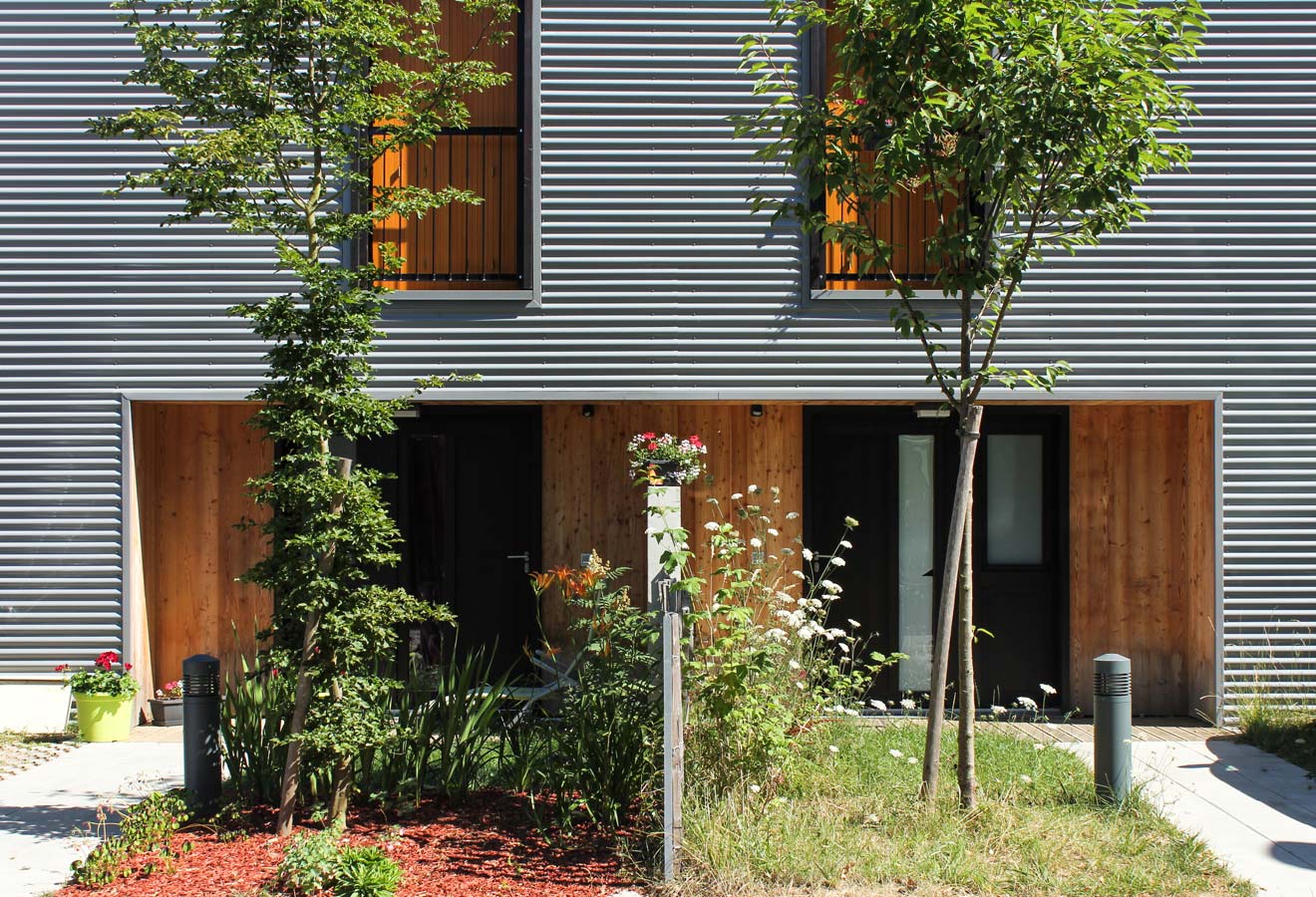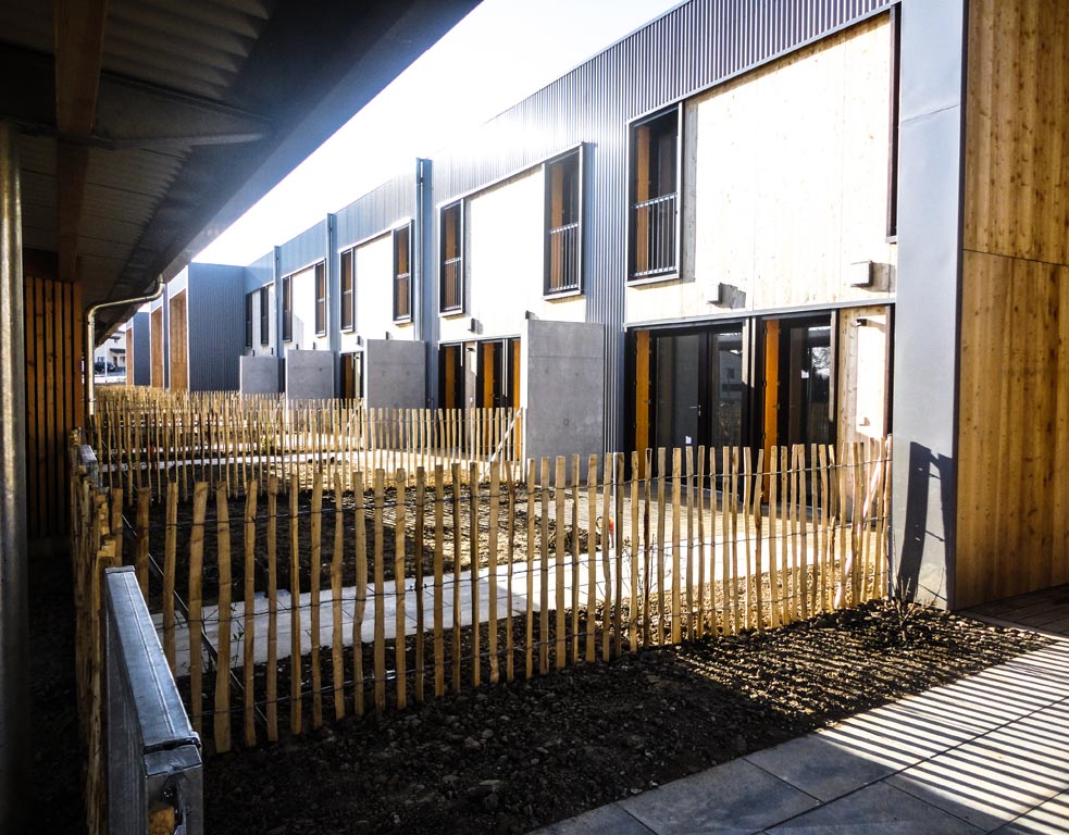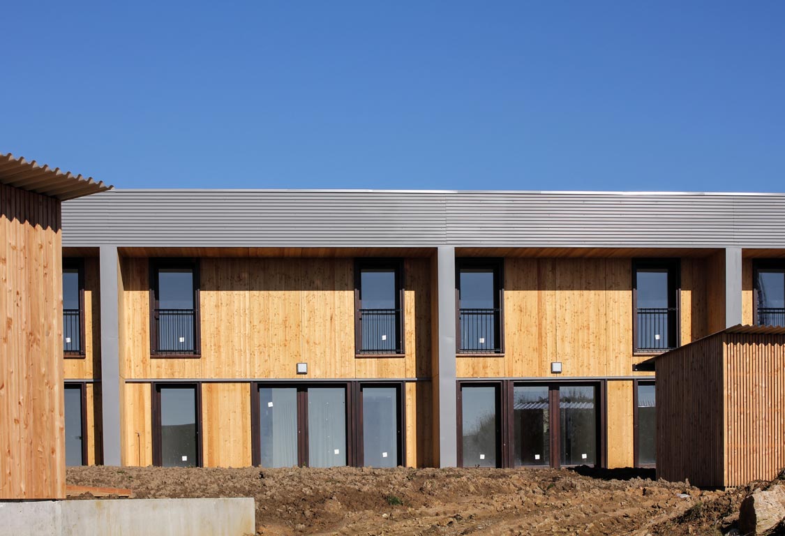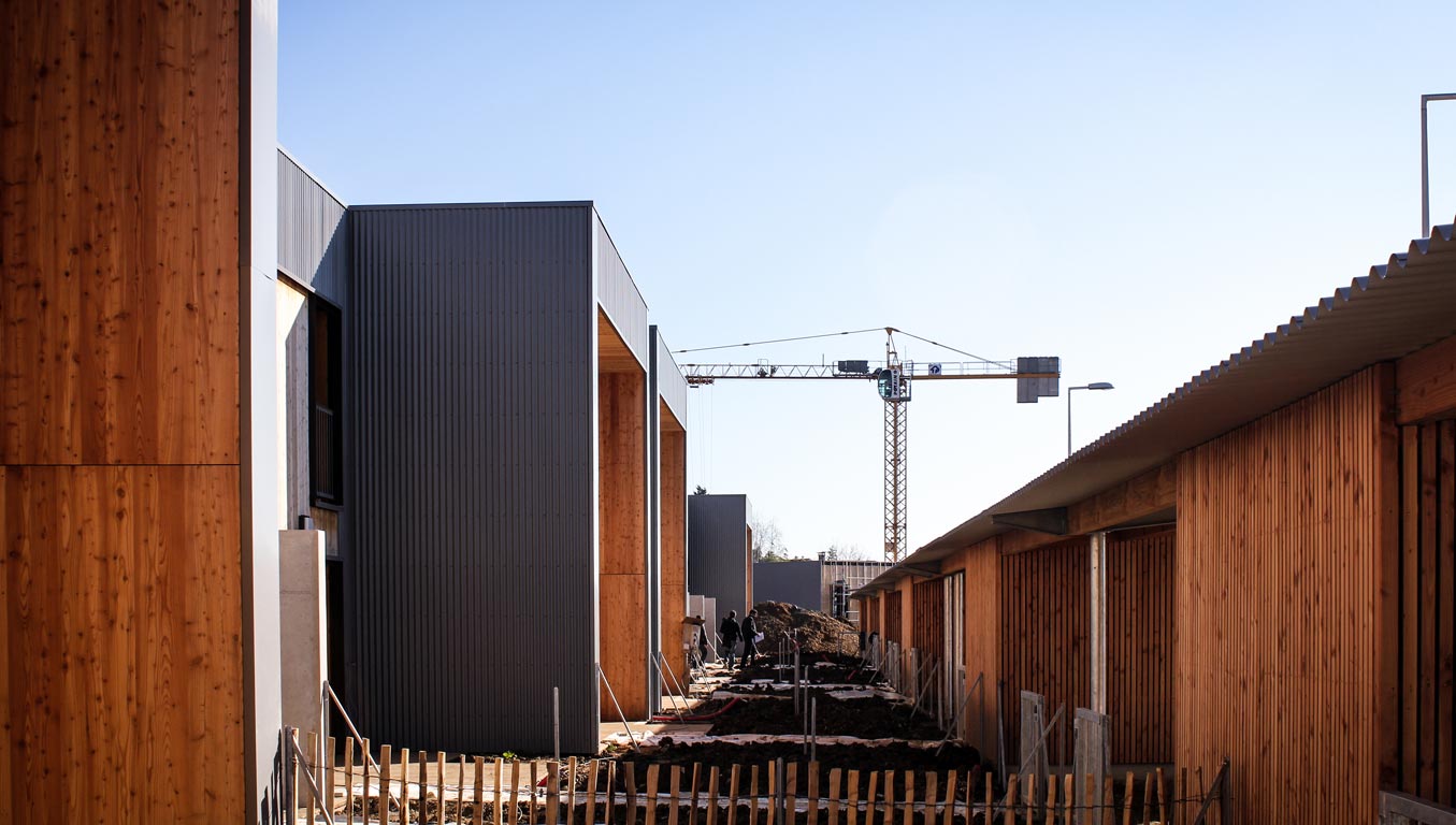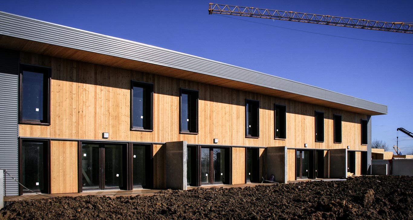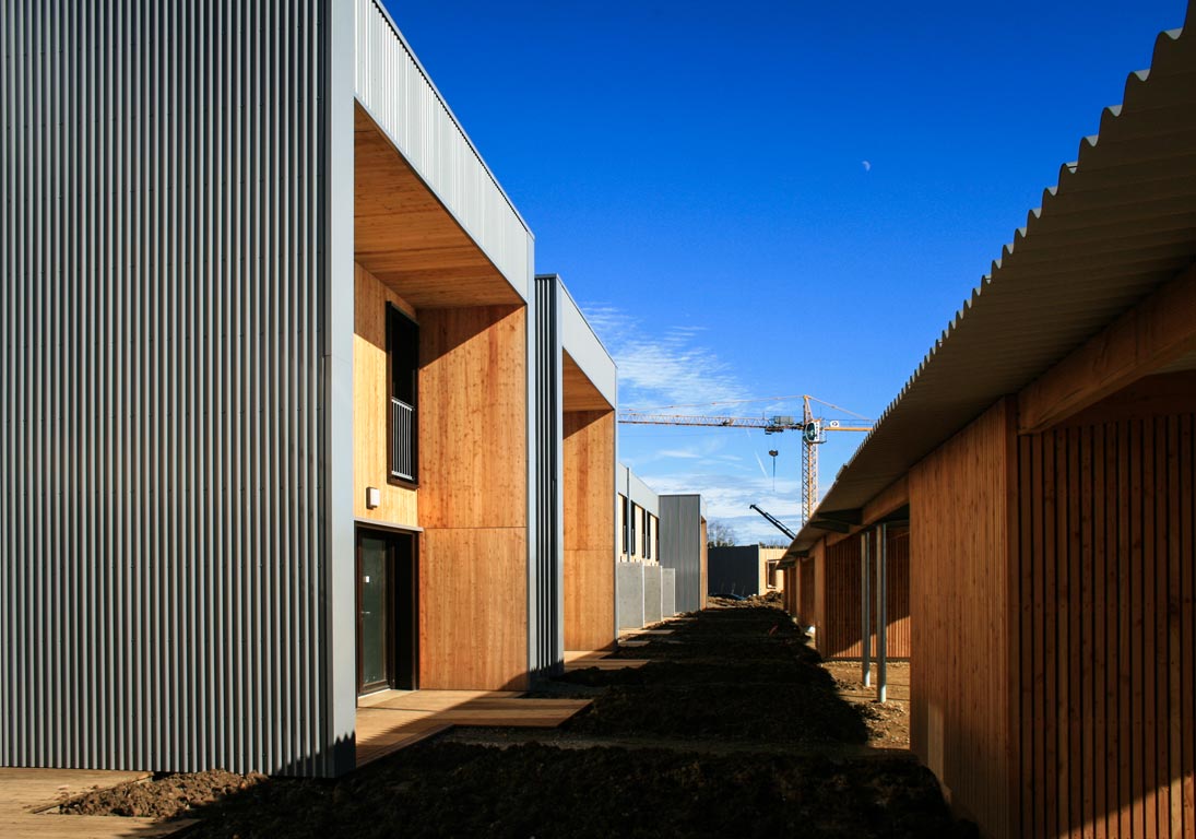 Du point de vue technologique, les habitations sont réalisées en structure bois. Les murs de refend entre logements sont en béton armé pour apporter une inertie thermique aux constructions légères tout en garantissant un excellent niveau de confort acoustique entre logements. Les toitures terrasses végétalisées apportent un supplément d’inertie et augmentent significativement le confort d’été des habitations.