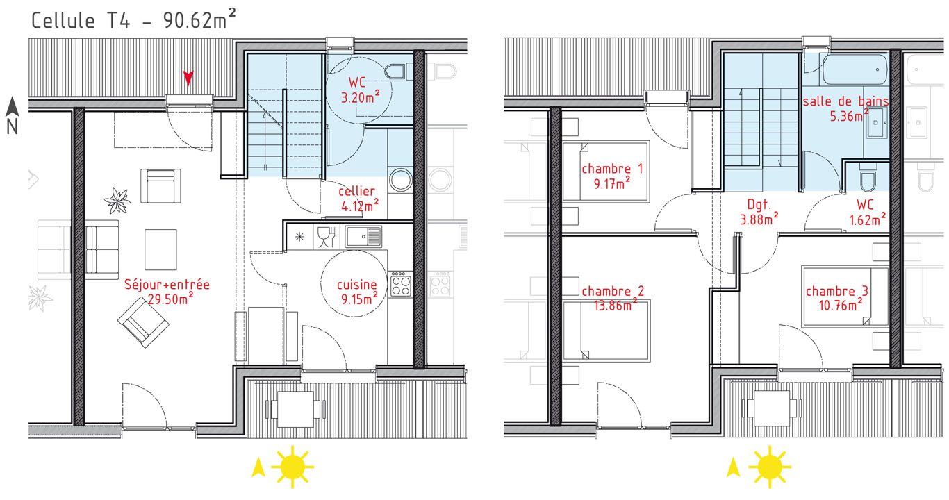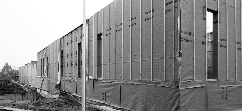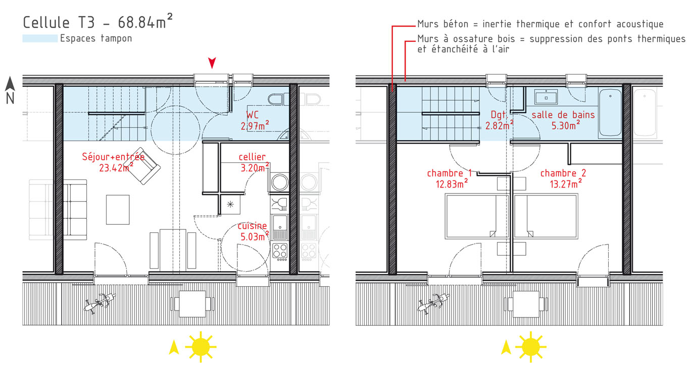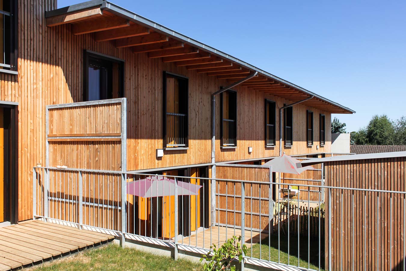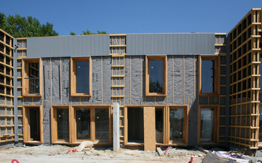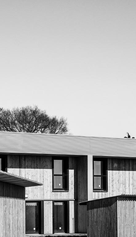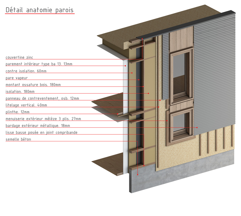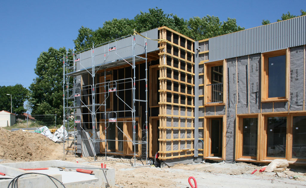 Du point de vue technologique, les habitations sont réalisées en structure bois. Les murs de refend entre logements sont en béton armé pour apporter une inertie thermique aux constructions légères tout en garantissant un excellent niveau de confort acoustique entre logements. Les toitures terrasses végétalisées apportent un supplément d’inertie et augmentent significativement le confort d’été des habitations.