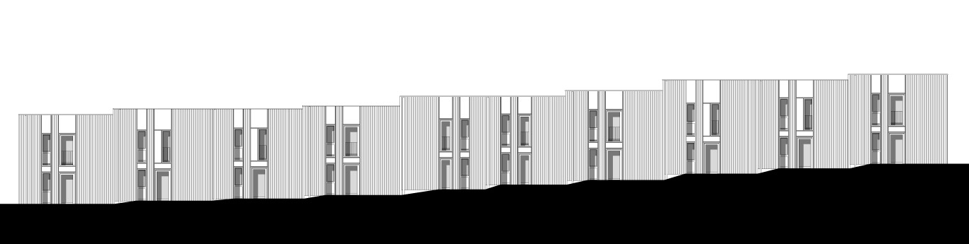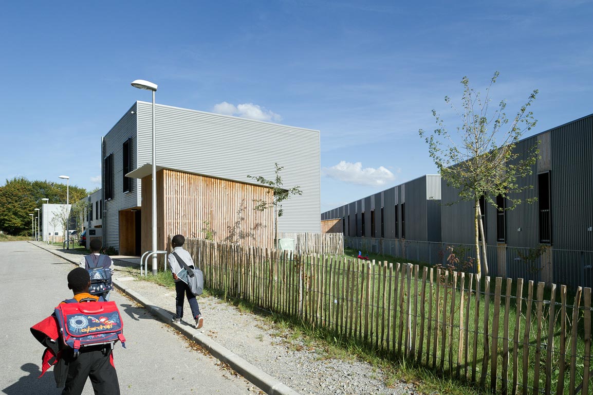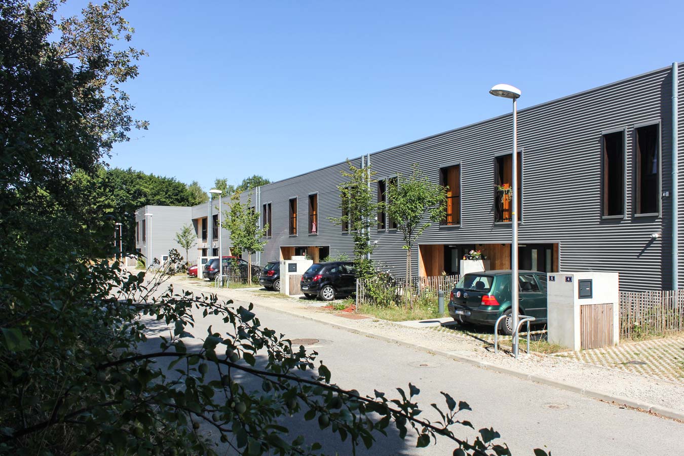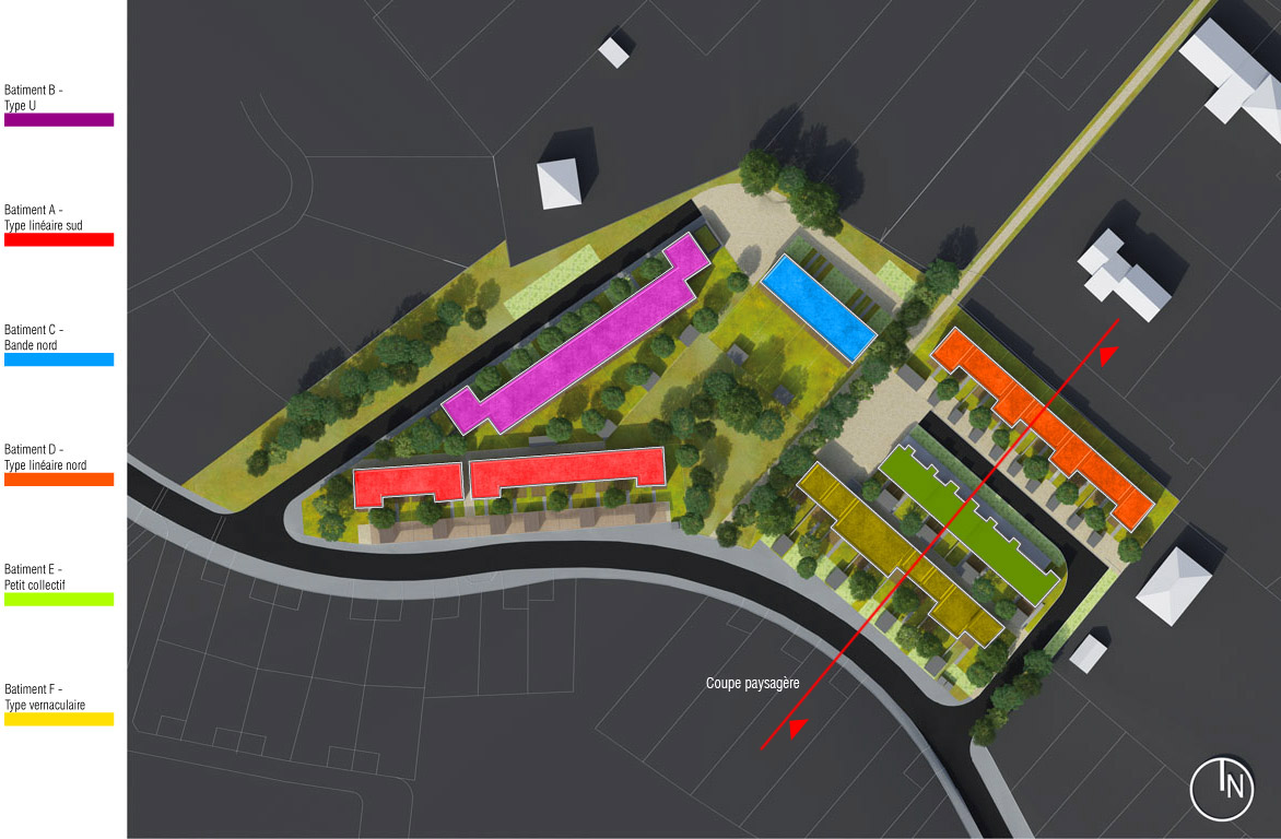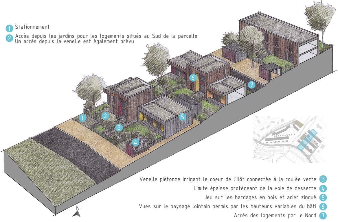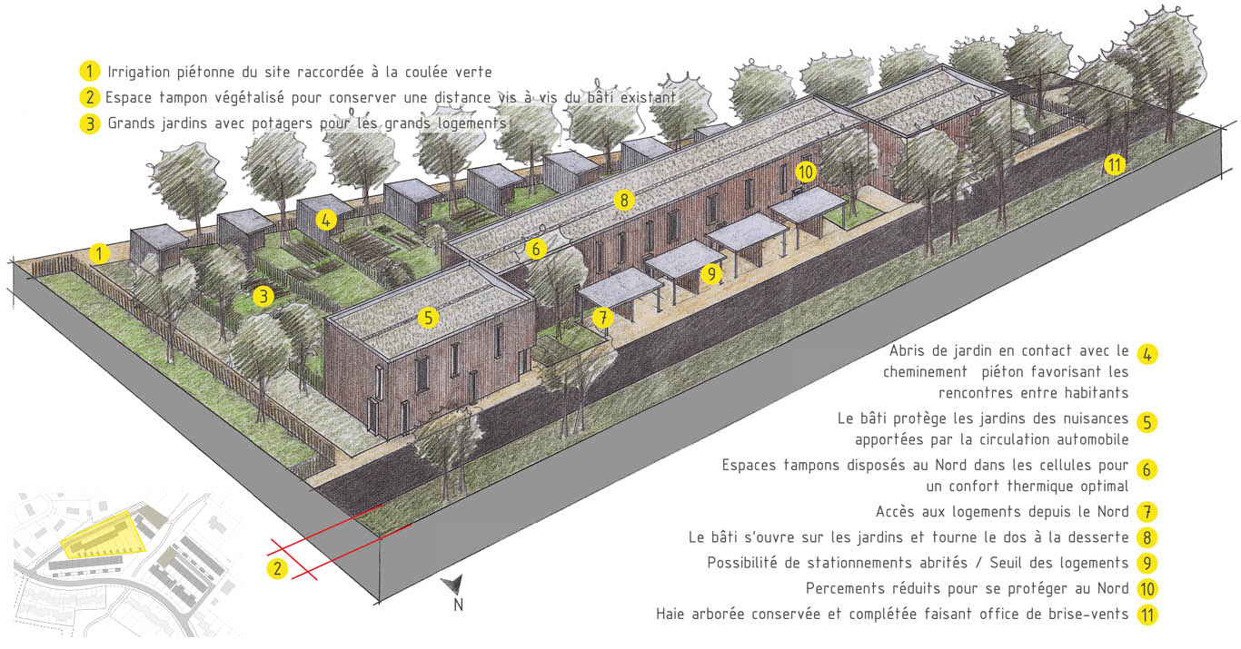 Plusieurs figures bâties composent le projet : figure linéaire, figures en U, figures à étagement, figure dite « vernaculaire ». Assemblées entre elles, les ensembles bâtis ménagent des interstices ou des creux, occupés soit par des jardins privatifs qui prolongent systématiquement les rez-de-chaussée des habitations, soit par des parcours piétons favorisant les occasions de rencontres fortuites entre habitants tout en permettant très concrètement l’accès aux jardins privatifs et à leurs abris.