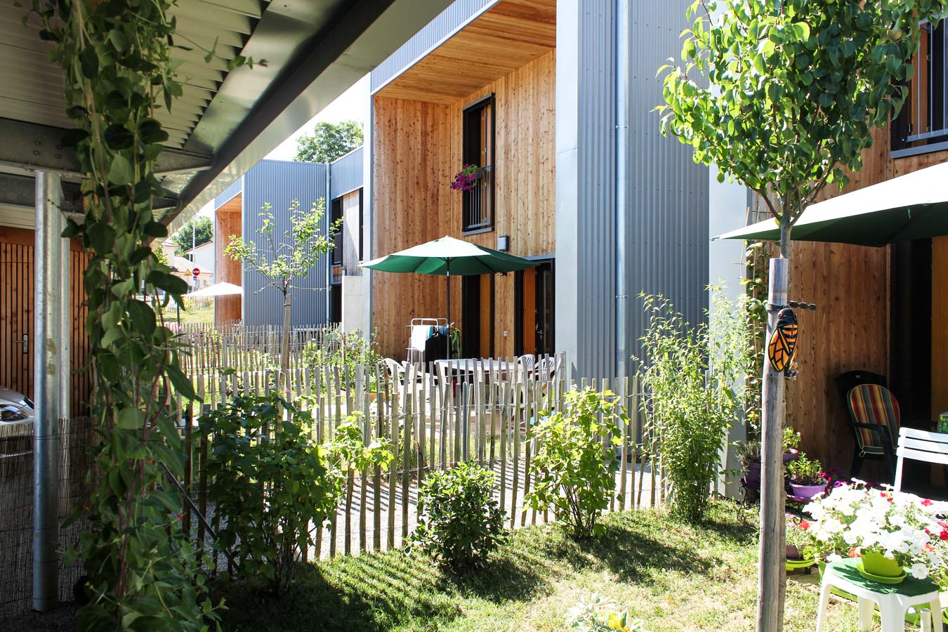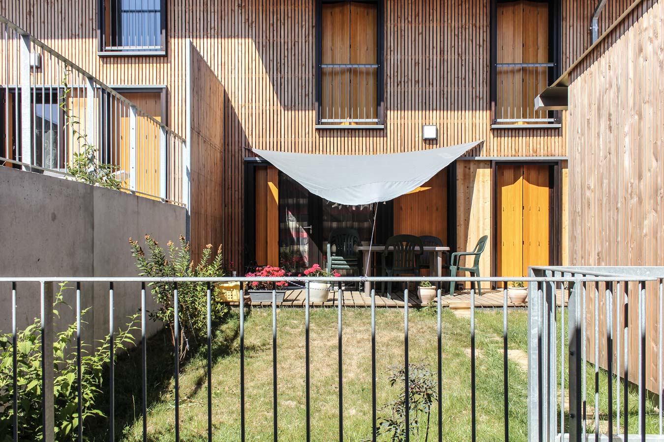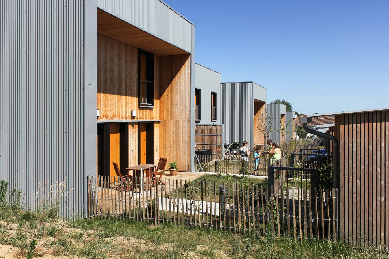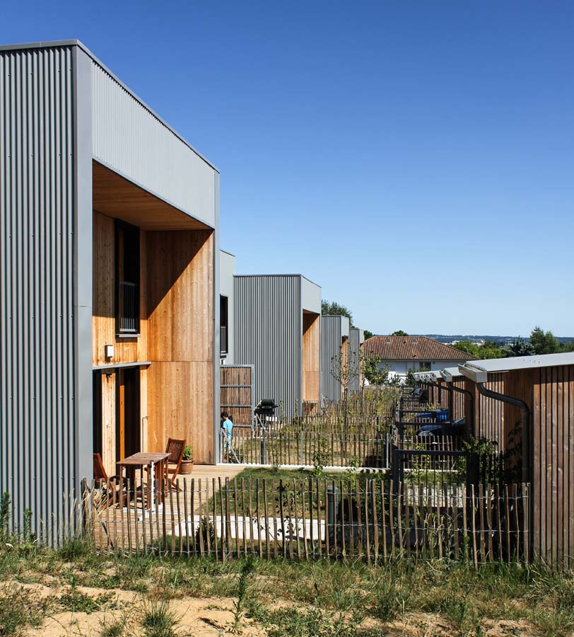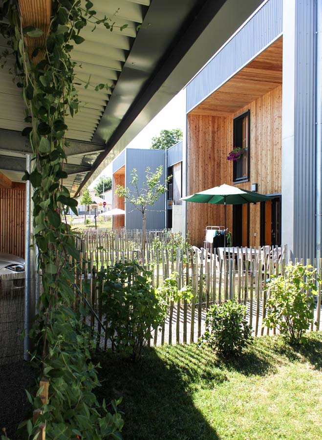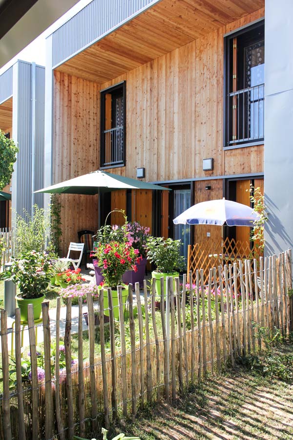 Une attention particulière a été apportée à l’intimité des jardins privatifs, considérés comme des « pièces extérieures » munies de terrasses en bois, de plantations et de clôtures girondines, avant la mise en location des habitations. Les ruptures de pente entre jardinets sont traitées par des murets de soutènement qui prolongent les formes bâties des habitations implantées selon une logique d’étagement.