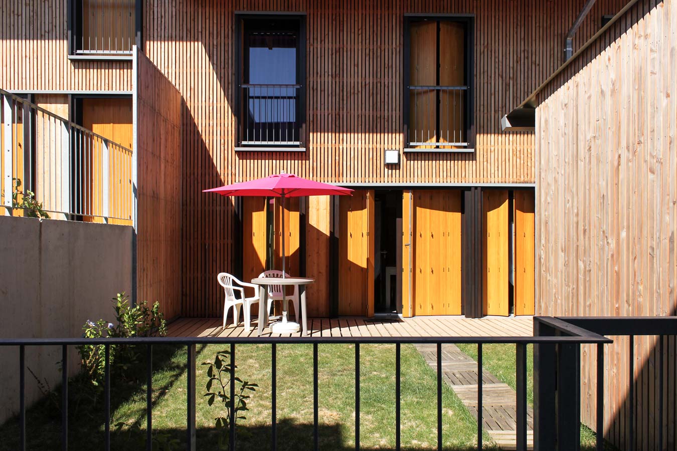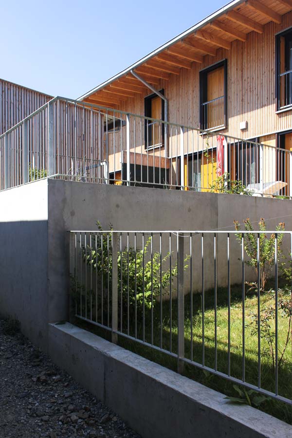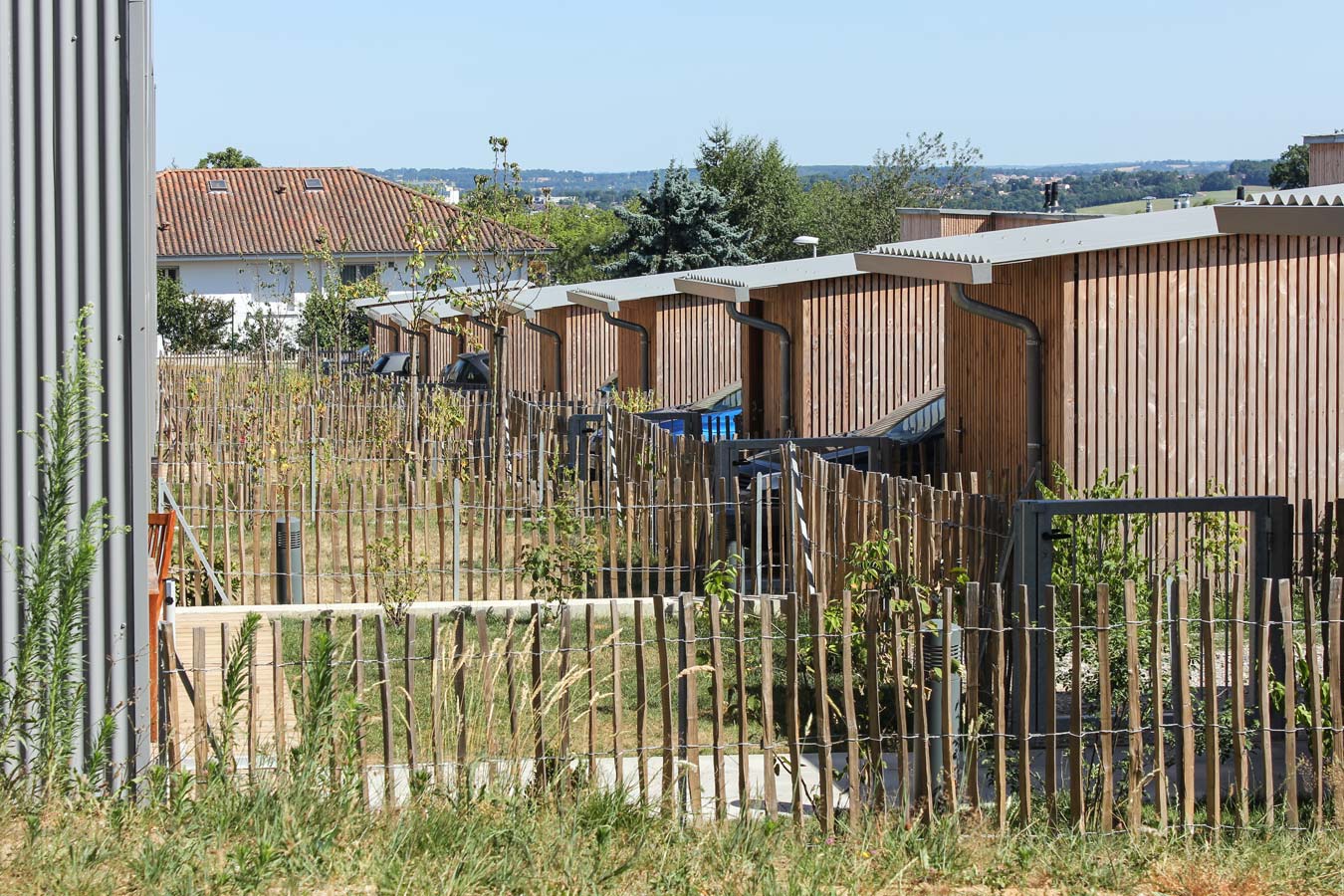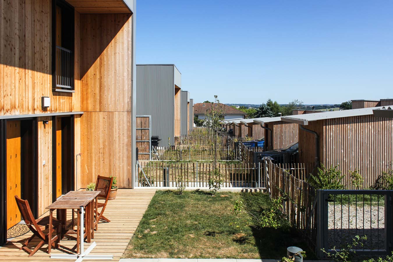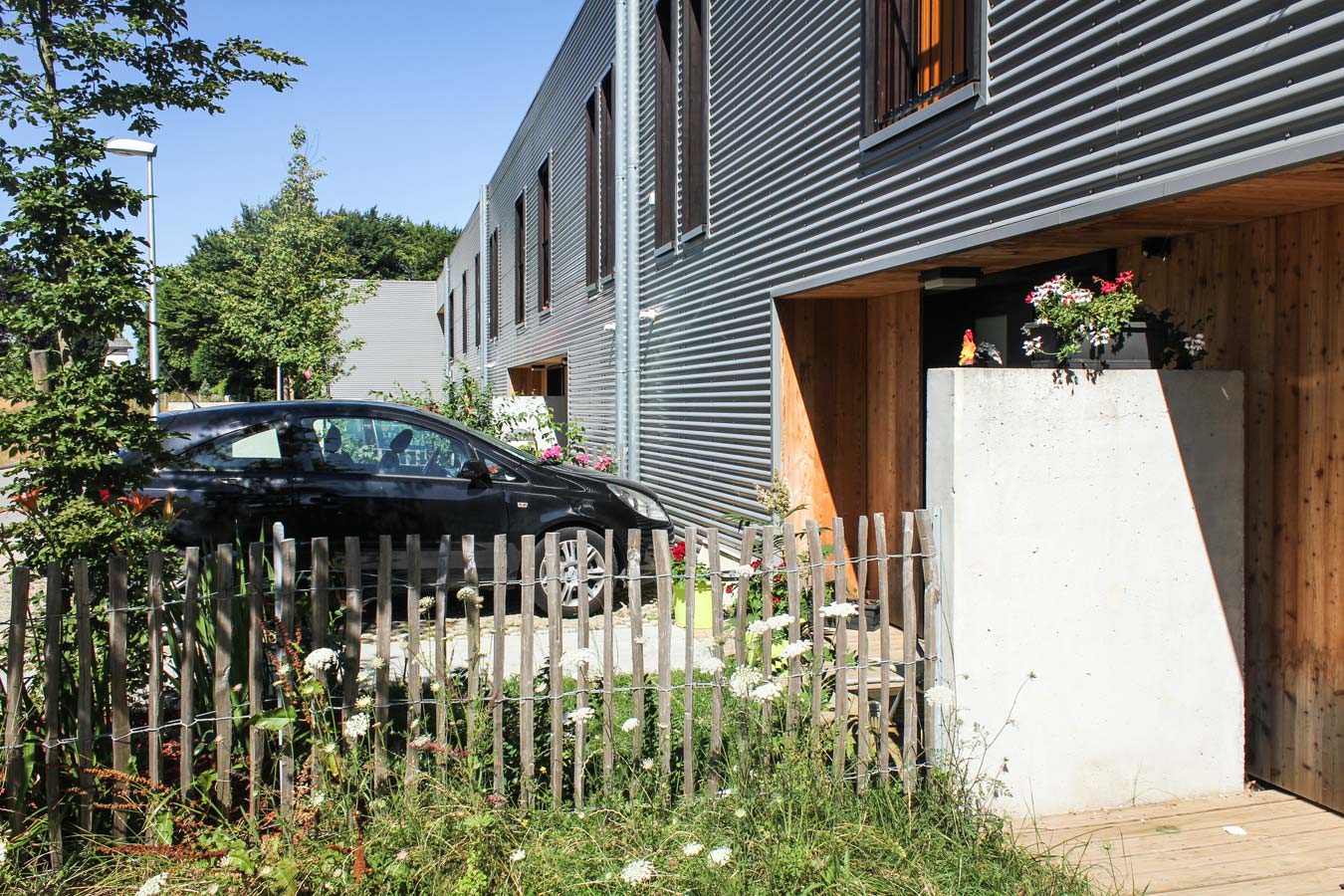Une attention particulière a été apportée à l’intimité des jardins privatifs, considérés comme des « pièces extérieures » munies de terrasses en bois, de plantations et de clôtures girondines, avant la mise en location des habitations. Les ruptures de pente entre jardinets sont traitées par des murets de soutènement qui prolongent les formes bâties des habitations implantées selon une logique d’étagement.
