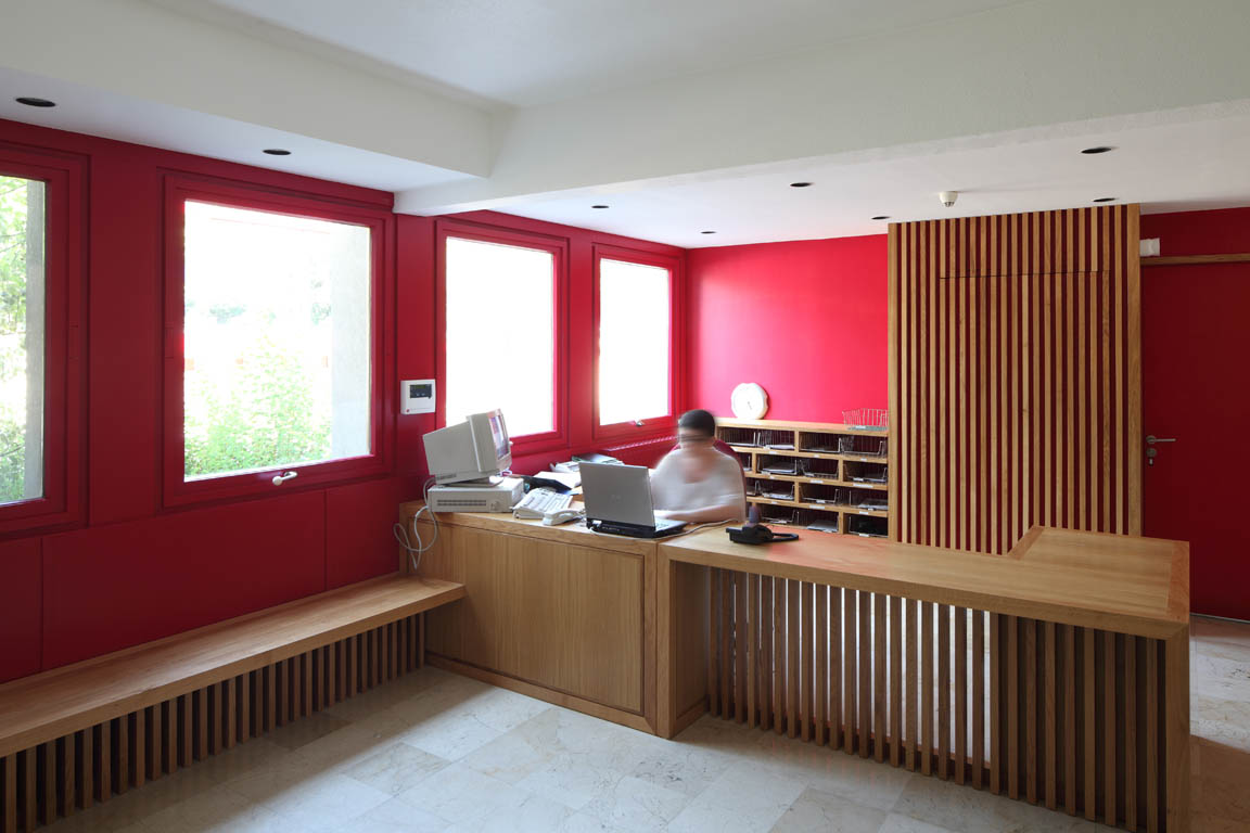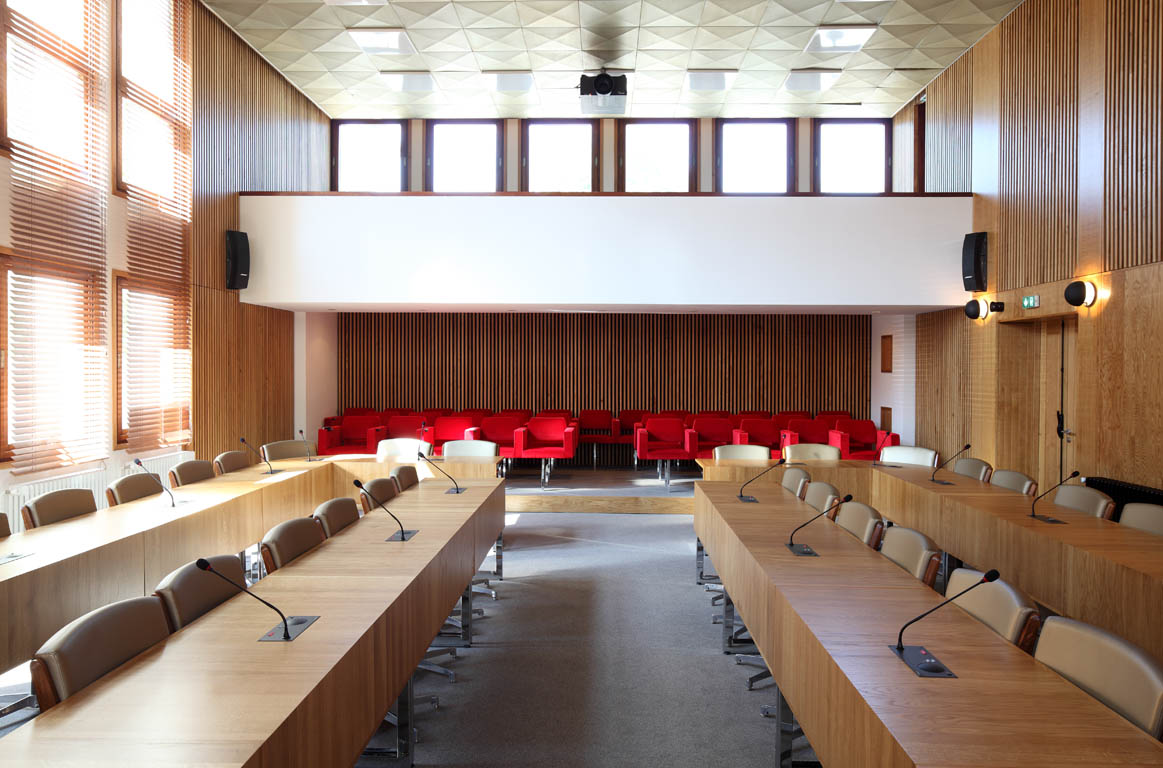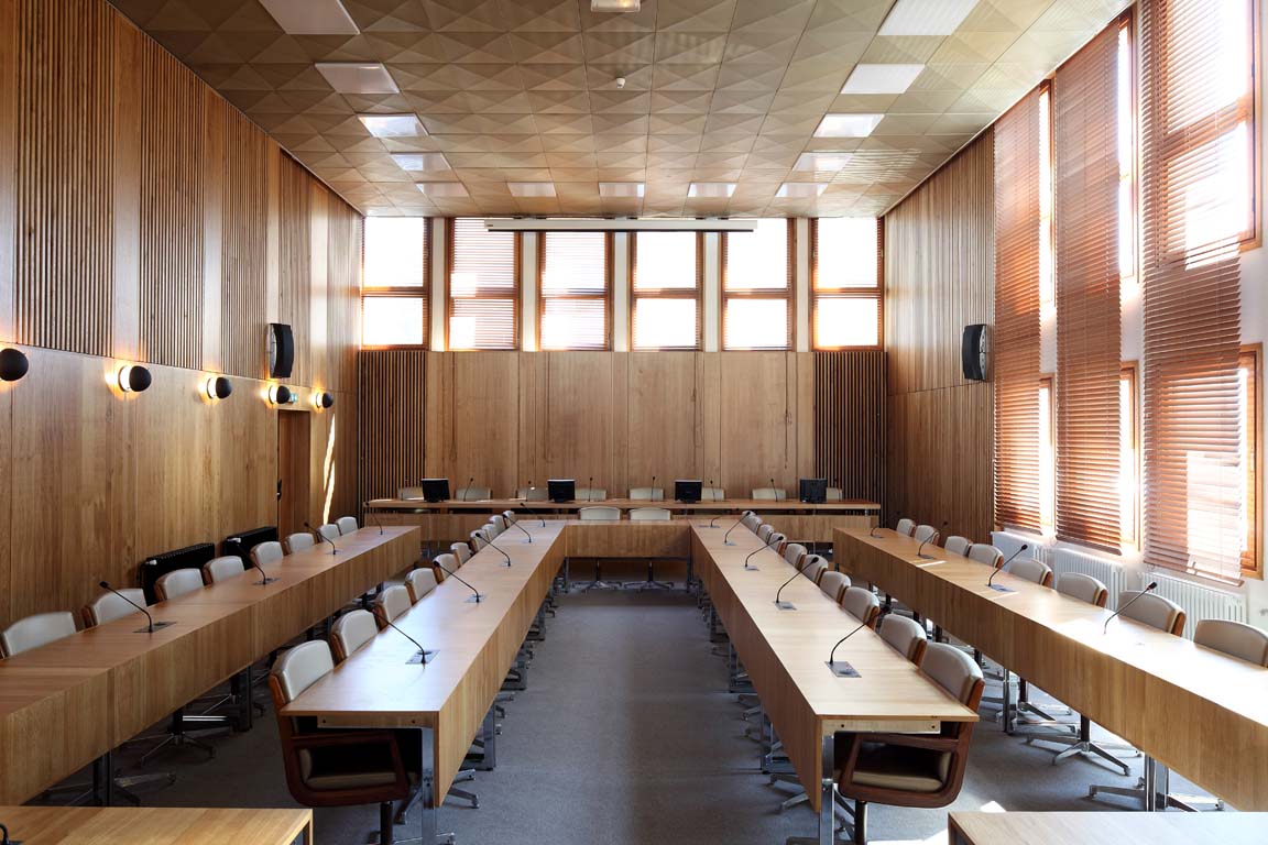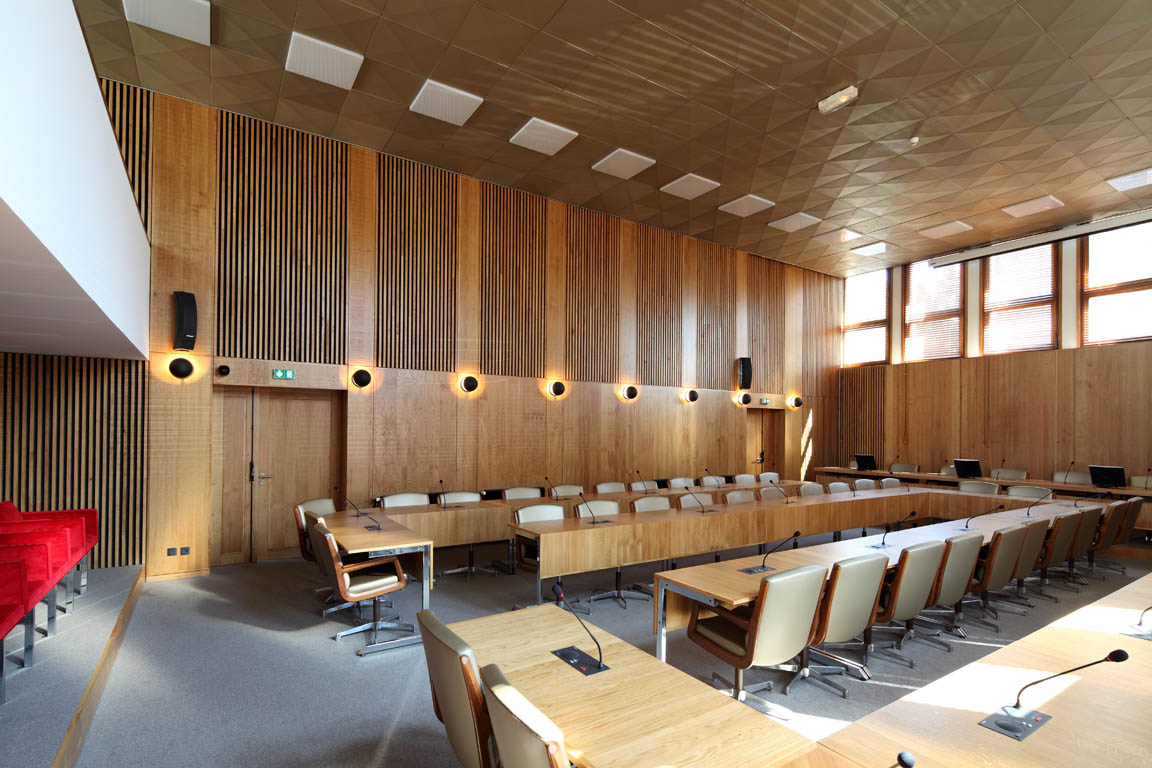 Le projet comprend la réalisation d’une rampe d’accès pour les personnes à mobilité réduites, la rénovation de l’accueil et de la salle des sessions. La rampe d’accès, très sobre, en béton banché et béton balayé blancs se déploie le long de la façade existante. L’accueil était situé dans un bureau vitré fermé sur l’espace de circulation, il est aujourd’hui ouvert sur le hall. Il a été pensé comme un grand meuble qui se déploie depuis la salle des sessions. Le mobilier (banque d’accueil, banc, meuble de tri du courrier, étagères) et les habillages en bois ont été entièrement dessinés par nos soins. La salle des sessions est une grande salle de réunion confortable et lumineuse, avec une belle hauteur sous plafond. La disposition originelle a été conservée pour accueillir des sessions de 90 personnes. Pour conserver l’acoustique de la salle, un complexe composé d’une structure en bois, d’un isolant acoustique, et d’un feutre résilient a été mis en place sur les murs. Il est dissimulé par les façades en panneaux 3 plis et filtres en bois verticaux. Plutôt que de le remplacer, nous avons fait le choix de restaurer le mobilier existant, tables et fauteuils de belle manufacture. Un travail de collaboration avec M.Roussille, tapissier, a permis de donner aux fauteuils de la salle et de la mezzanine une nouvelle vie. La structure métallique des bureaux a été conservée, les plateaux en bois ont été menuisés par l’entreprise Bouysse. Un système d’audio conférence y a été intégré. Enfin pour parfaire l’ambiance feutrée et chaleureuse de la salle, des stores en bois ont été installé sur les grandes baies vitrées.