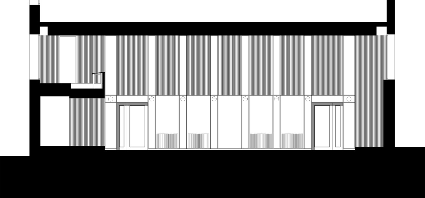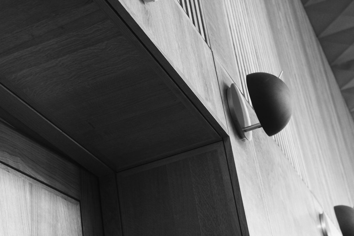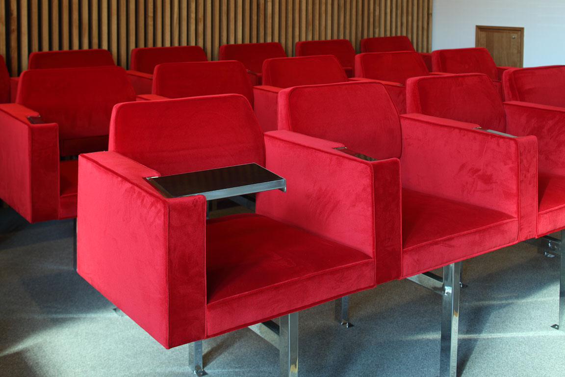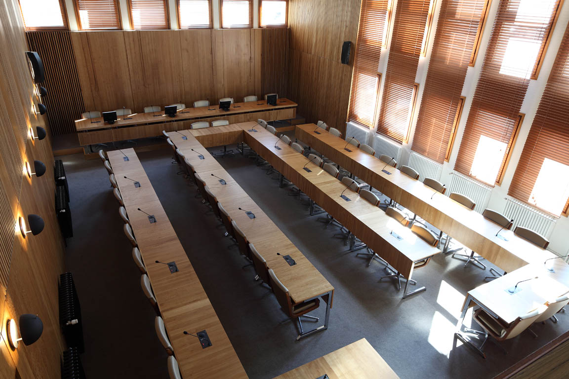 Le projet comprend la réalisation d’une rampe d’accès pour les personnes à mobilité réduites, la rénovation de l’accueil et de la salle des sessions. La rampe d’accès, très sobre, en béton banché et béton balayé blancs se déploie le long de la façade existante. L’accueil était situé dans un bureau vitré fermé sur l’espace de circulation, il est aujourd’hui ouvert sur le hall. Il a été pensé comme un grand meuble qui se déploie depuis la salle des sessions. Le mobilier (banque d’accueil, banc, meuble de tri du courrier, étagères) et les habillages en bois ont été entièrement dessinés par nos soins. La salle des sessions est une grande salle de réunion confortable et lumineuse, avec une belle hauteur sous plafond. La disposition originelle a été conservée pour accueillir des sessions de 90 personnes. Pour conserver l’acoustique de la salle, un complexe composé d’une structure en bois, d’un isolant acoustique, et d’un feutre résilient a été mis en place sur les murs. Il est dissimulé par les façades en panneaux 3 plis et filtres en bois verticaux. Plutôt que de le remplacer, nous avons fait le choix de restaurer le mobilier existant, tables et fauteuils de belle manufacture. Un travail de collaboration avec M.Roussille, tapissier, a permis de donner aux fauteuils de la salle et de la mezzanine une nouvelle vie. La structure métallique des bureaux a été conservée, les plateaux en bois ont été menuisés par l’entreprise Bouysse. Un système d’audio conférence y a été intégré. Enfin pour parfaire l’ambiance feutrée et chaleureuse de la salle, des stores en bois ont été installé sur les grandes baies vitrées.