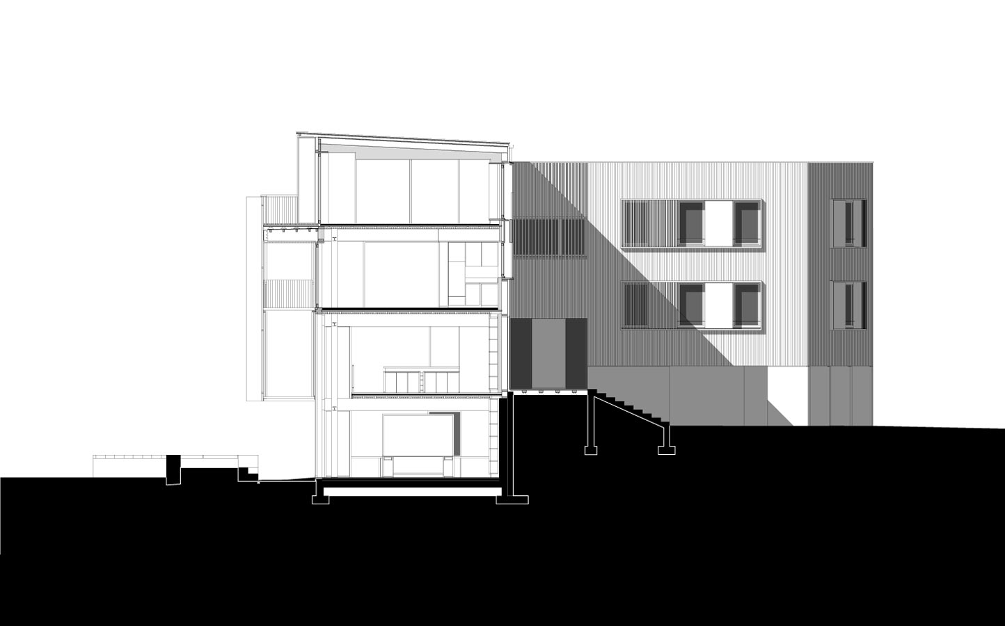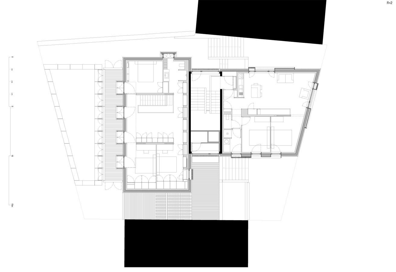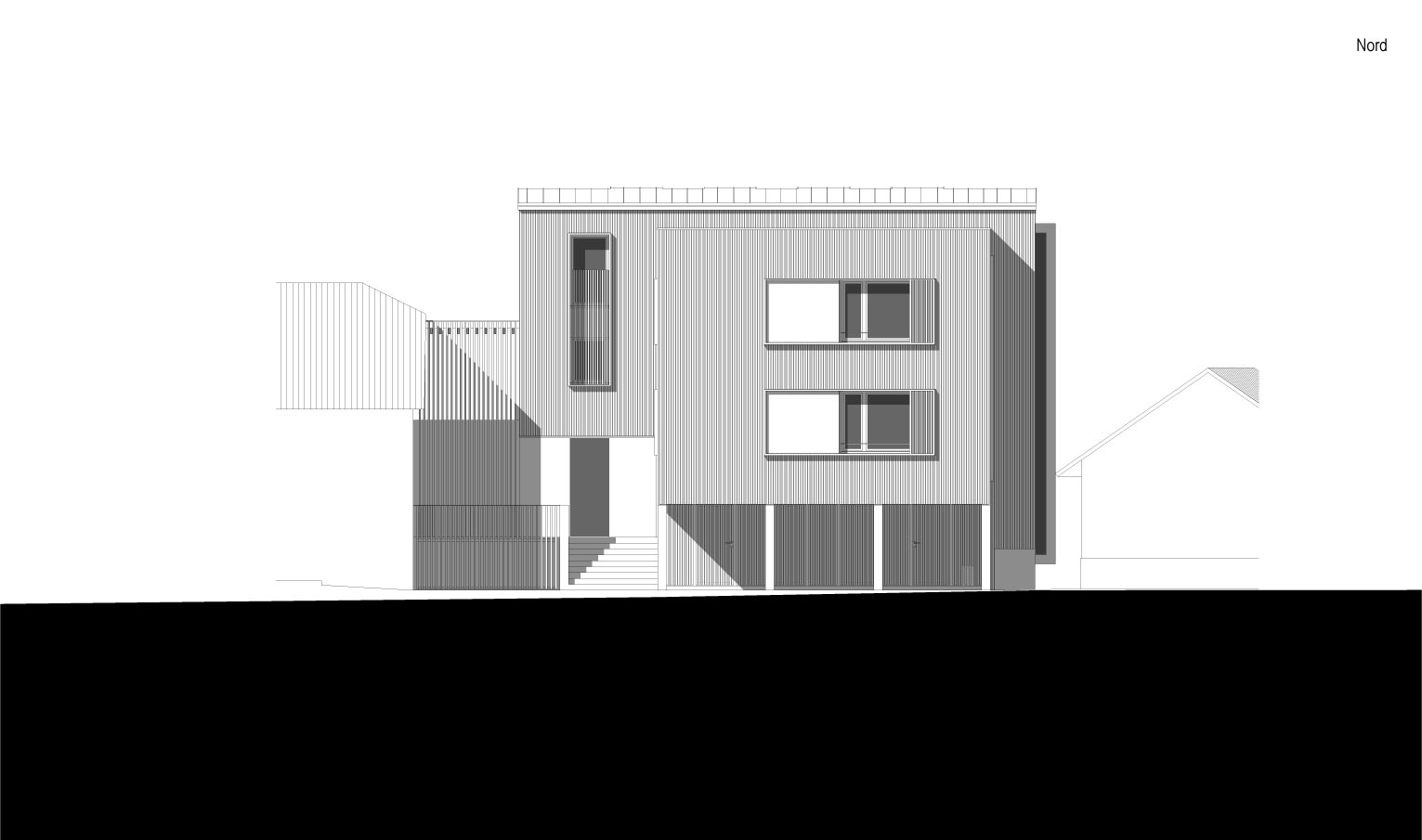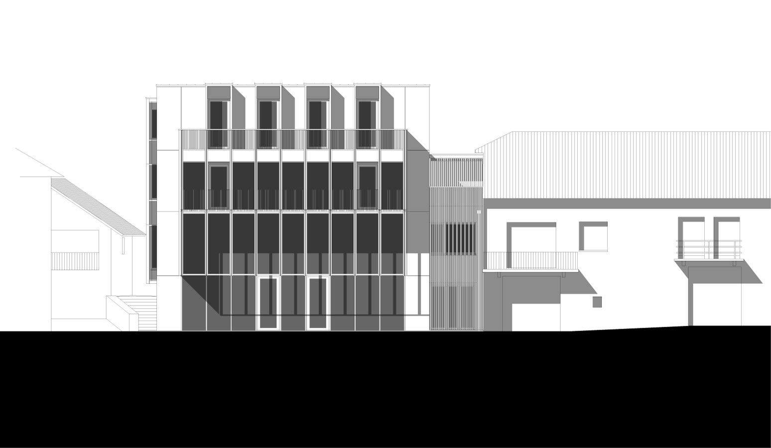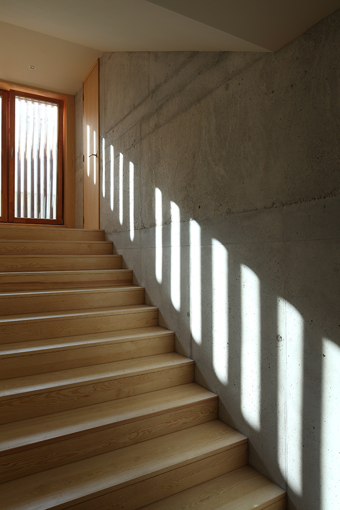L’élévation sud se distingue des autres, tout comme les façades principales et hiérarchisées des bâtiments historiques du Rouget se différencient des autres par des compositions symétriques classiques. Ici, pour autant, la façade sud abandonne les logiques de composition conventionnelles pour exprimer la volonté de capter l’énergie solaire à certains moments, de s’en protéger à d’autres, de vivre et de comprendre la course du soleil et de faire l’expérience du cosmos.