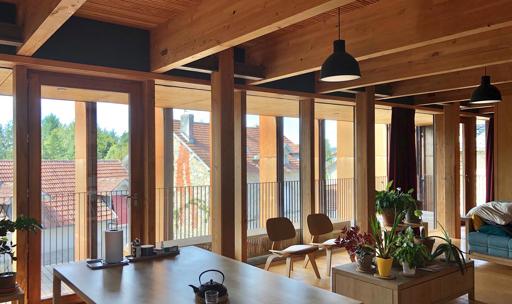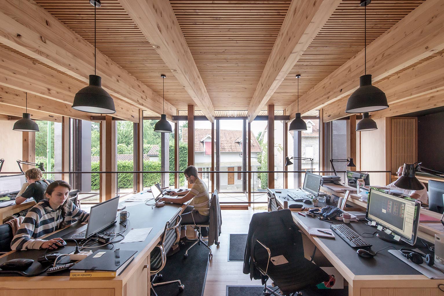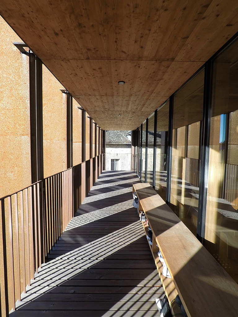 Le douglas est utilisé pour la structure, les bardages, les platelages et lattages. L’abattage et le débardage ont été réalisés par une entreprise forestière du Rouget, les billes de douglas débitées en Corrèze, les pièces de lamellé-collé assemblées en Aveyron, les charpentes montées par une entreprise locale. Le projet explore ainsi les possibilités offertes par les logiques de circuits courts.