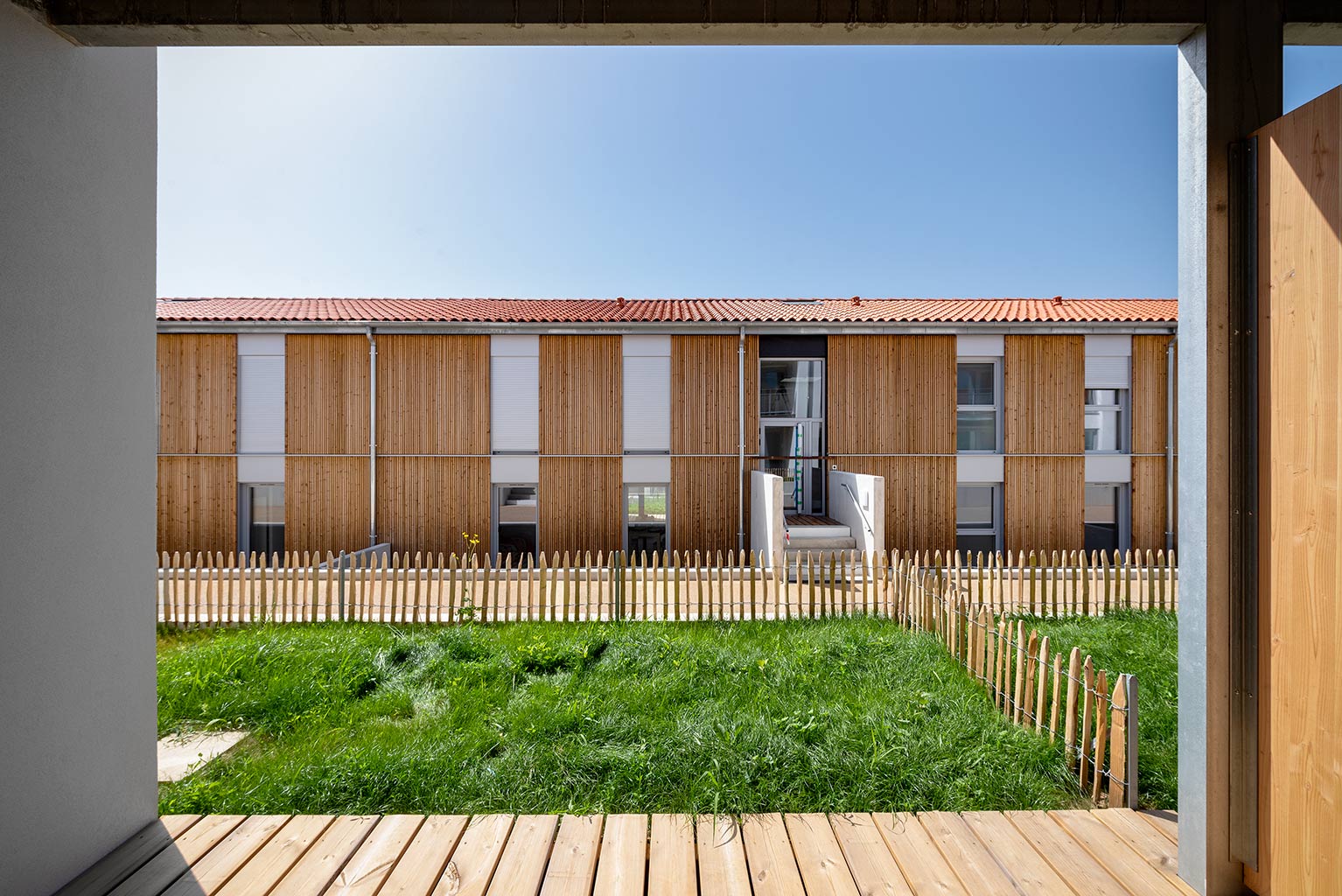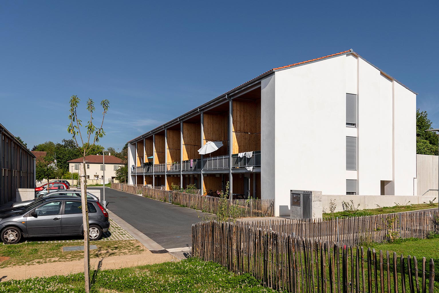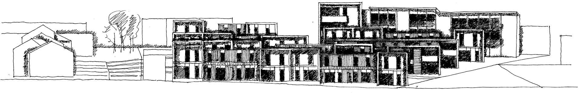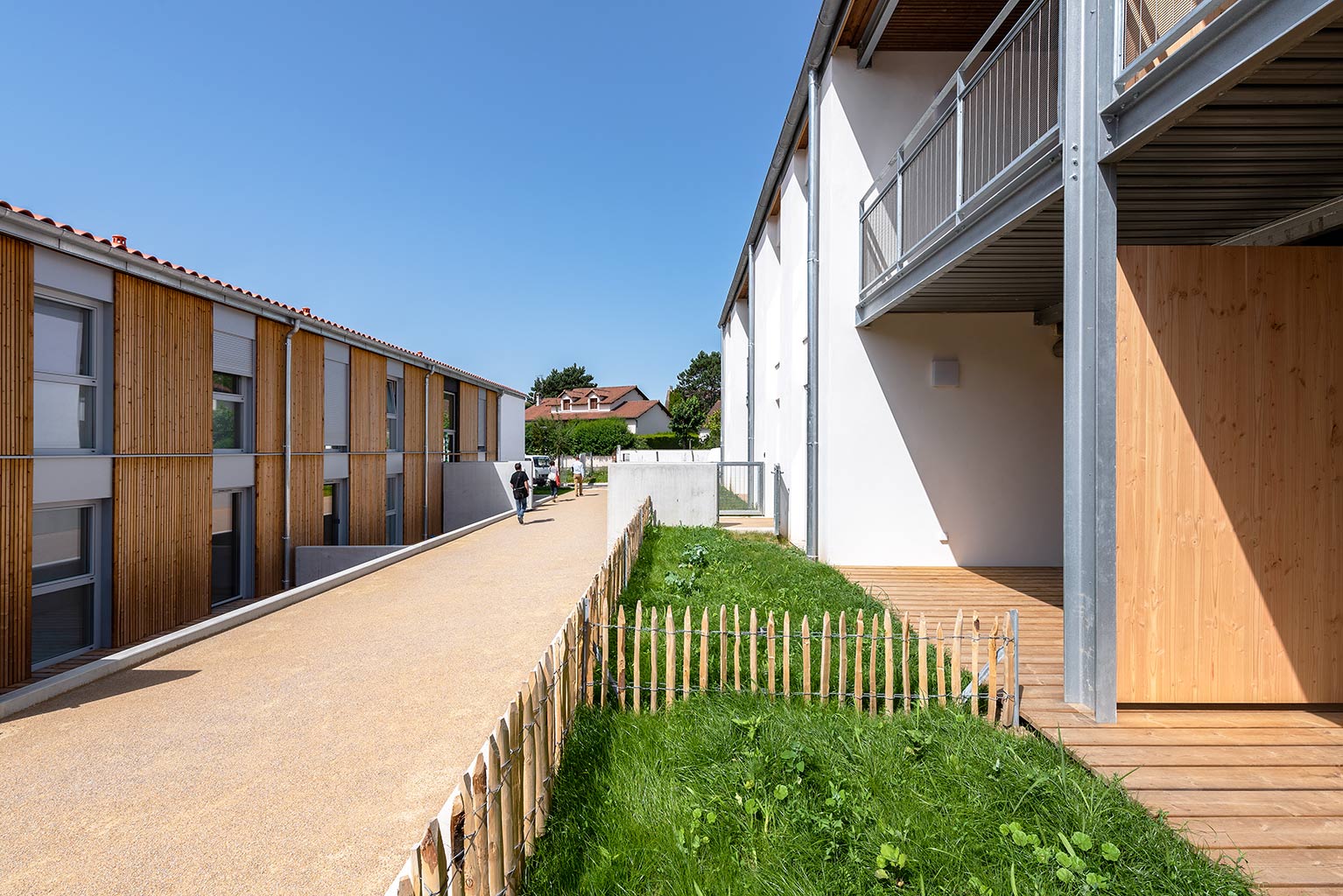 Les deux immeubles du milieu proposent des logements intergénérationnels et accueillent, au RDC, des couples de personnes âgées dont l’un des membres présente des troubles de la maladie d’Alzheimer. Appartenant à la Mutualité Française Limousine, la maison de retraite contiguë propose un service d’accompagnement de ces personnes à domicile.