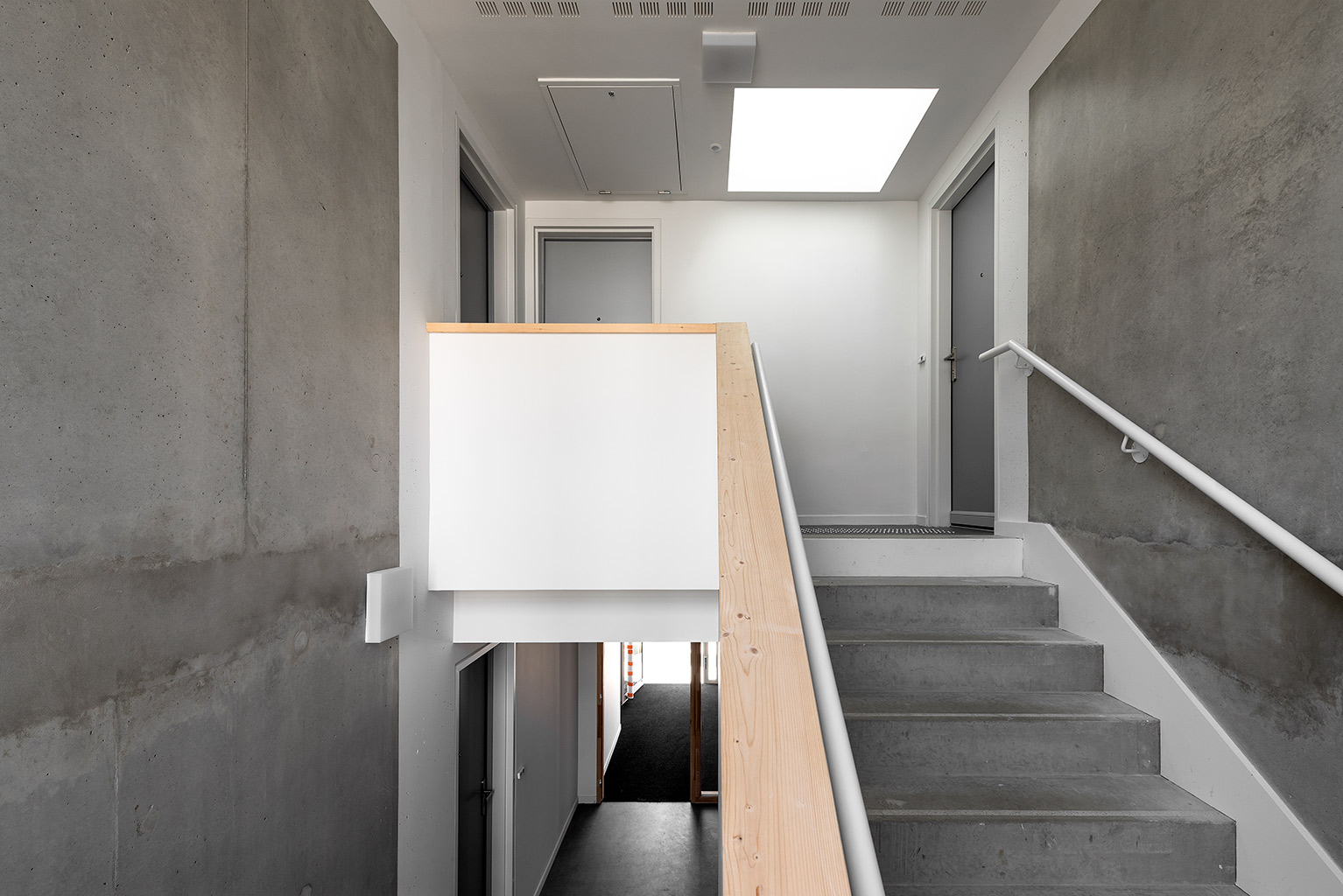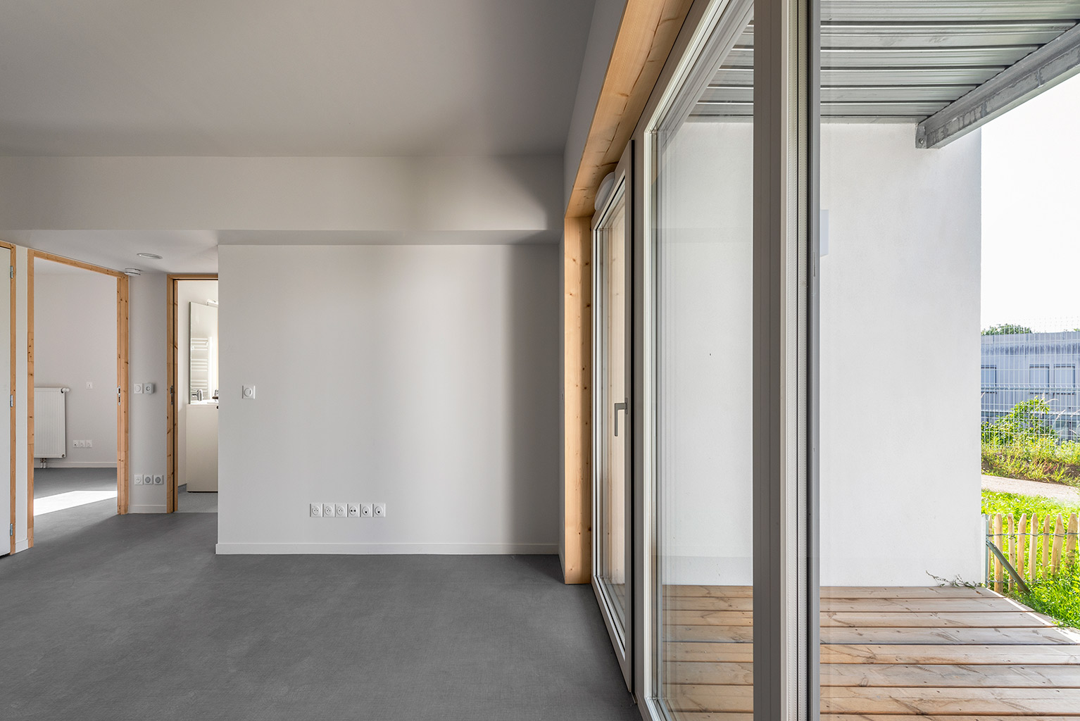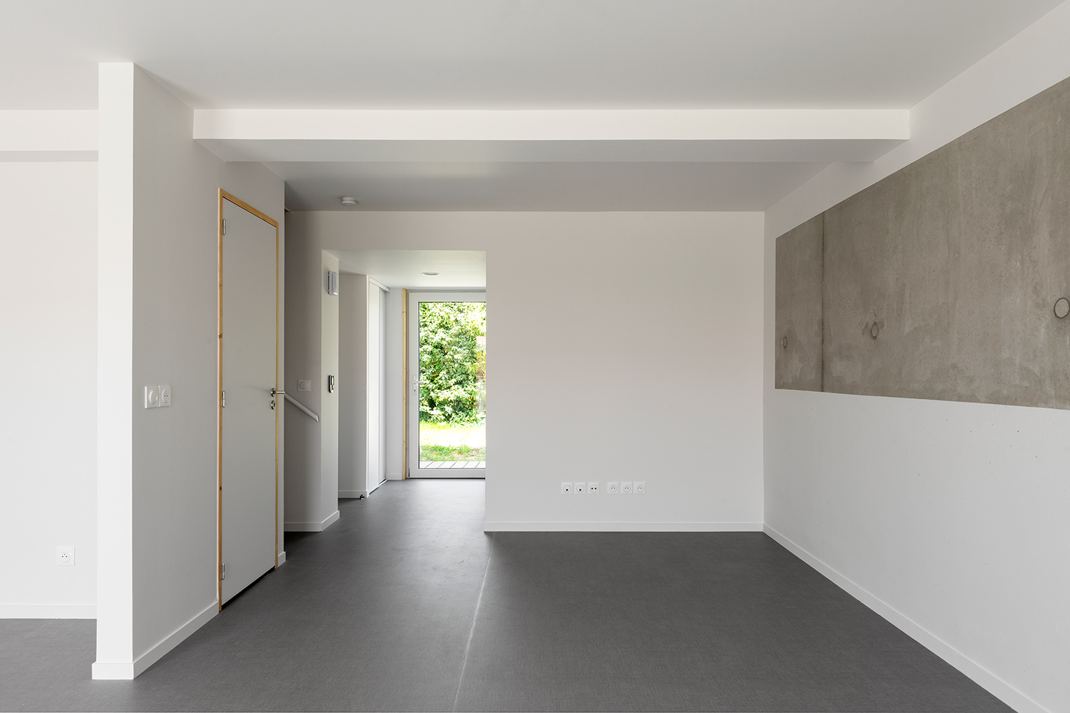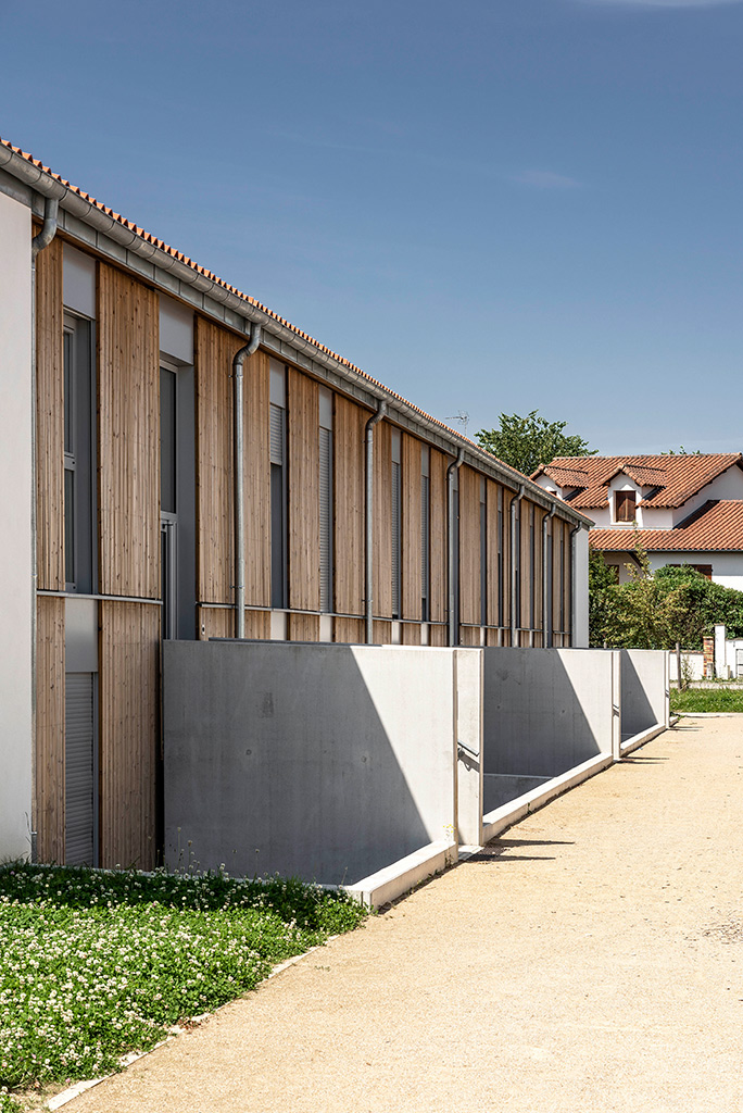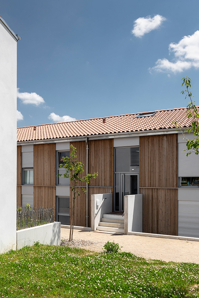 L’architecture est caractérisée par des murs en briques creuses enduites à la chaux de Saint Astier, et des murs à ossature bois recouverts de bardage en douglas pré grisé. Les menuiseries bois-alu sont à triple vitrage. La performance thermique atteinte est 50% supérieure à la RT 2012.