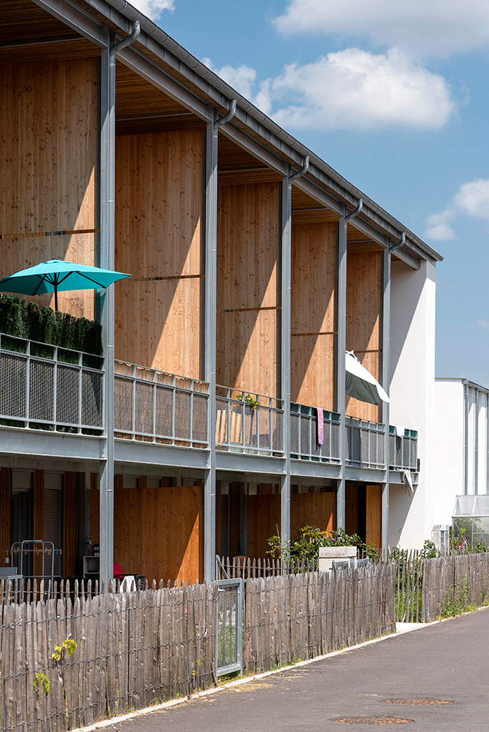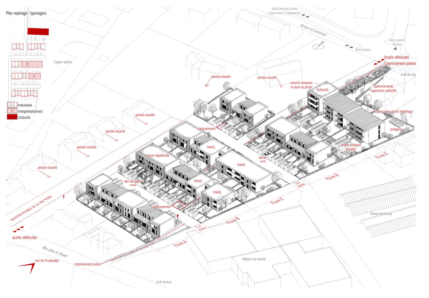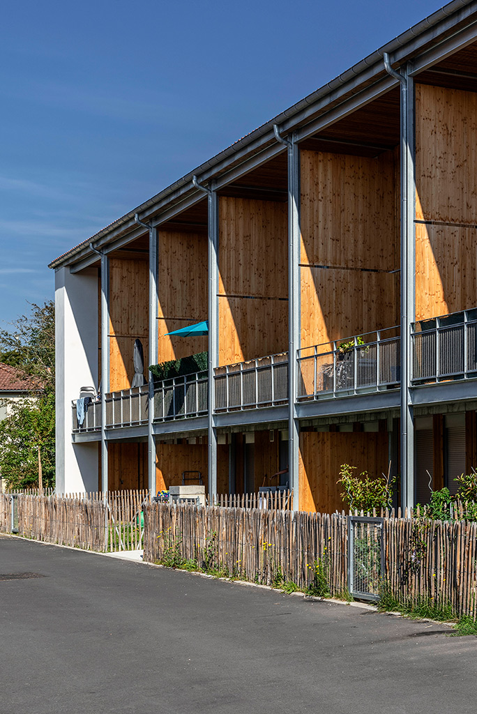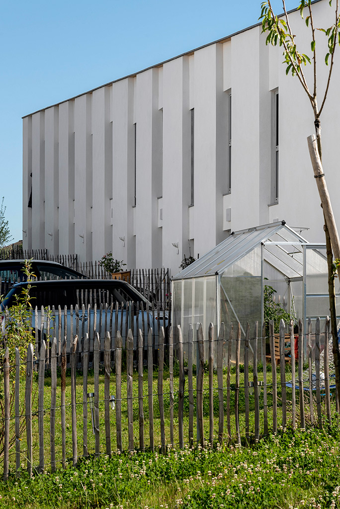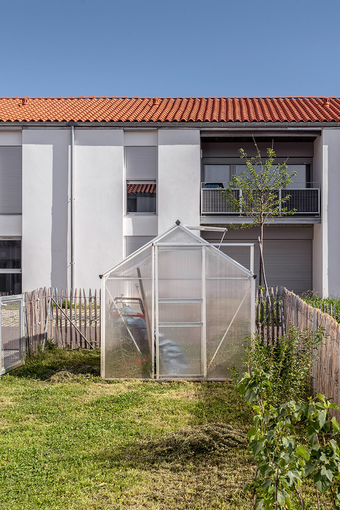 Les cinq bâtiments d’habitation sont reliés par une seule voie à sens unique, limitée à 30 km/h, laquelle chemine entre les figures bâties. Deux cours urbaines distribuent les logements. Deux des cinq figures bâties regroupent des maisons accolées de type 4 ou 5. Les trois autres édifices sont des immeubles collectifs. Une grande diversité de typologie est proposée dont des duplex de type 4 avec loggias individuelles.