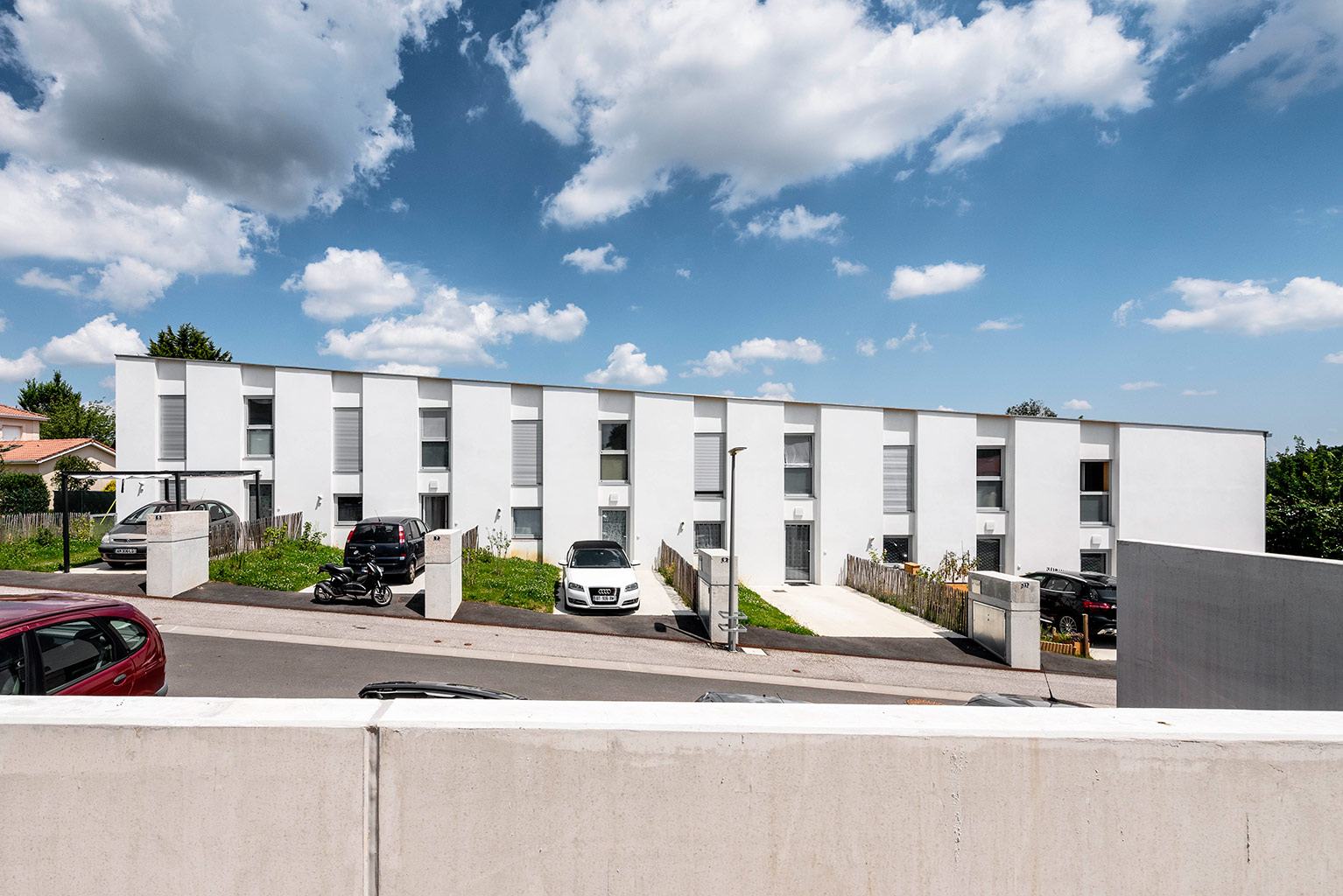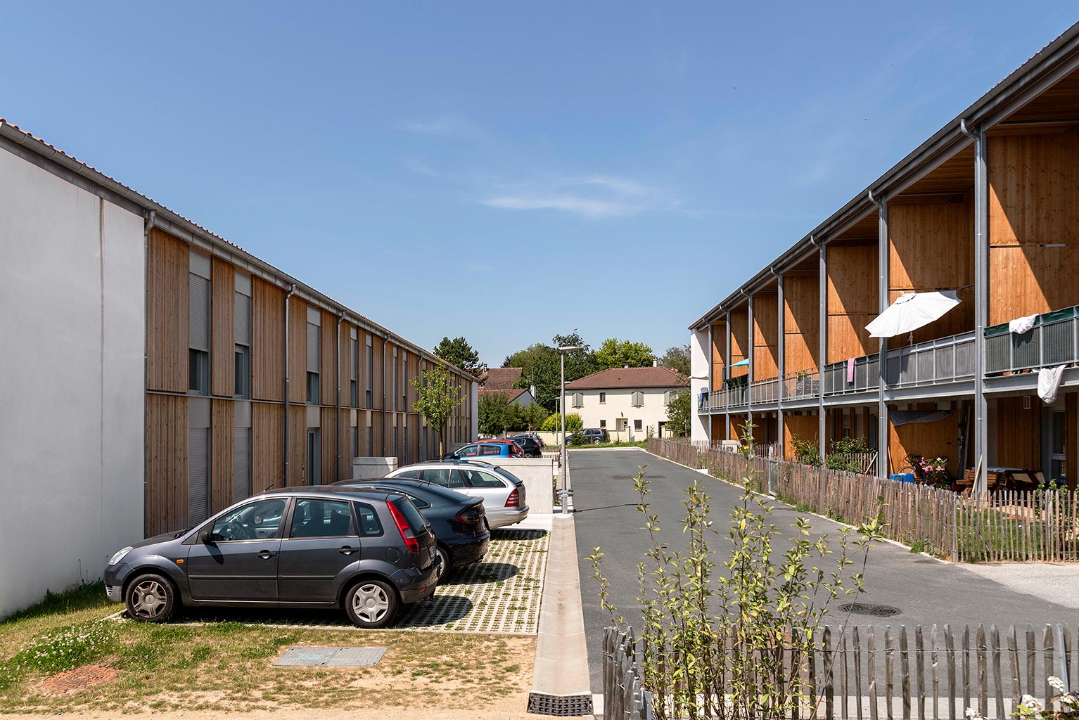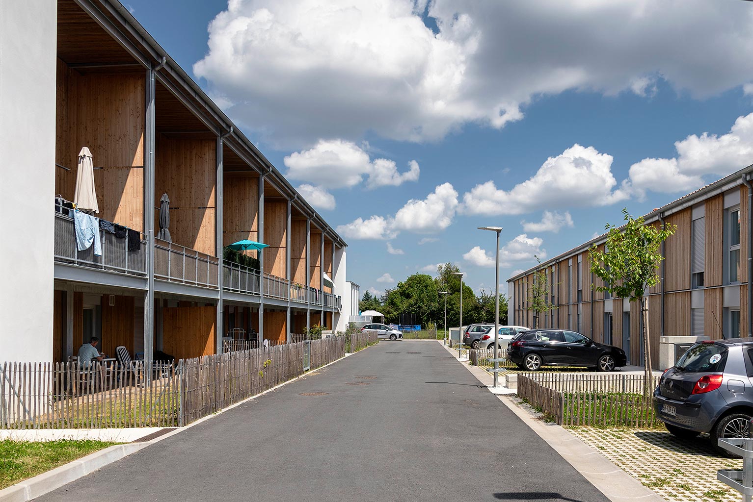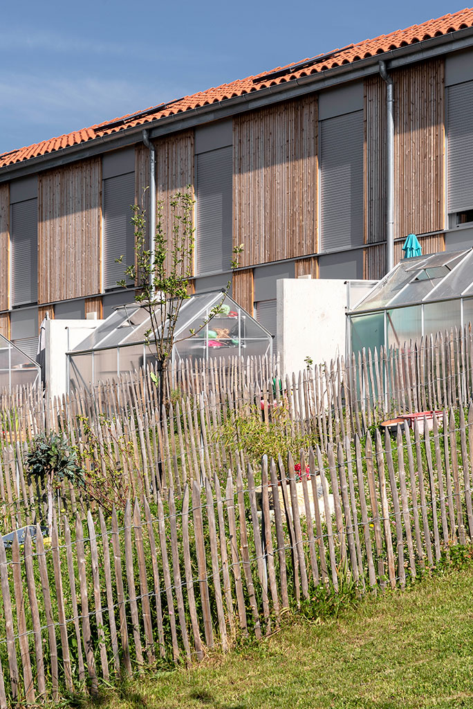 Les cinq bâtiments d’habitation sont reliés par une seule voie à sens unique, limitée à 30 km/h, laquelle chemine entre les figures bâties. Deux cours urbaines distribuent les logements. Deux des cinq figures bâties regroupent des maisons accolées de type 4 ou 5. Les trois autres édifices sont des immeubles collectifs. Une grande diversité de typologie est proposée dont des duplex de type 4 avec loggias individuelles.