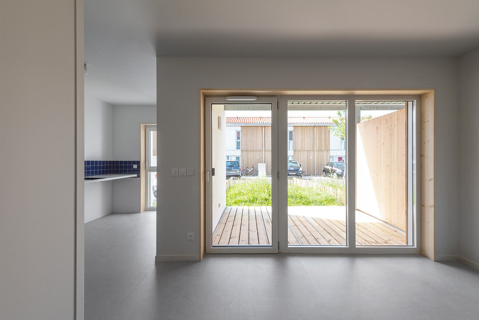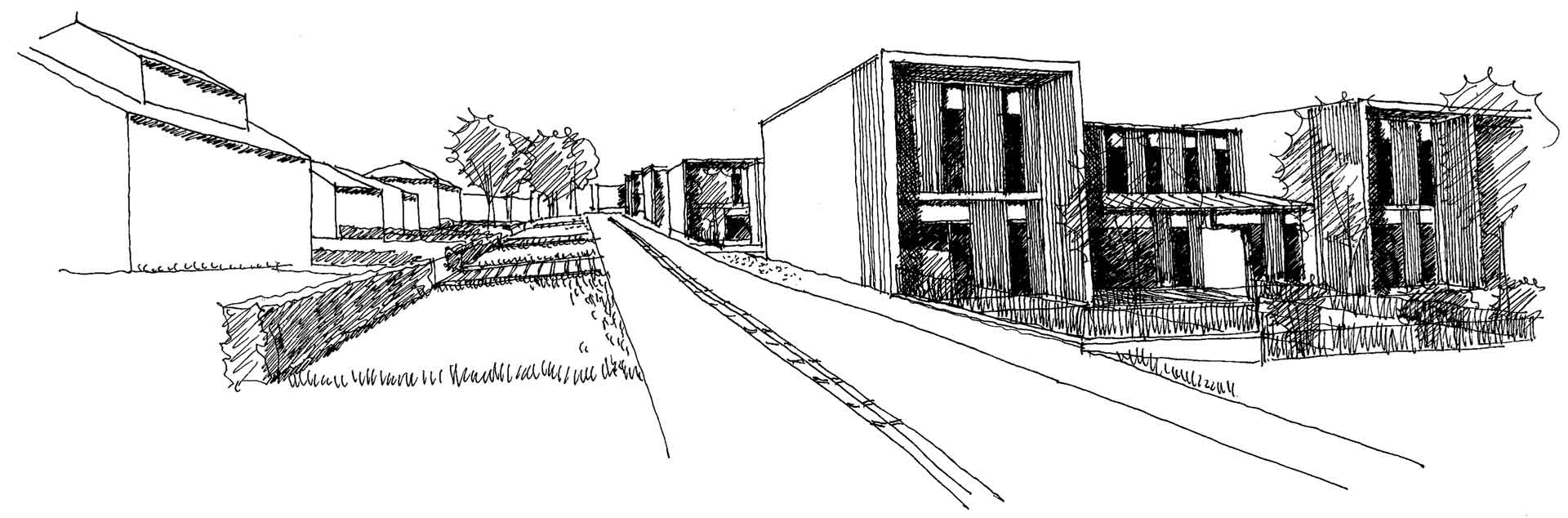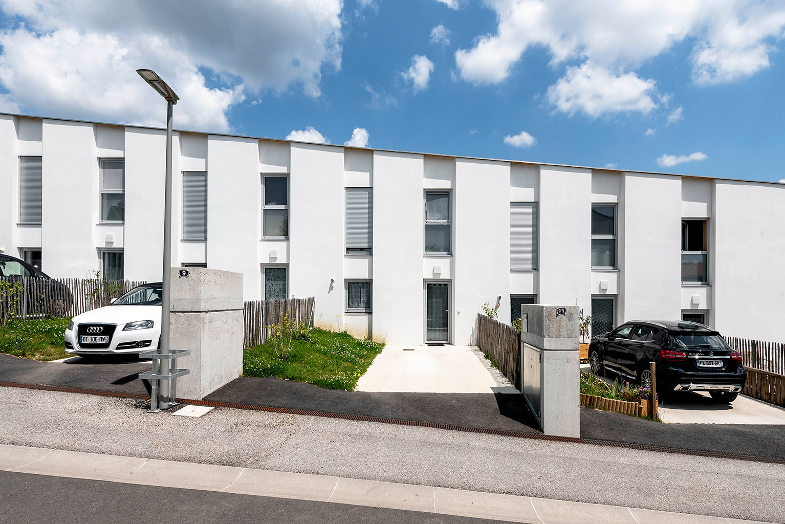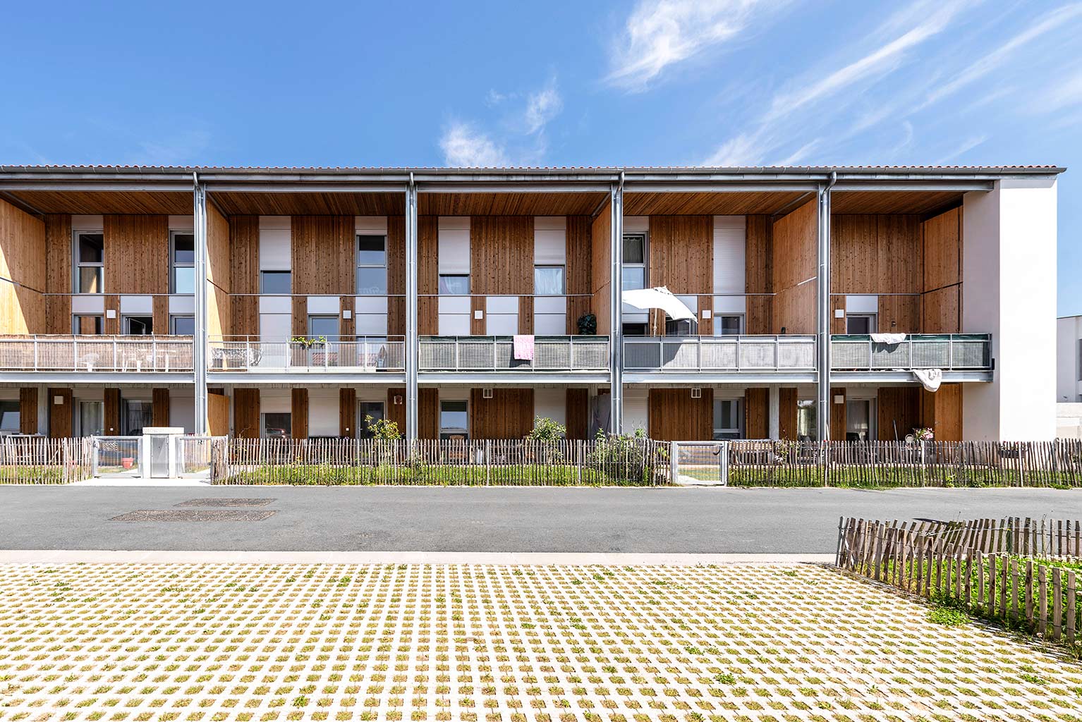Les cinq bâtiments d’habitation sont reliés par une seule voie à sens unique, limitée à 30 km/h, laquelle chemine entre les figures bâties. Deux cours urbaines distribuent les logements. Deux des cinq figures bâties regroupent des maisons accolées de type 4 ou 5. Les trois autres édifices sont des immeubles collectifs. Une grande diversité de typologie est proposée dont des duplex de type 4 avec loggias individuelles.