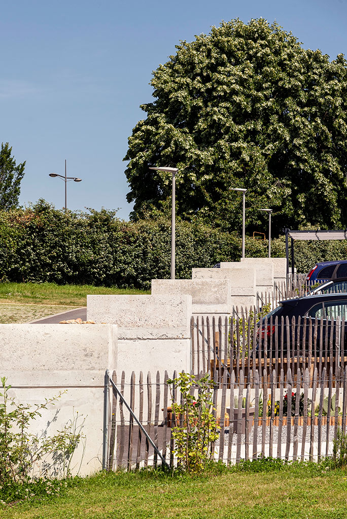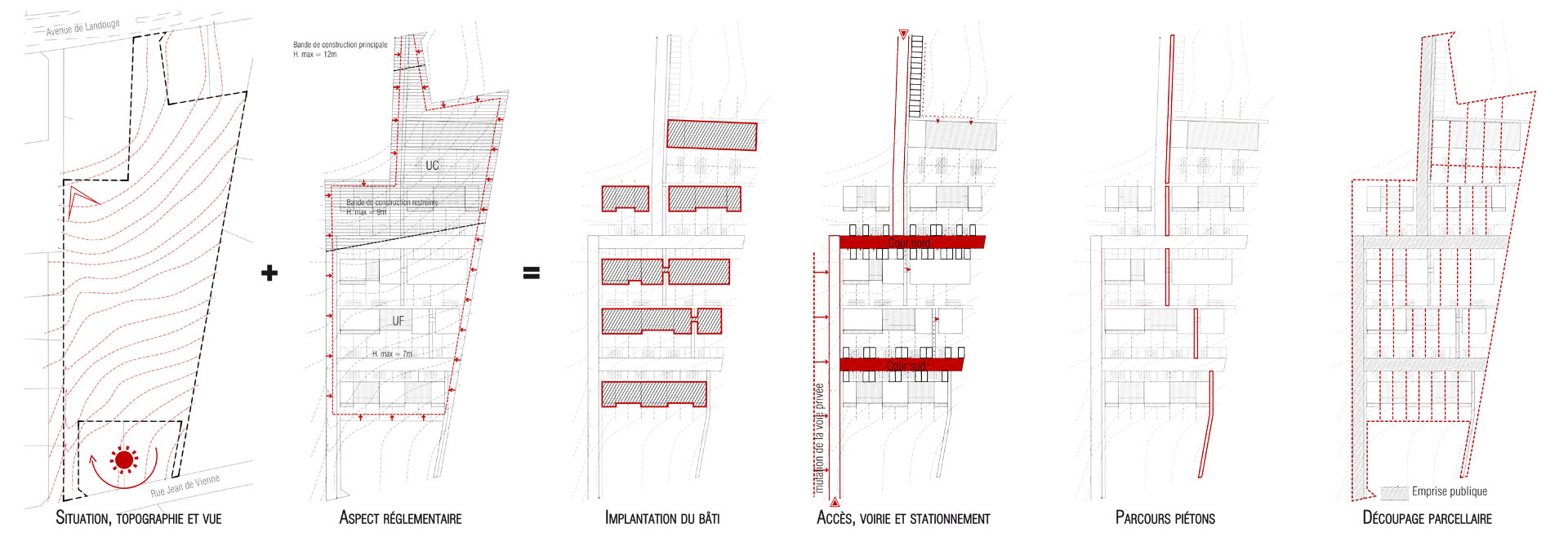 Le site est caractérisé par un dénivelé de 9m entre le nord (l’avenue de ) et le sud du terrain (la rue Jean de Vienne), dégageant des vues lointaines sur le paysage bocager de la vallée de l’Aurence. Cette situation est favorable à la mise en œuvre de principes bioclimatiques. Le bâti s’insère dans le site suivant cinq figures linéaires dont quatre sont parallèles aux courbes de niveaux. Les édifices s’étagent dans la pente selon une composition de densité croissante du sud vers le nord pour garantir de bonnes conditions d’ensoleillement et multiplier les vues depuis les étages.
