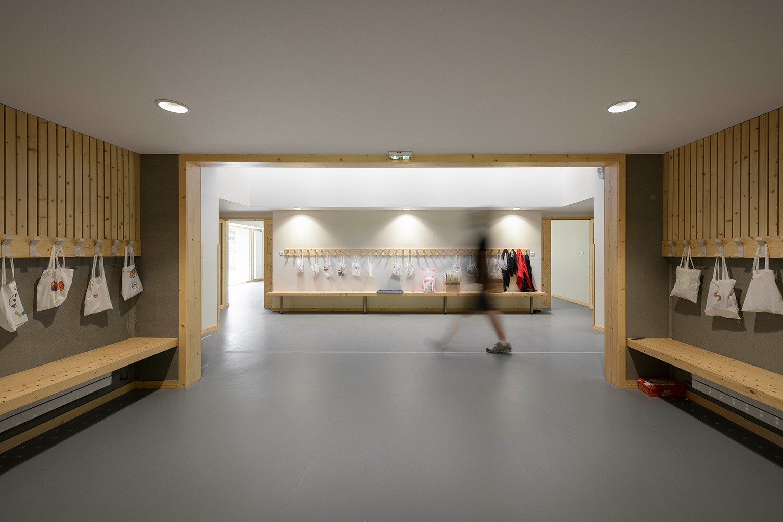 La salle polyvalente est positionnée en bordure de l’espace public, côté sud-ouest du site, afin de rendre possible un fonctionnement indépendant du reste de l’école. Elle s’ouvre sur le jardin d’entrée à l’est, où les activités extérieures peuvent se dérouler. Elle peut aussi s’agrandir à l’ouest, en ouvrant la cloison coulissante qui la sépare du bureau polyvalent.