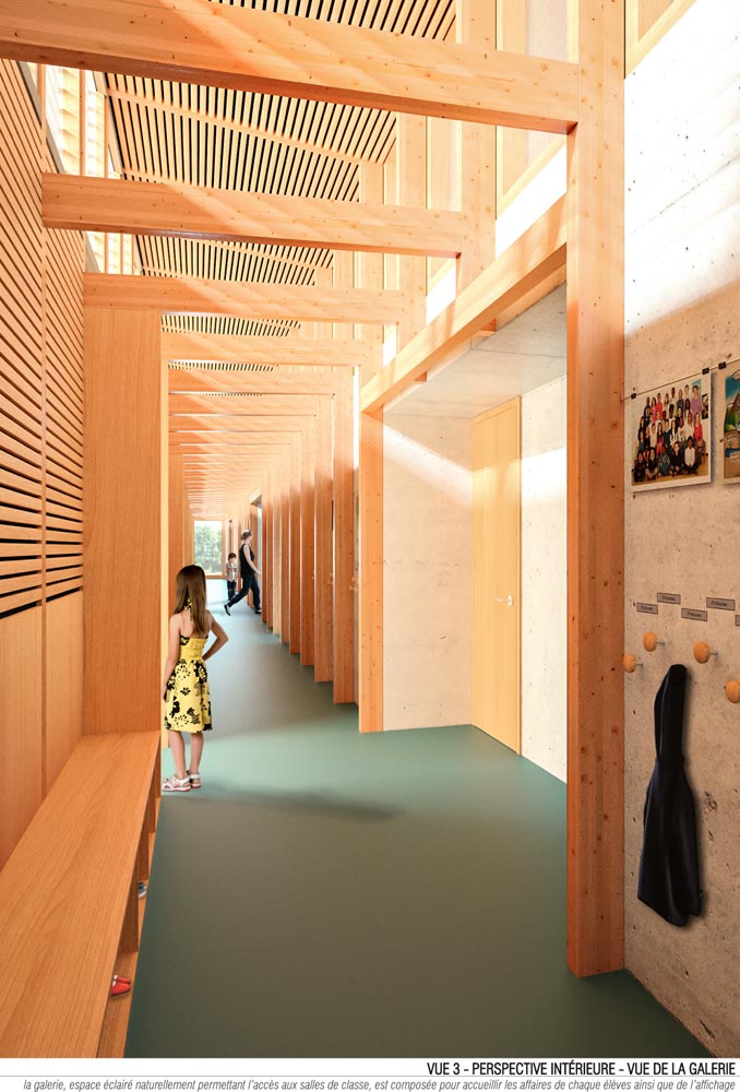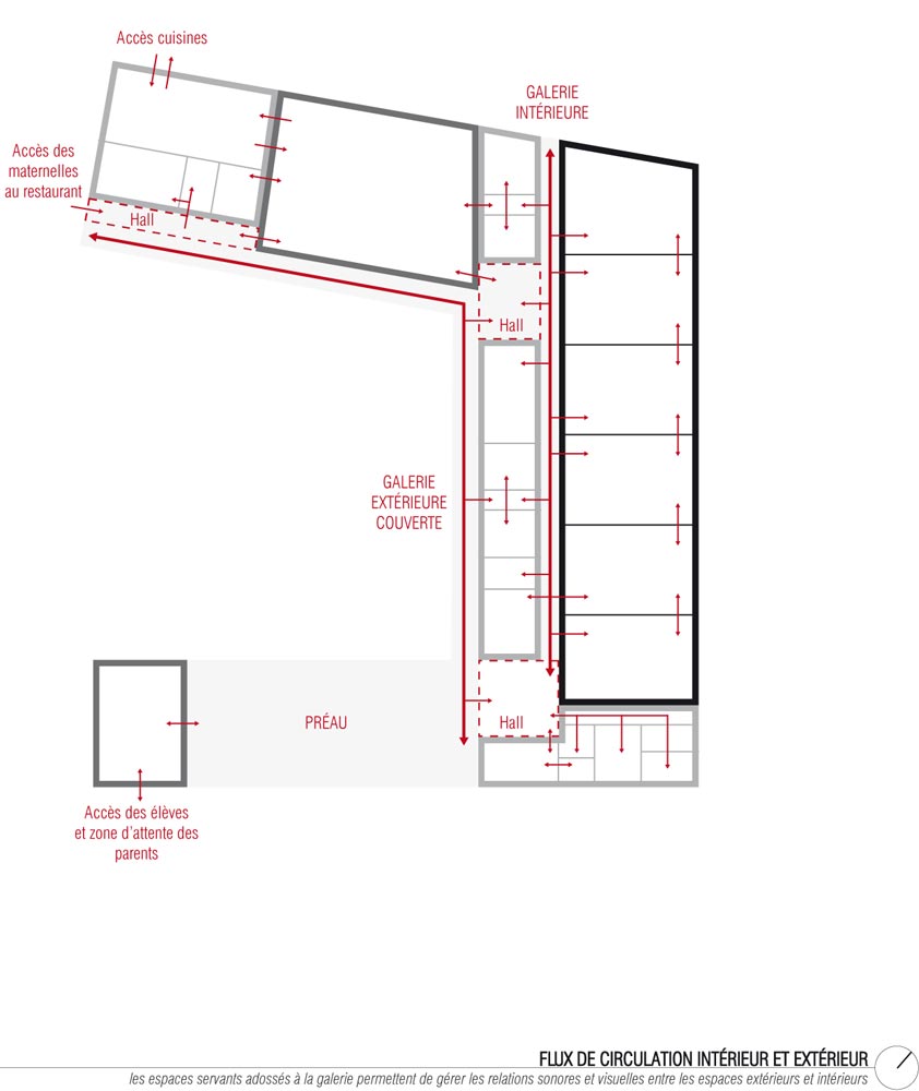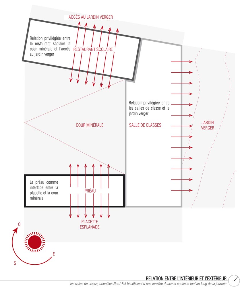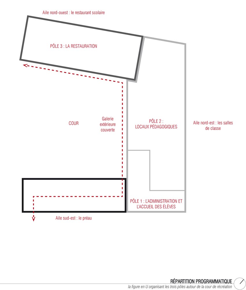 Au croisement de ces deux axes, l’école s’organise selon un plan en U. Cette typologie en forme de cloitre contient la cour de récréation ouverte sur la noue au sud-ouest. Les salles de classe et l’administration sont contenues dans l’aile nord-est. Le réfectoire et la cuisine sont disposées dans l’aile nord-ouest afin d’être directement accessible depuis la voie douce et les élèves de l’école maternelle. Le plan est refermé par le préau, qui fonctionne comme une interface entre la cour et l’esplanade. Ce positionnement lui permet de se transformer en halle en dehors des horaires de fonctionnement de l’école. L’organisation des espaces intérieurs autour des circulations (galerie et halls) permet d’utiliser séparément les différentes ailes.