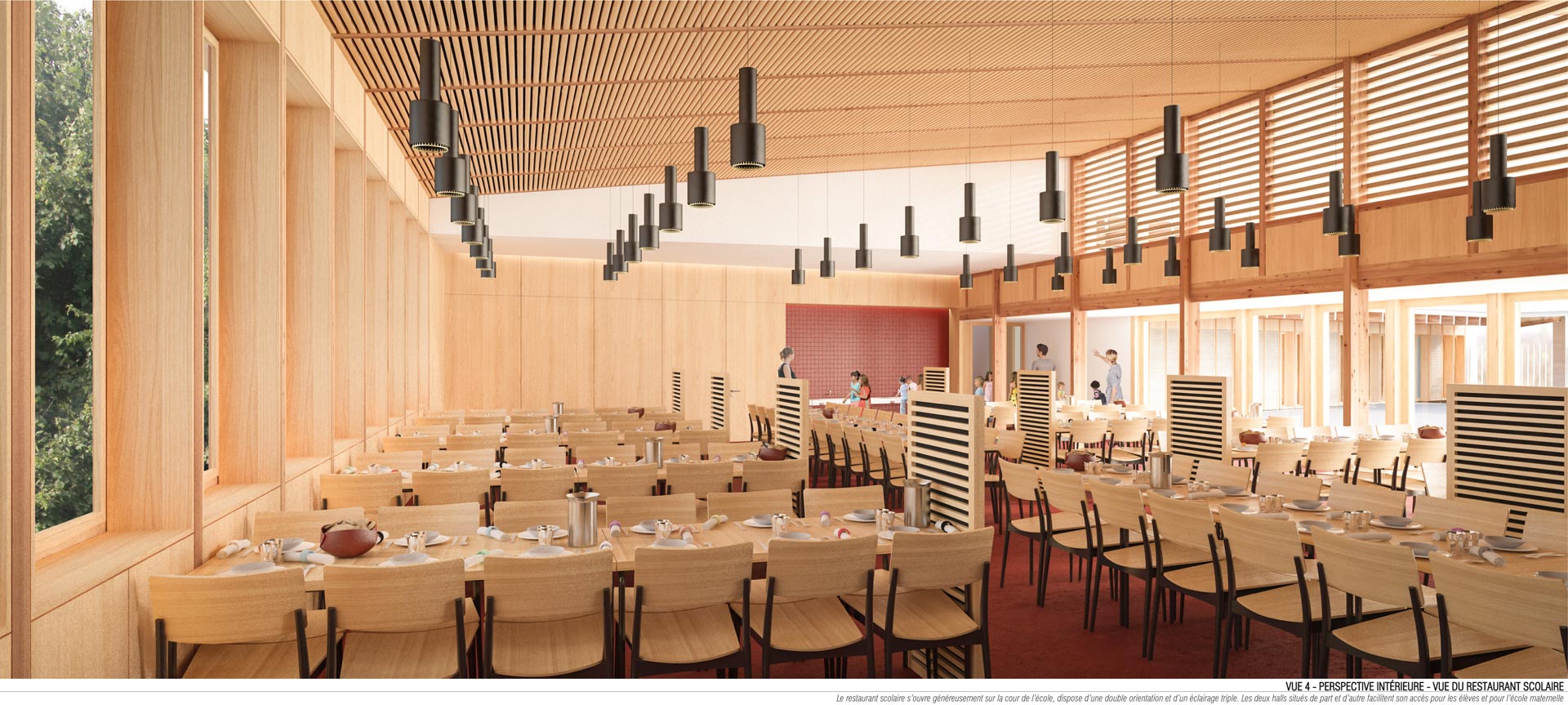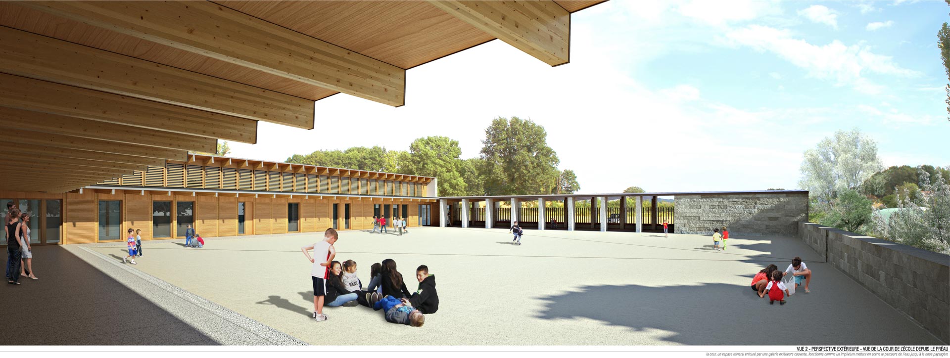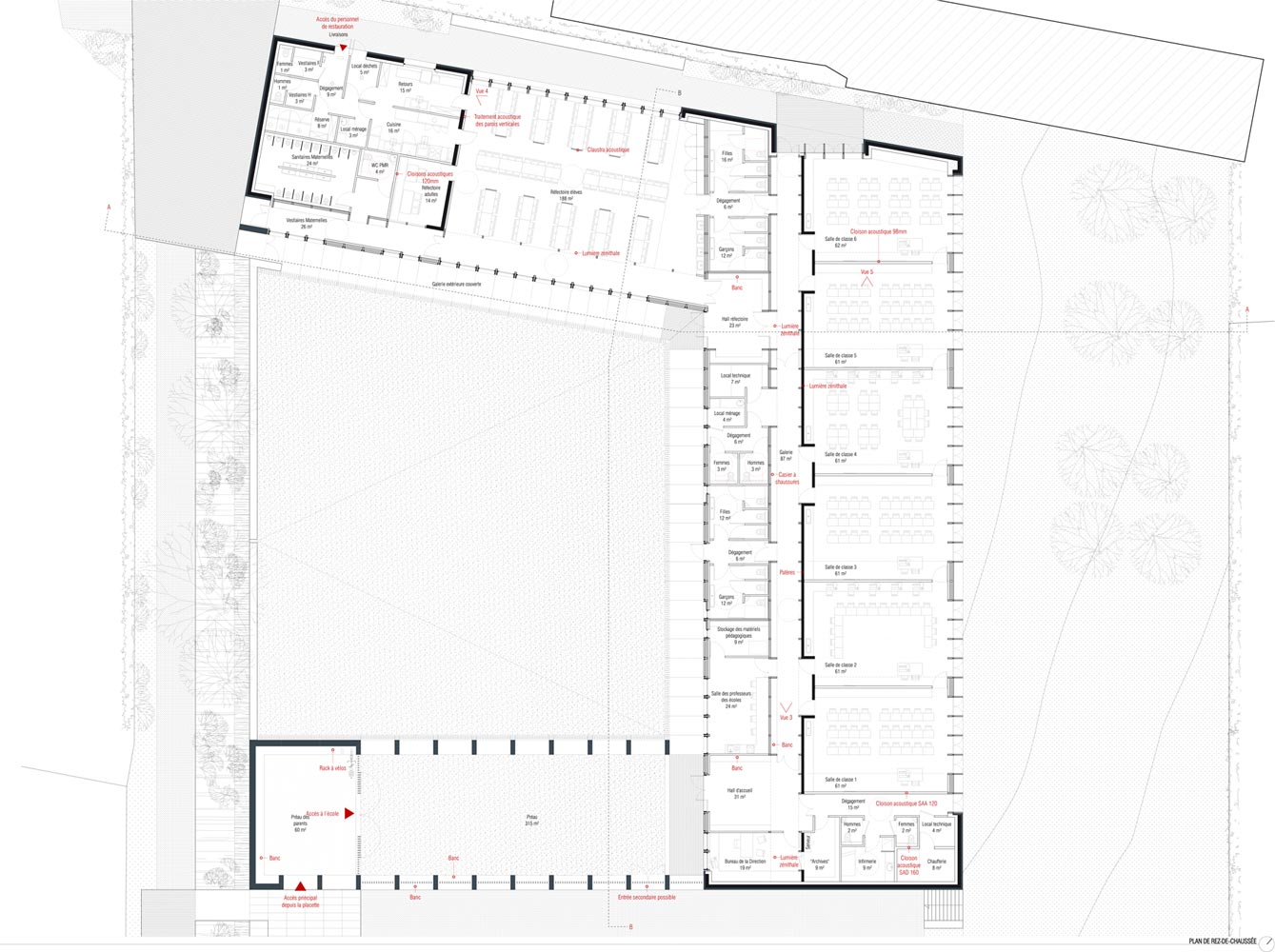 Au croisement de ces deux axes, l’école s’organise selon un plan en U. Cette typologie en forme de cloitre contient la cour de récréation ouverte sur la noue au sud-ouest. Les salles de classe et l’administration sont contenues dans l’aile nord-est. Le réfectoire et la cuisine sont disposées dans l’aile nord-ouest afin d’être directement accessible depuis la voie douce et les élèves de l’école maternelle. Le plan est refermé par le préau, qui fonctionne comme une interface entre la cour et l’esplanade. Ce positionnement lui permet de se transformer en halle en dehors des horaires de fonctionnement de l’école. L’organisation des espaces intérieurs autour des circulations (galerie et halls) permet d’utiliser séparément les différentes ailes.