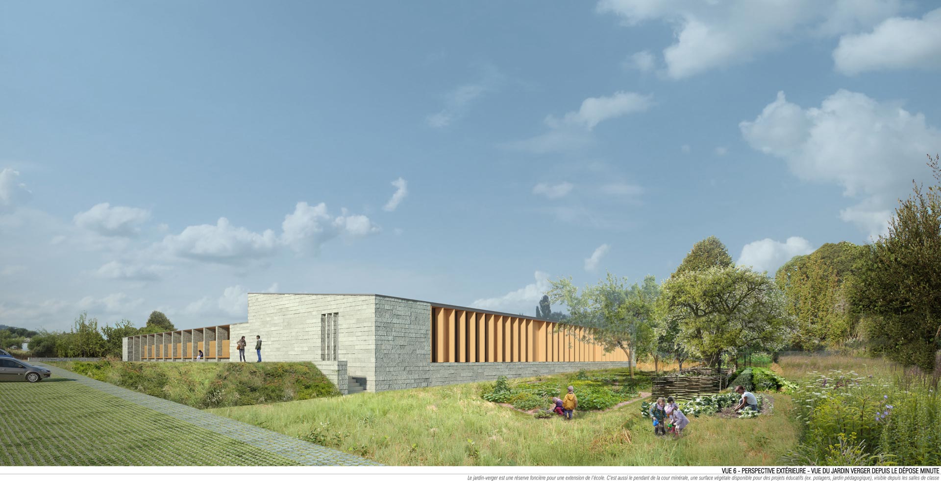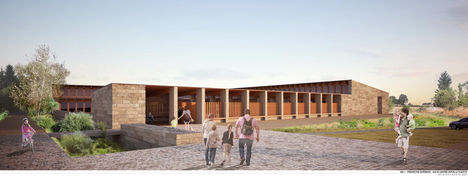 Située à l’interface entre le centre-bourg et le futur éco-quartier, le nouveau groupe scolaire constitue une excellence opportunité pour articuler l’existant et l’aménagement projeté autour de la zone humide qui jouxte le bourg au sud-est. Il devient l’acte fondateur de cette extension de bourg.