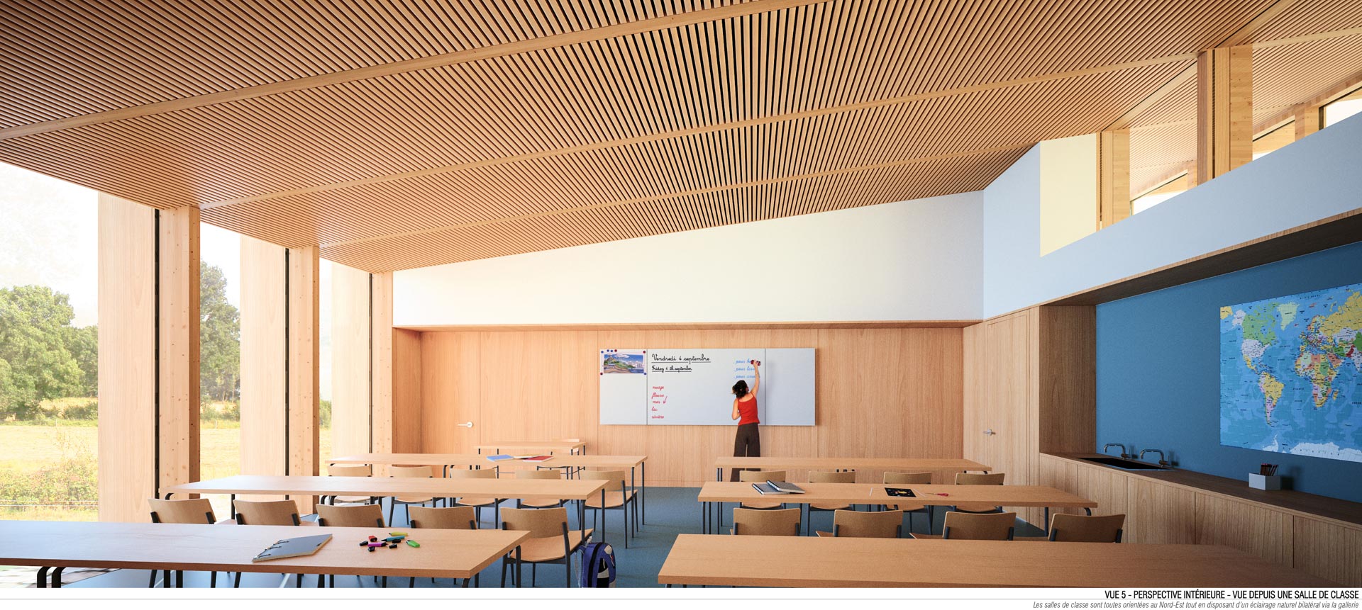 L’organisation des salles de classe est à la base du projet. Le positionnement en enfilade des six salles permet de profiter de qualités égales : vue sur le jardin-verger et meilleure lumière possible (orientation nord-est, garantissant un éclairage diffus tout au long de la journée). L’utilisation de cloisons non-porteuses en fermacell permet d’envisager la fusion de plusieurs salles si nécessaire. L’organisation intérieure est dictée par l’usage : la faible profondeur garantit une bonne visibilité du tableau depuis tous les rangs (5m de distance depuis le dernier rang) tout en laissant place à des variantes dans l’organisation des tables, afin de répondre aux impératifs des différentes activités. Le long des parois sont aménagés des rangements, un point d’eau et des bureaux pour l’informatique. A la manière de tous les autres espaces, les plafonds sont traités acoustiquement.