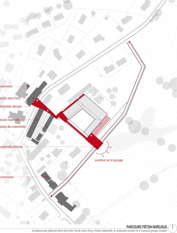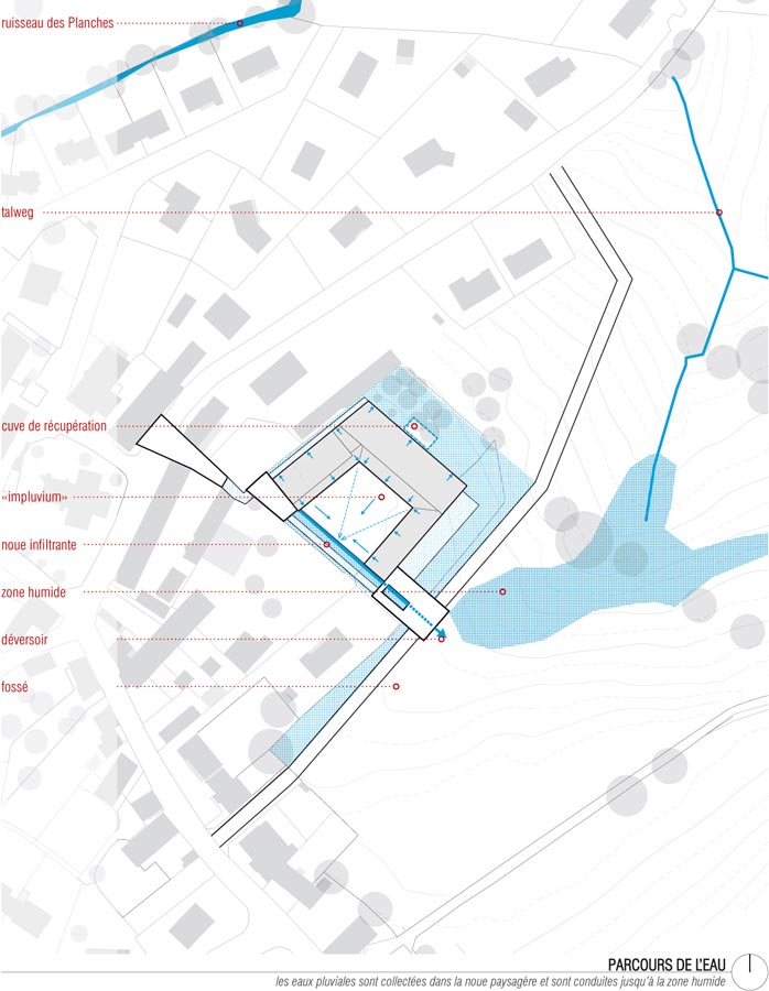 – Le premier est une liaison douce nord-sud avec la rue de Nave, rendue possible par la démolition d’annexes de l’école maternelle. C’est un parcours du centre-bourg vers la zone humide, rythmé de trois placettes qui articulent les accès aux équipements scolaires de la commune. Cet itinéraire est doublé d’un chemin de l’eau, mettant en scène la récupération des eaux pluviales en surface, de la toiture de l’école, par le biais d’une noue, jusqu’à la zone humide qui forme le coeur du nouvel éco-quartier.
