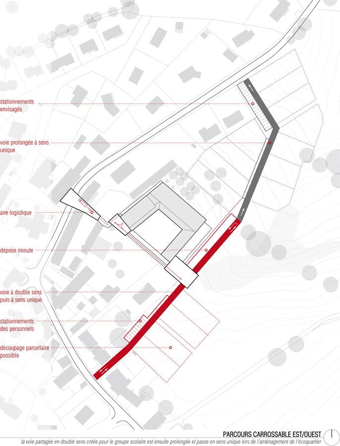 – Le second est une voie carrossable partagée qui permet de desservir l’école en voiture. Sur ses bords elle organise le stationnement des personnels, le dépose minute, et la desserte des futurs lots à bâtir. La réalisation peut être phasée : un premier tronçon à double sens d’abord, puis le passage en sens unique avec la voie complète.