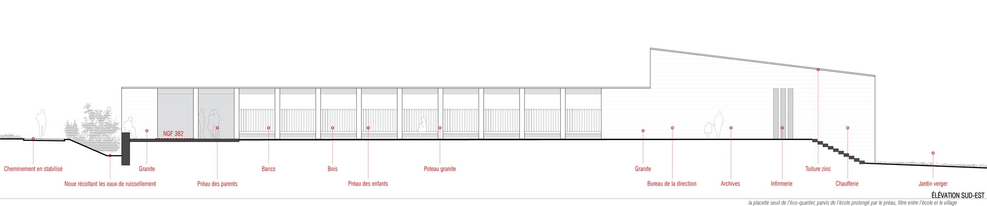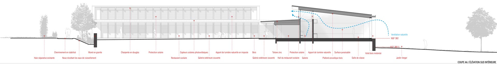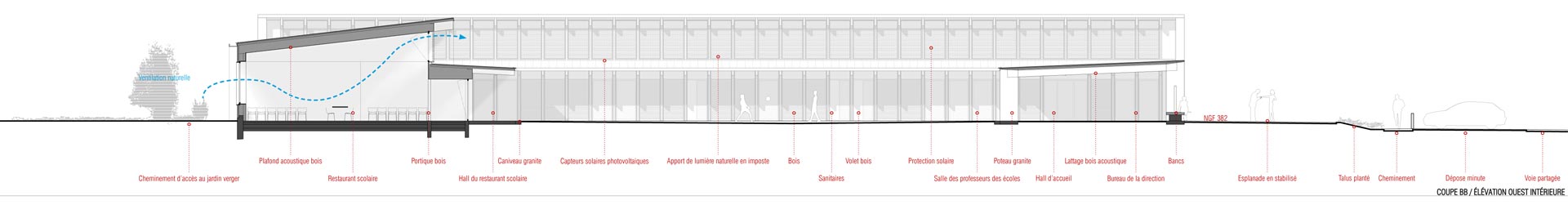 La volumétrie du bâtiment privilégie les apports solaires actifs (panneaux solaires) et passifs par les baies vitrées sud-est et sud-ouest et par des sheds éclairant directement les espaces de circulation et fournissant un complément de lumière naturelle aux salles de classe. Les parois intérieures en béton complètent ce dispositif en accentuant l’inertie du bâtiment. Le principe de coupe favorise également la ventilation naturelle des locaux. Le projet sera conforme à la RT 2012, conforme aux exigences de l’appel à projet de la région et ira même jusqu’au niveau de performance du label EFFINERGIE +. En option nous vous proposerons d’atteindre le niveau de performance du label BEPOS, dans la limite du budget alloué au projet, notamment par une diminution des ponts thermiques ; par un renforcement des isolations, des vitrages et de la perméabilité à l’air ; par la mise en place d’équipements plus efficients et par un contrôle plus poussé des consommations. Le futur groupe scolaire revêtira donc un caractère exemplaire au sein de l’éco-quartier en construction.