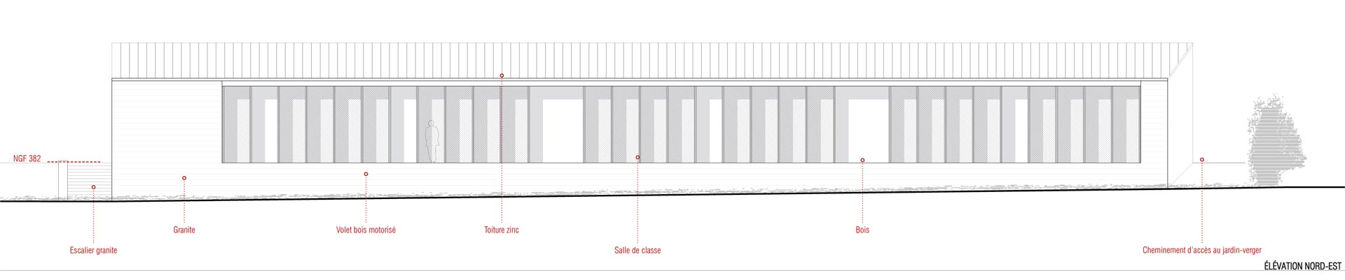 Le double langage d’intériorité et d’ouverture se retrouve dans le dessin des façades. L’extérieur du U est réalisé en granite, entretenant un rapport avec les édifices anciens du bourg. A l’intérieur, les larges débords de toits forment une galerie extérieure couverte et protègent des murs ossature bois bardés de douglas. Les toitures sont réalisées en zinc afin de limiter l’impact visuel de l’école sur le reste du bourg tout en conservant la même teinte que les couvertures locales en ardoises. L’esthétique du projet repose finalement sur une écriture contemporaine attentive aux spécificités locales, sans tomber dans le piège du pastiche.