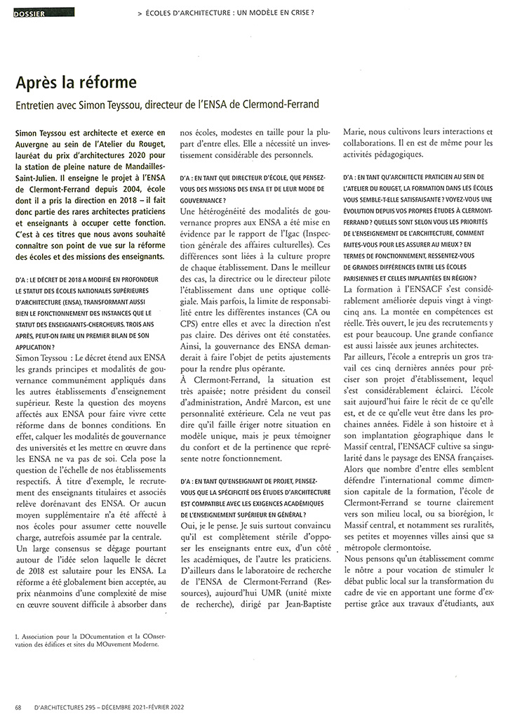 5 décembre 2021 Dans Publications Catégories : d'a d’a 295 – Après la réforme – Entretien avec Simon Teyssou directeur de l’Ecole Nationale d’Architecture de Clermont-Ferrand Catégories : d'a