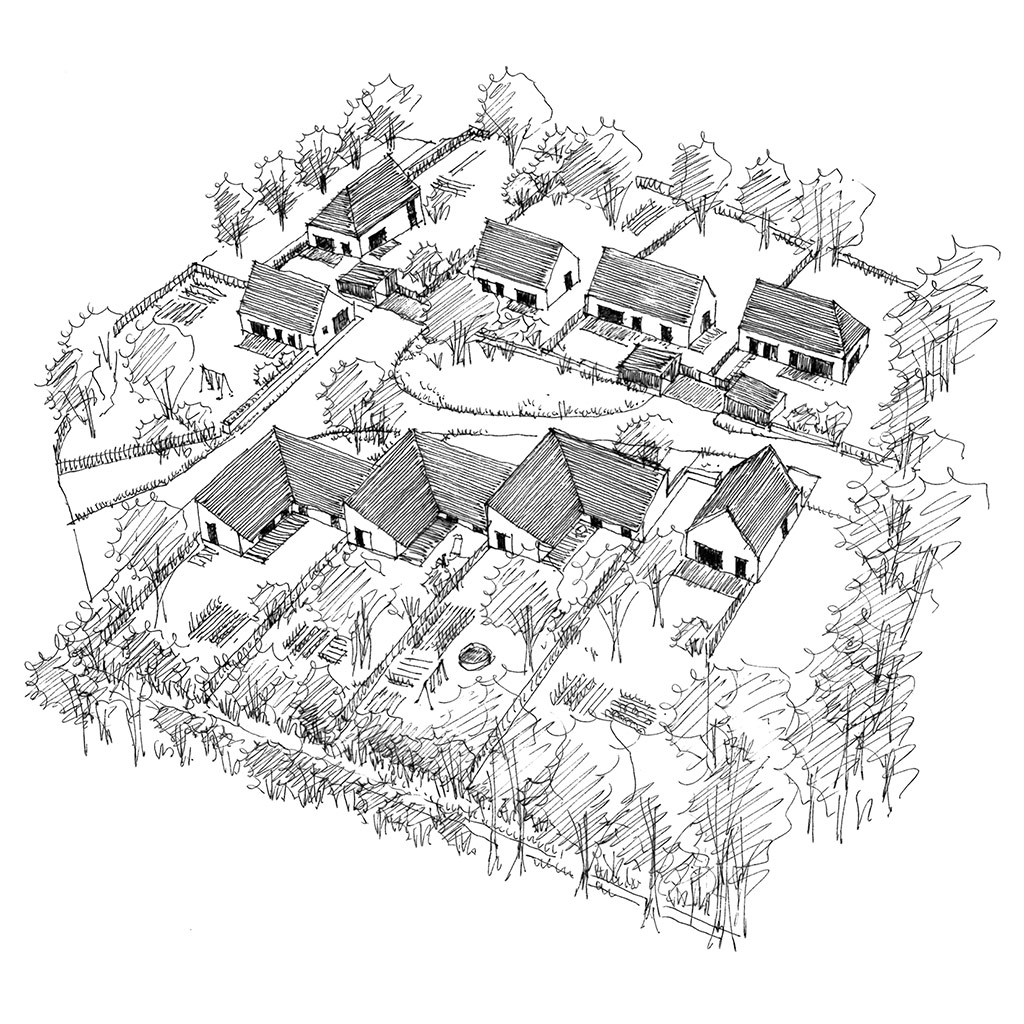 Le lotissement est caractérisé par l’aménagement d’un espace commun au centre de parcelle afin d’en préserver les bords. Ceux-ci formeront un cadre préexistant pour les nouvelles habitations. L’espace commun est composé d’une voie de desserte de largeur variable et de ses accotements, des seuils d’accès aux lots individuels et de deux cheminements piétons.