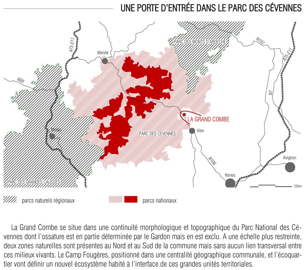 Les éco-quartiers sont trop souvent des pièces urbaines performantes sur le plan environnemental, mais manquant de liens avec leur contexte. Ici, au vu des rares disponibilités foncières de la commune, c’est surtout un enjeu pour l’ensemble de la Grand’Combe. C’est pourquoi il est important de repenser ce que peut être un éco-quartier et construire non pas un morceau de ville autonome, mais un fragment riche de multiples relations : spatiales, sociales, historiques, économiques, environnementales ou en un mot : urbaines.
