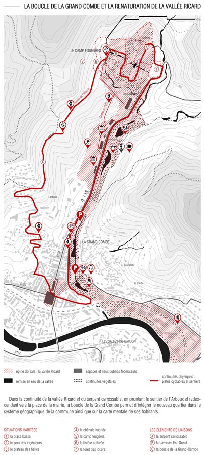 Lieu : 30110, La grand combe Maître d’ouvrage : Mairie de la Grand Combe Maître d’oeuvre : virage - Atelier du rouget Simon Teyssou & associés - Atelier de Montrottier Loïc parmentier & associés - Atelier de L’Ourcq Felix Mulle & associés - Euclid Ingénieurie ( BET TCE) - Agence Franck Boutte (consultant & ingénierie en environnement) - Plus2 Paysages (paysagiste) Calendrier : Lauréat du concours Montant de l'enveloppe : 5 500 000 € HT Fiche projet : La Grand Combe