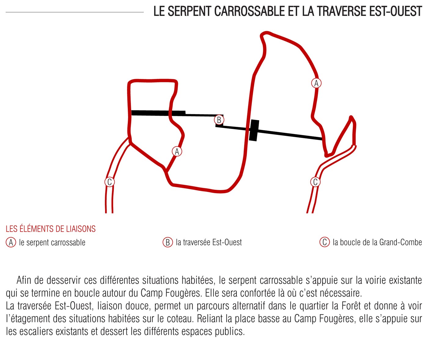 Si je suis en voiture, le serpent carrossable (B) s’enroule autour du Camp Fougères et me permet de rejoindre la place basse. C’est l’ancienne voirie confortée qui permet de desservir l’ensemble des situations habitées. Dans la partie nord du Camp Fougère, un nouveau bouclage permettra de relier directement la cité de la Forêt.