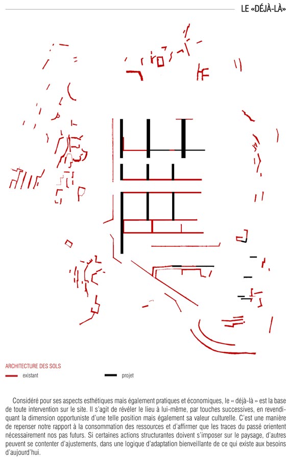 Considéré pour ses aspects esthétiques mais également pratiques et économiques, le « déjà-là » sera la base de toute intervention sur le site. Il s’agit de révéler le lieu à lui-même, par touches successives, en revendiquant la dimension opportuniste d’une telle position mais également sa valeur culturelle. C’est une manière de repenser notre rapport à la consommation des ressources et d’affirmer que les traces du passé orientent nécessairement nos pas futurs. Si certaines actions structurantes doivent s’imposer sur le paysage, d’autres peuvent se contenter d’ajustements, dans une logique d’adaptation bienveillante de ce qui existe aux besoins d’aujourd’hui.