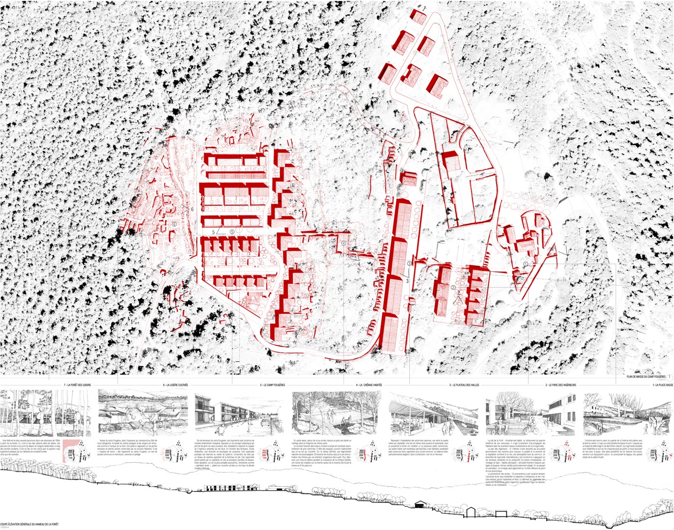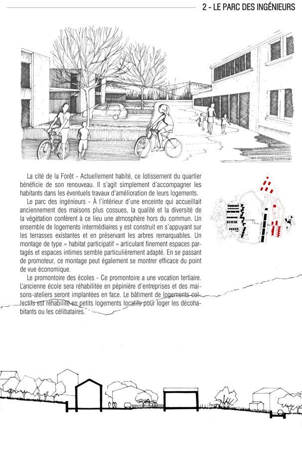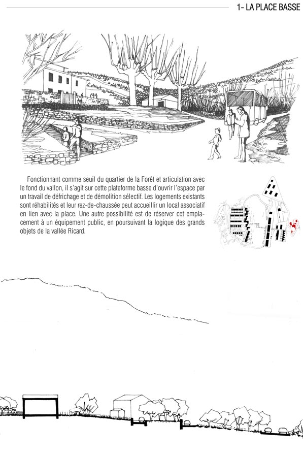 Depuis le centre-ville en empruntant la vallée Ricard, la place basse (1) marque le seuil du nouveau Quartier de la Forêt. C’est un espace ouvert par un travail de défrichage et de démolition sélective qui fait l’articulation avec le fond de la combe. Les logements existants ont été réhabilités. Plus tard, un local associatif pourra y être implanté, ou un emplacement sera réservé à un équipement public dans la logique des grands objets de la vallée Ricard.