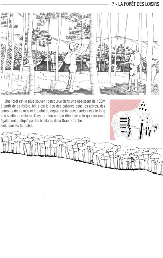 Plus loin, nous entrons dans la forêt des loisirs (7). Dans une épaisseur de 100m à partir de la lisière, c’est la partie la plus pratiquée d’une forêt. C’est le lieu des cabanes dans les arbres, des parcours de bicross, et le point de départ de randonnées. Il est également arpenté par les autres habitants de la Grand’Combe, et les touristes.