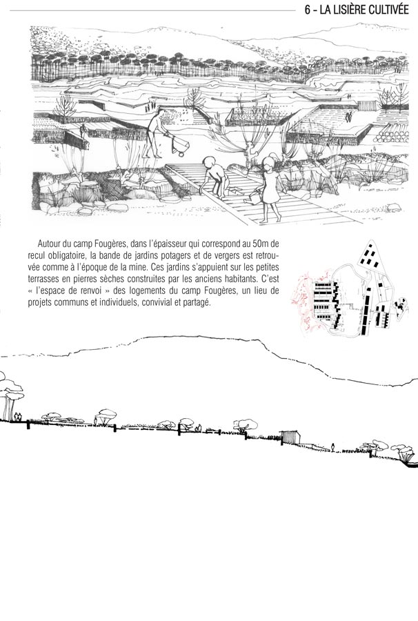 Autour du Camp Fougères, la lisière cultivée (6) est une bande de 50M d’épaisseur constituée de jardins potagers et de vergers. Ceux-ci s’appuient sur les terrasses vernaculaires construites par les mineurs-jardiniers de l’époque. Pour les habitants, c’est un lieu convivial et partagé, support de projets communs ou individuels.