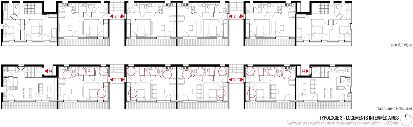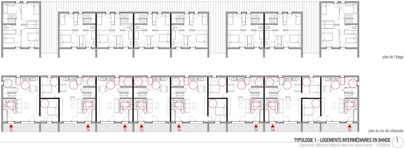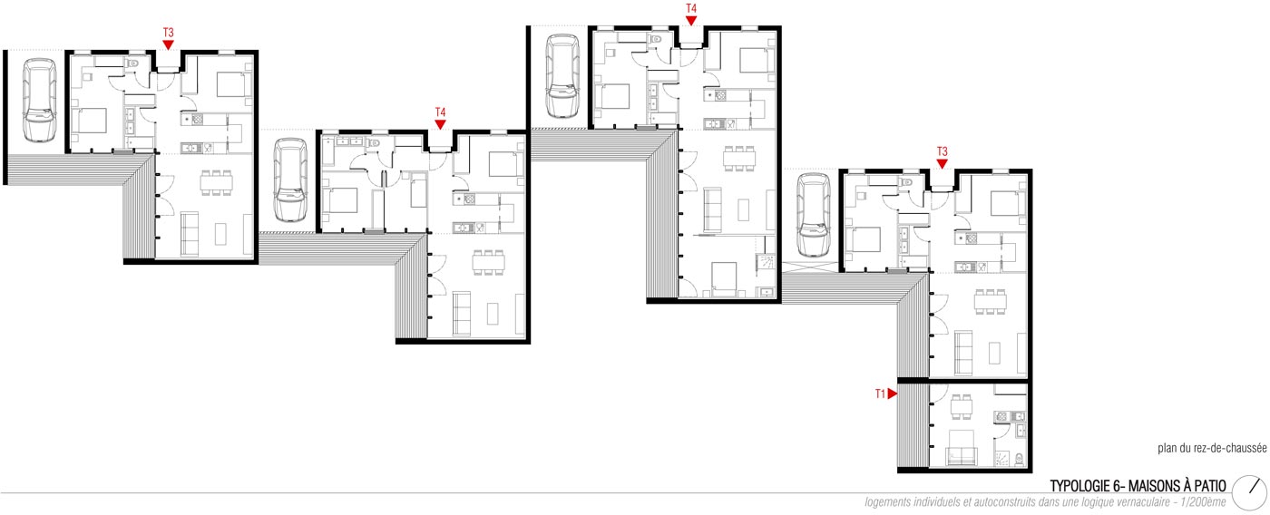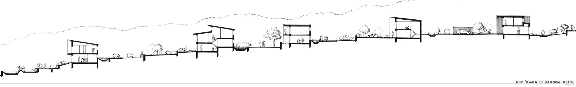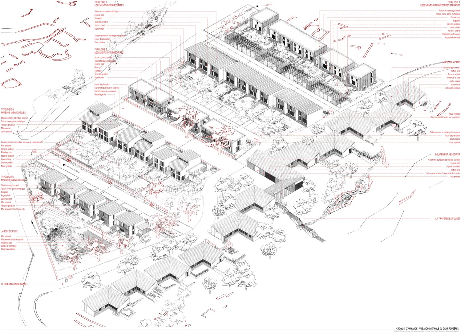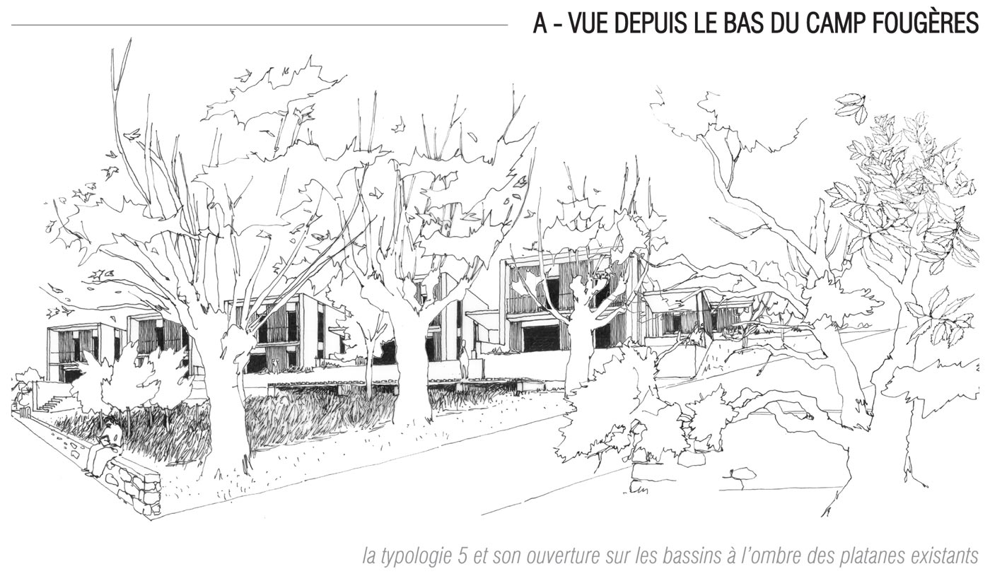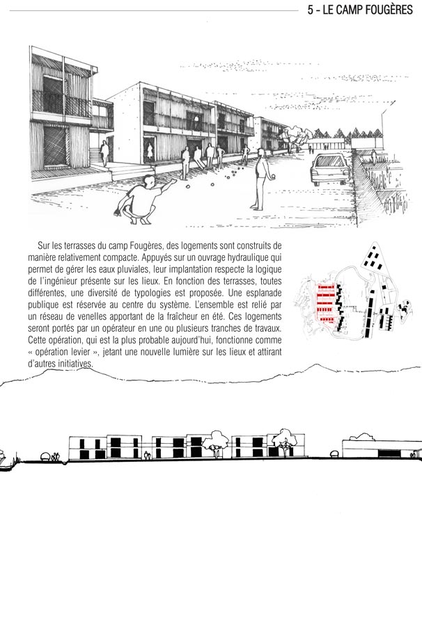 Ayant traversé la chênaie, nous arrivons enfin au Camp Fougères (5). Sur les terrasses laissées par les anciennes constructions, des bandes de logements ont été édifiées de manière relativement compacte le long d’un ouvrage hydraulique en béton de site. Parce que chaque terrasse était particulière, les typologies sont toutes différentes, du T2 au T5. Les bandes au nord, soit trente logements, ont été portées par un opérateur classique. Au sud, ce sont des maisons densément articulées que des familles elles-mêmes ont construites. Une esplanade publique est réservée au centre du système, et l’ensemble est relié par un réseau de venelles apportant de la fraîcheur en été. Chaque logement a un emplacement réservé à proximité immédiate pour la première voiture. Les autres véhicules des ménages peuvent stationner le long de voirie. Jetant une nouvelle lumière sur les lieux et attirant des initiatives, cette première opération a entraîné la reconfiguration de l’ensemble du quartier par un effet de levier.