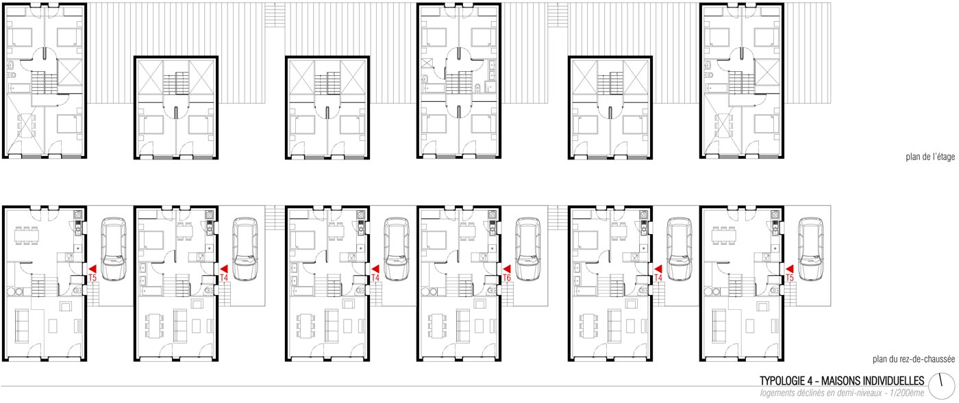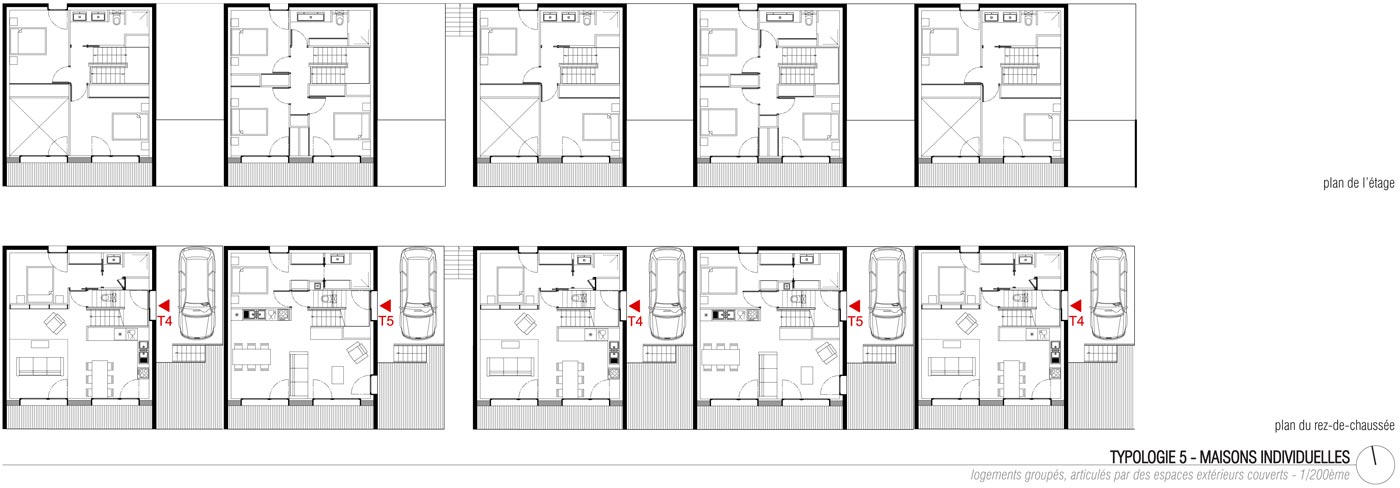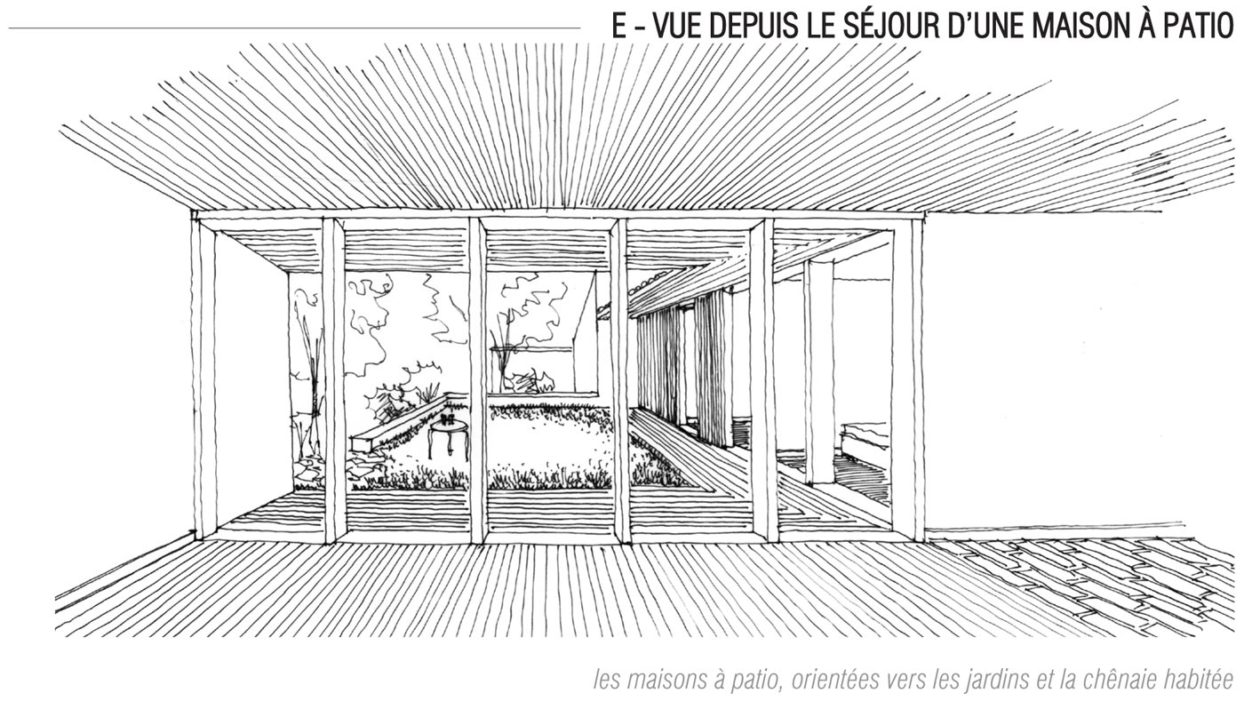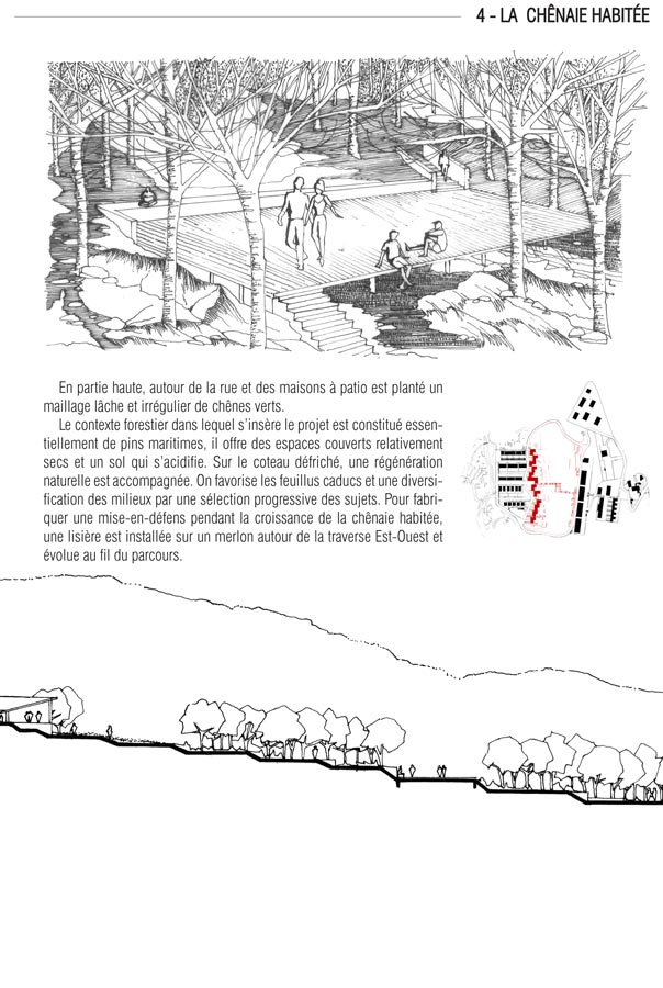 Toujours sur la traverse, la montée du coteau nous fait pénétrer un bois. C’est la chênaie habitée (4) qui accueille dans sa partie haute des maisons à patios. Celles-ci ont été implantées librement sur des lots à bâtir et construites principalement en bois. Cela respecte la logique organique de la situation mais permet également une certaine évolutivité : du T3 au T6, les maisons peuvent s’adapter à l’évolution de la famille. Un accompagnement architectural des acquéreurs a permis d’assurer la cohérence de l’ensemble.
