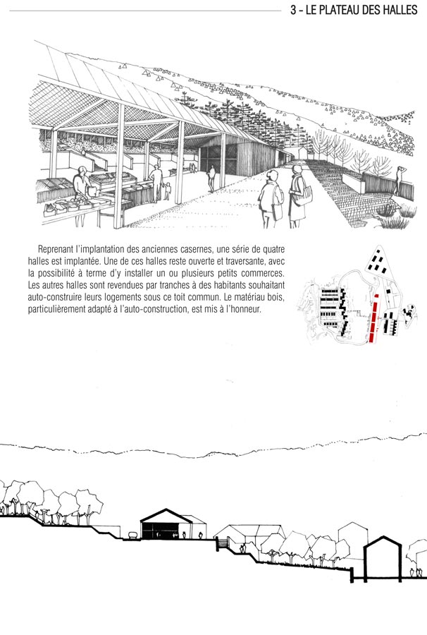 En haut de l’escalier existant qui a été conforté, nous atteignons le plateau des halles (3). À l’emplacement des anciennes casernes, quatre halles ont été implantées. Dans l’axe de la traverse Est-Ouest, une de ces halles reste ouverte, offrant un espace public ombragé. À terme, un ou plusieurs petits commerces pourront s’y installer. Construites par la commune, les autres halles ont été revendues par travées : des auto-constructeurs ont édifié leurs propres logements et des locaux d’activité sous ce toit commun. Le bois, particulièrement adapté à l’auto-construction, est mis à l’honneur.