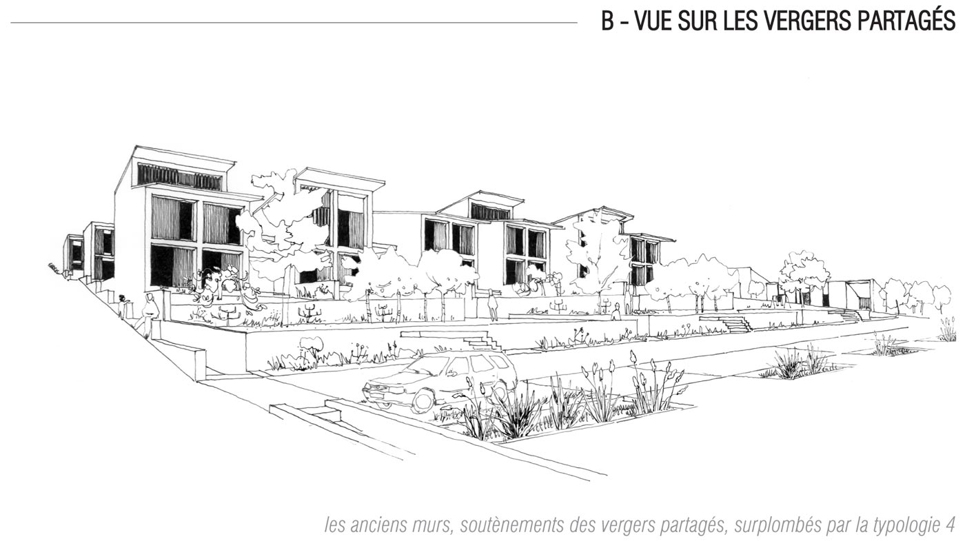 Depuis cette place, pour débuter l’ascension du coteau, on peut emprunter un parcours piéton. C’est la traverse Est-Ouest (A), nouvel élément structurant du quartier qui s’appuie sur les escaliers existants en partie basse et nous mène jusqu’au Camp Fougères.
