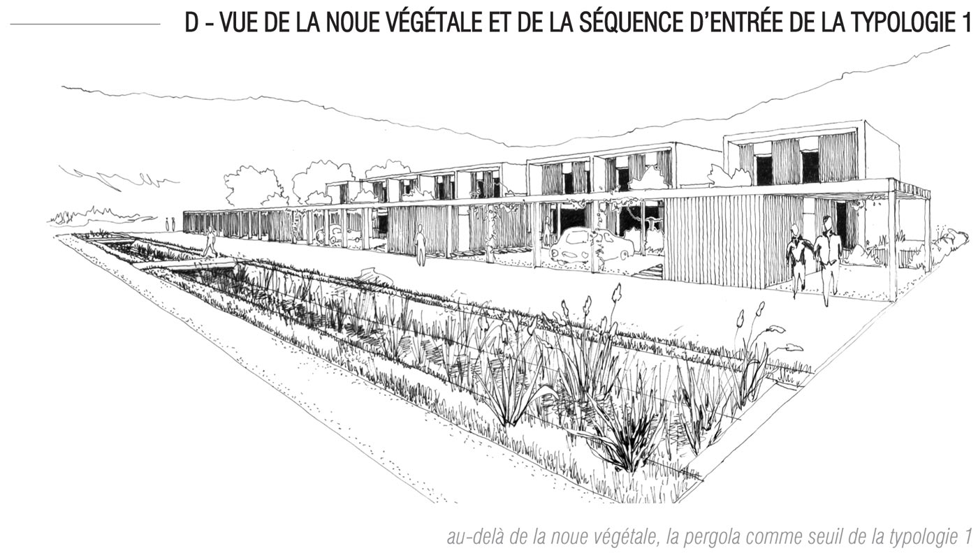 Porte d’entrée de la Grand Combe depuis le nord, le nouveau quartier ainsi constitué contribuera à borner un élément structurant de la commune qu’est la vallée Ricard, aujourd’hui bien peu lisible et difficile à faire muter. L’objectif à long terme est de renaturer le vallon et d’intégrer son chapelet d’équipements au paysage. De la place basse du Quartier la Forêt au parking du supermarché en passant par le centre de secours, cela permettra de réaffirmer le lien entre la ville et sa géographie et par-là retrouver le sens du nom :« La Grand’Combe ».granitiques, réalisation de dallages en plaques de gneiss pour les placettes et pour les seuils des habitations.
