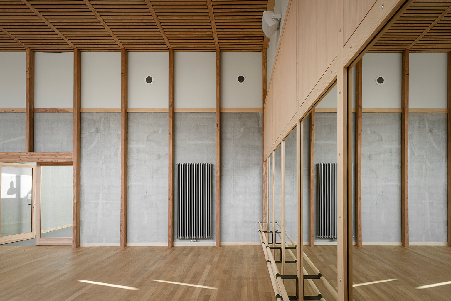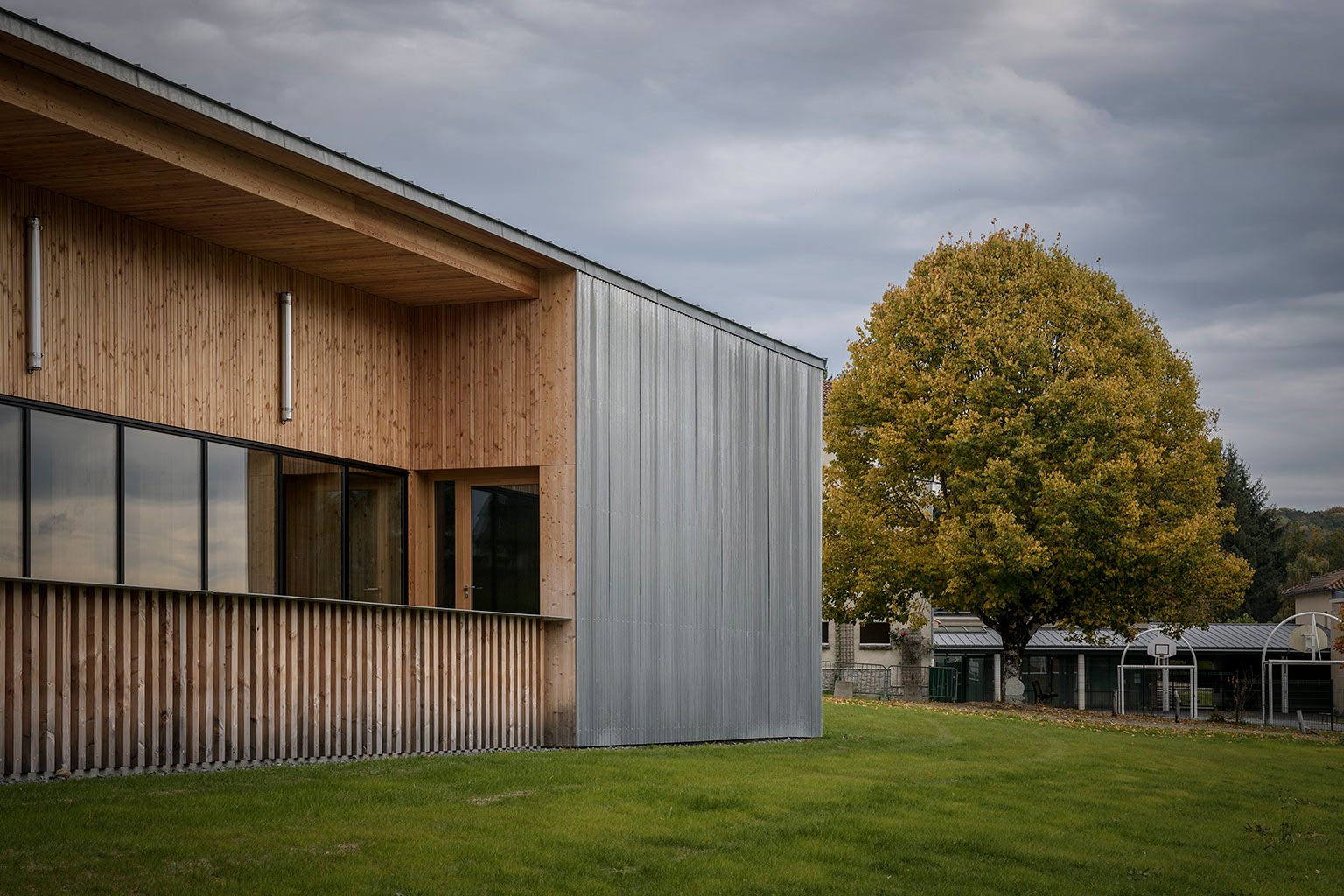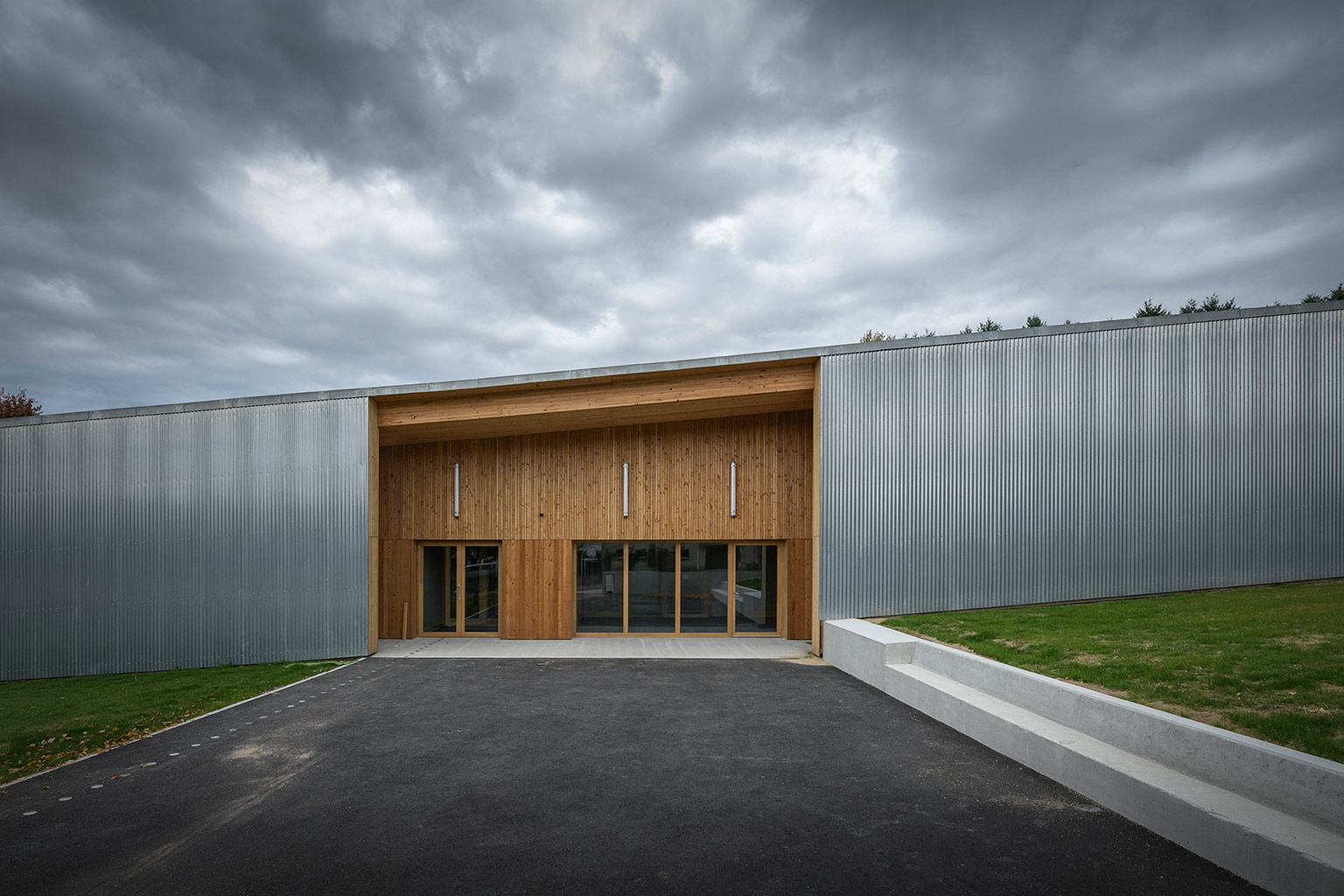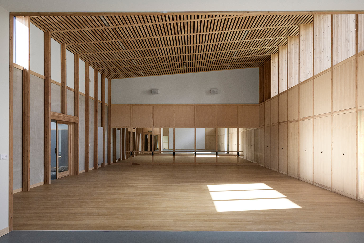 En partie centrale se trouvent deux salles d’activités s’ouvrant respectivement à l’Est et à l’Ouest. Mutualisés, les locaux sanitaires et techniques sont placés sous la toiture terrasse. La structure en bois, composée de portiques rapprochés en lamellé-collé de douglas qualifie les espaces. Le noyau central en béton contrevente l’édifice tout en apportant une inertie thermique qui améliore le confort d’été.