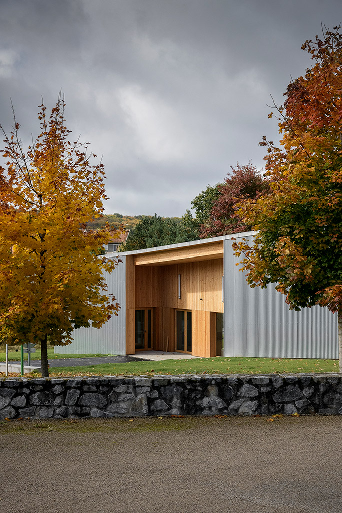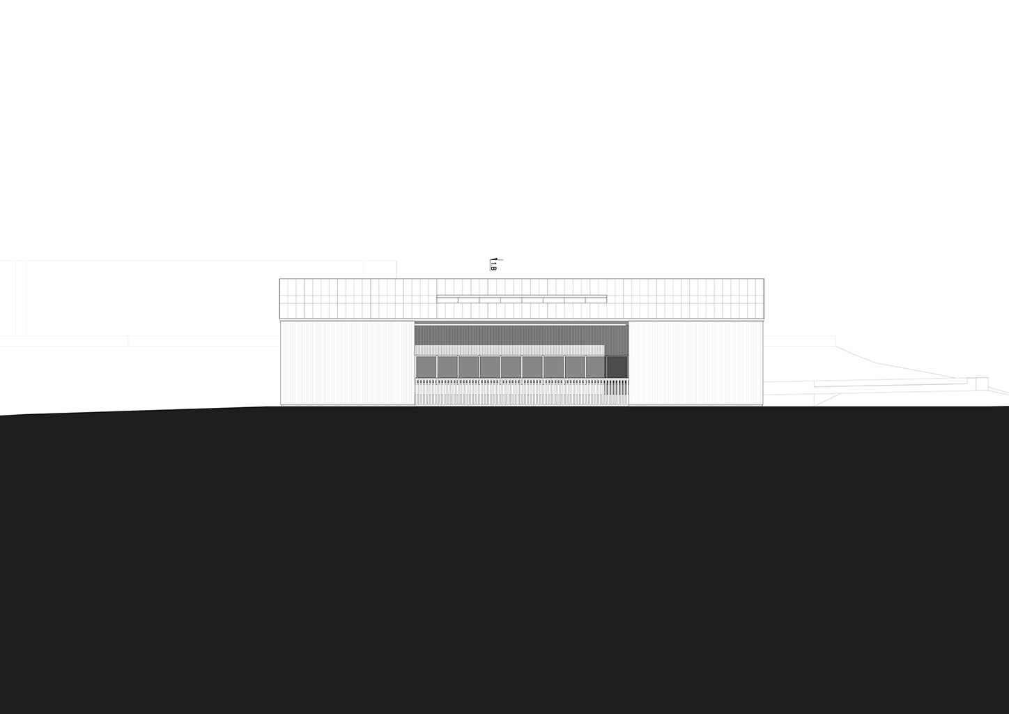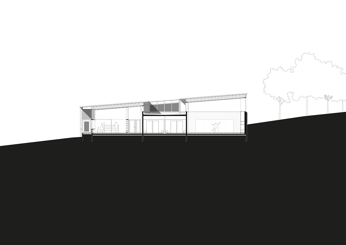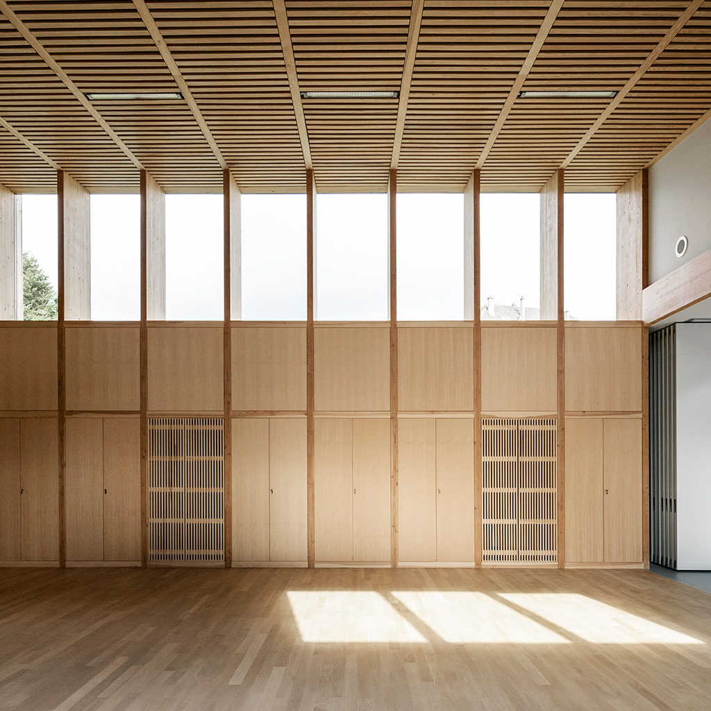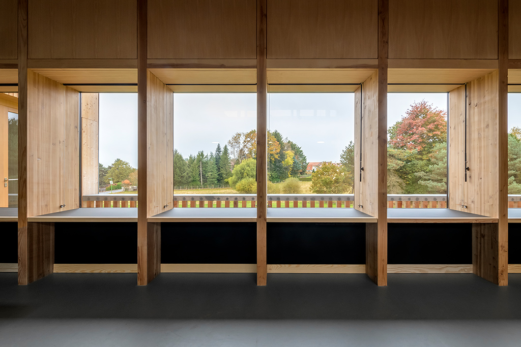En partie centrale se trouvent deux salles d’activités s’ouvrant respectivement à l’Est et à l’Ouest. Mutualisés, les locaux sanitaires et techniques sont placés sous la toiture terrasse. La structure en bois, composée de portiques rapprochés en lamellé-collé de douglas qualifie les espaces. Le noyau central en béton contrevente l’édifice tout en apportant une inertie thermique qui améliore le confort d’été.