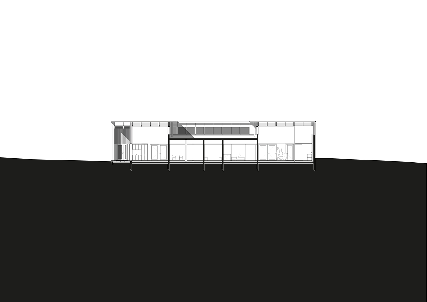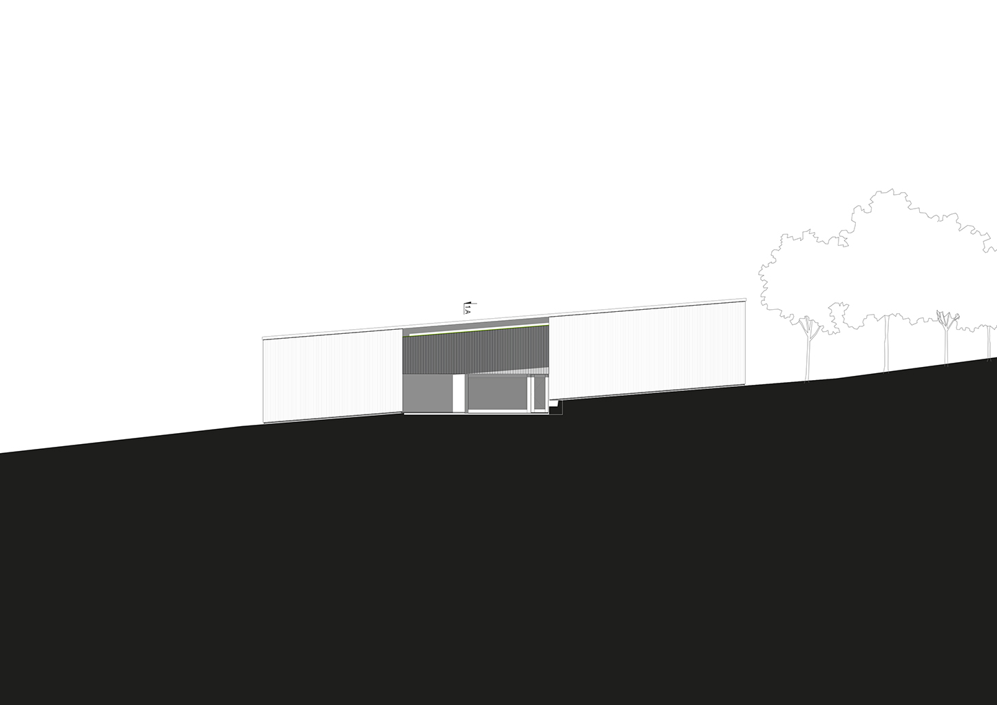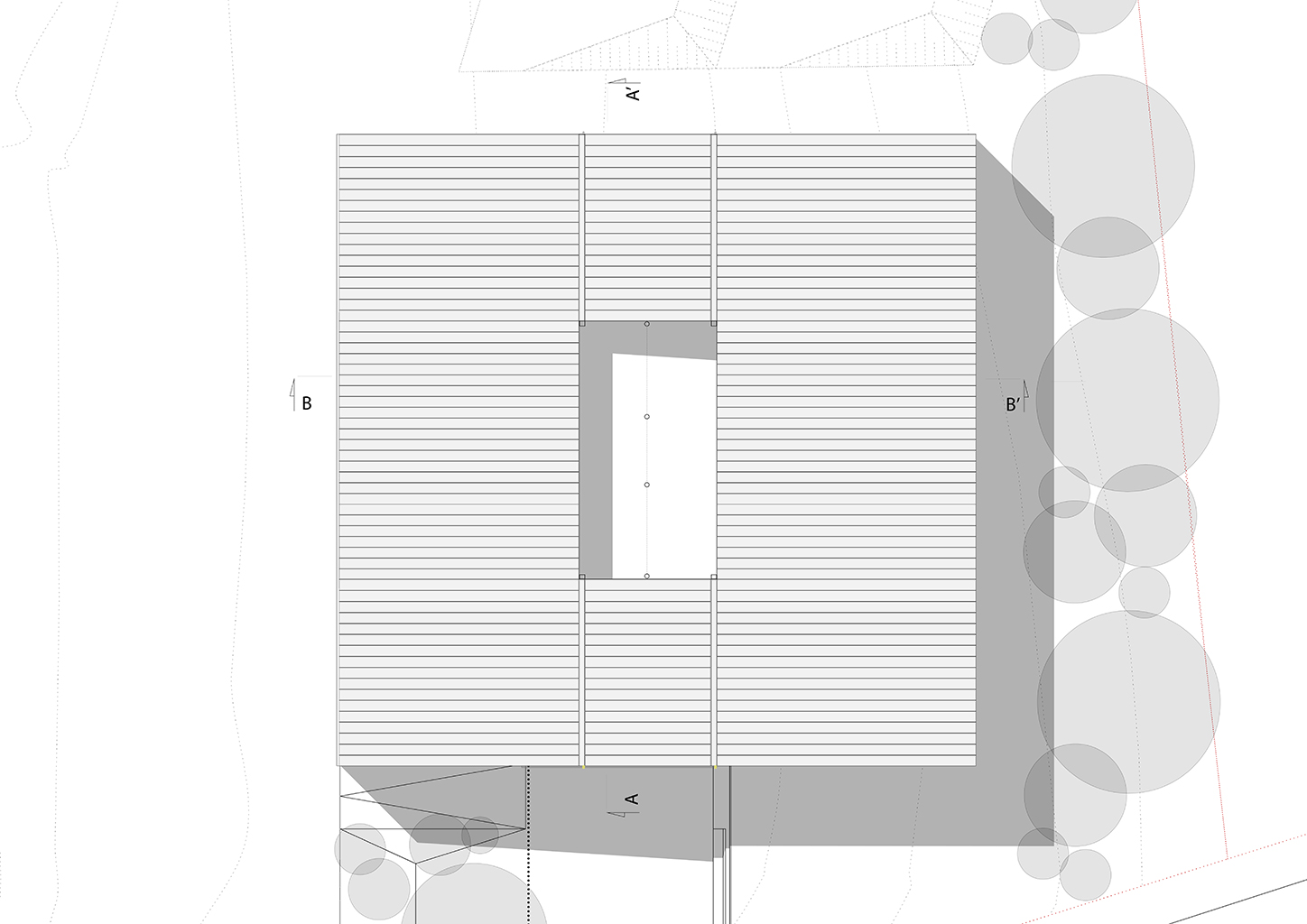 Le volume de l’édifice, à plan carré, est simple. Sa coupe révèle une toiture à pente unique qui suit le profil du terrain naturel. Cinq creux sont percés dans le volume recouvert de bardage en zinc ondulé : un porche d’entrée à l’Est, une loggia au Sud, un patio à l’Ouest, une grande baie au Nord, et une toiture terrasse en dépression dans le toit apportant un éclairage indirect. Ces creux sont caractérisés par leur matérialité en bois.