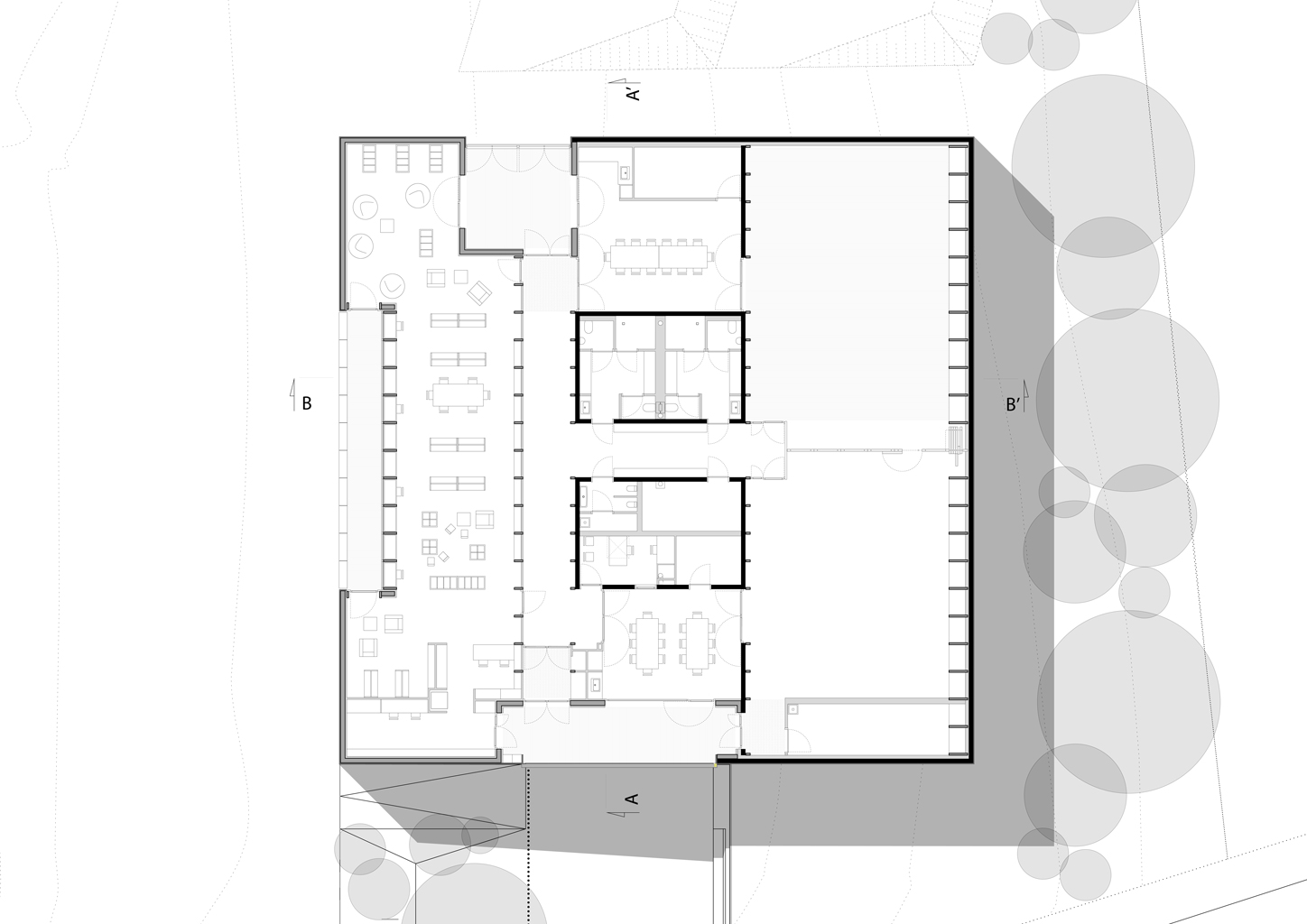 La médiathèque occupe la partie Sud de l’édifice, ouverte sur le talweg. Elle est la plus basse sous-plafond. Les salles polyvalentes destinées à l’accueil des enfants et aux activités sportives sont placées au Nord pour bénéficier d’une grande hauteur.