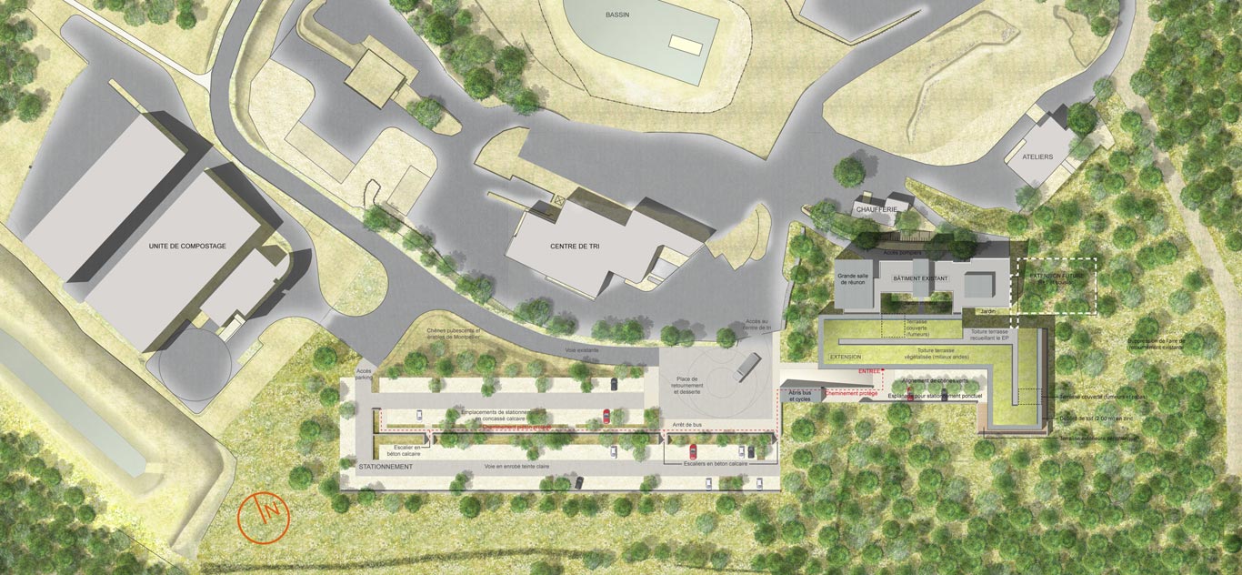 Le stationnement est implanté de telle sorte qu’une unité soit trouvée entre les différentes entités du site : unité de compostage, centre de tri, bureaux. Ce parking paysagé est constitué de concassé calcaire pour les emplacements des véhicules et d’enrobé calcaire pour la circulation. Plantés d’espèces telles que le chêne pubescent ou l’érable de Montpellier sous forme de bosquets, il sera ombragé. Les eaux excédentaires seront récupérées et évacuées vers un bassin existant ou à créer.