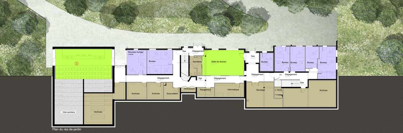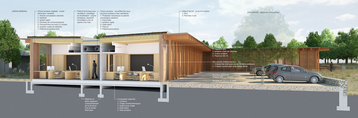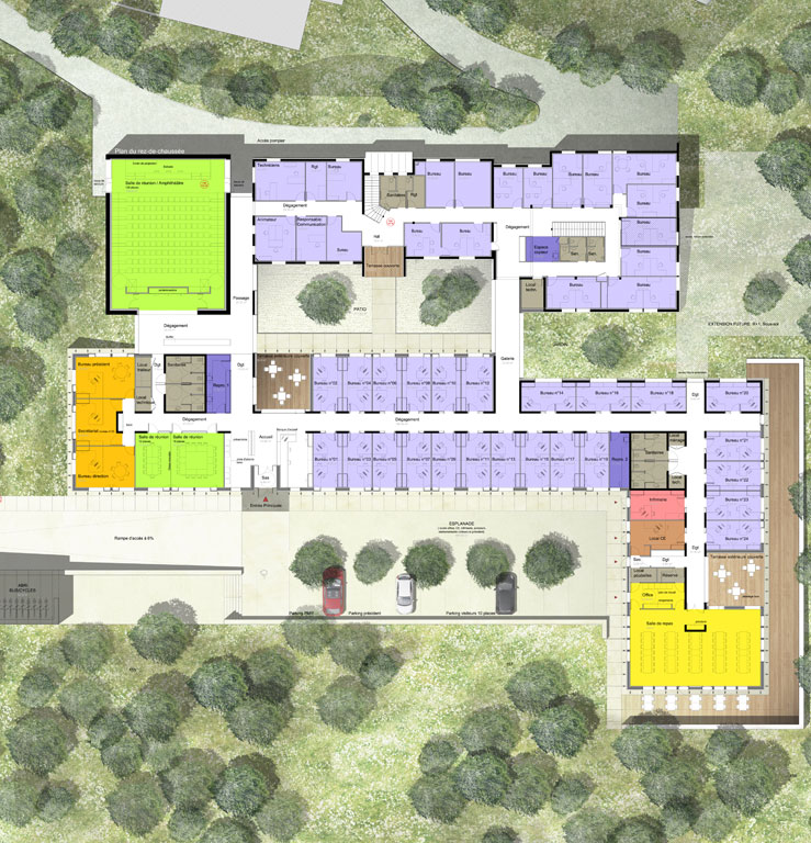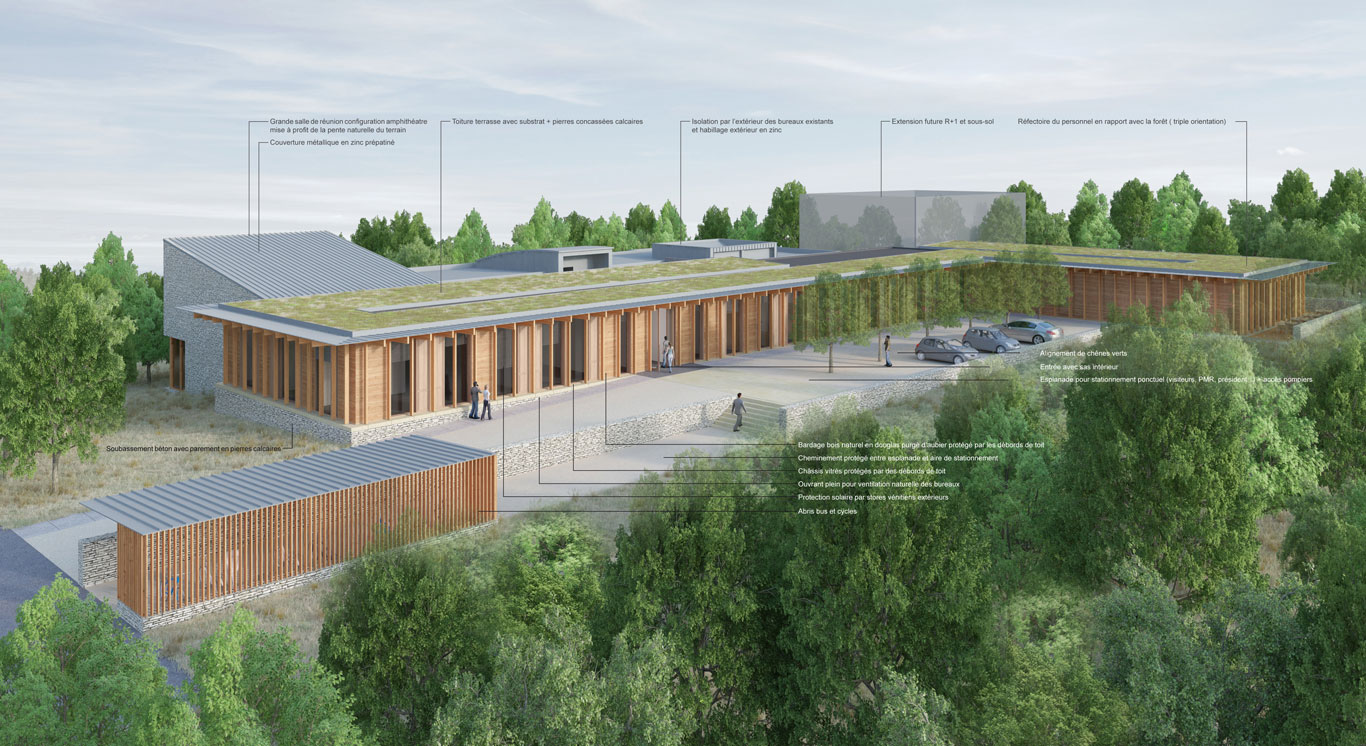 Le projet étant situé sur un site dégradé, il nous paraît primordial d’instaurer une relation privilégiée au paysage et d’inscrire le projet dans son contexte arboré. Plutôt qu’une relation frontale entre le projet et le paysage, l’extension se déplie depuis l’existant jusqu’à la lisière du bois et s’immisce en son sein. Des espaces extérieurs valorisants sont créés : patio, jardin intime à l’Est, esplanade, terrasses couvertes et terrasses extérieures. Afin d’appuyer ce sentiment, le projet est constitué de matériaux tels que la pierre calcaire, le bois, une toiture végétale, avec une structure bois apparente à l’extérieur.
