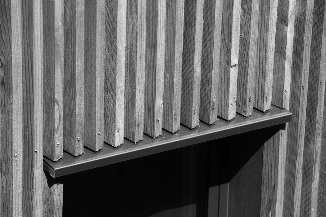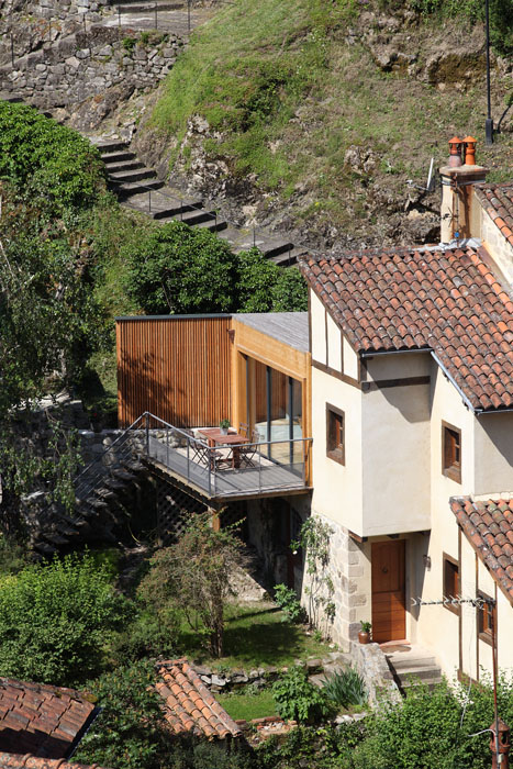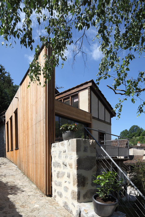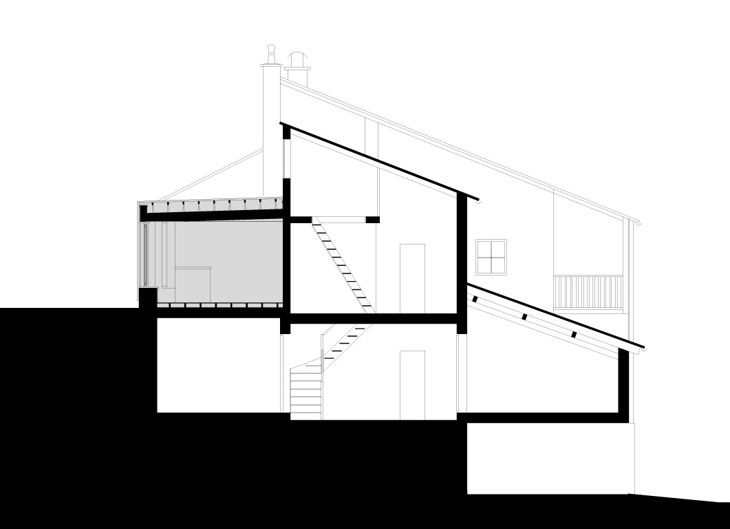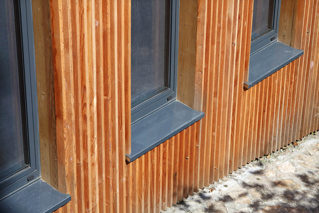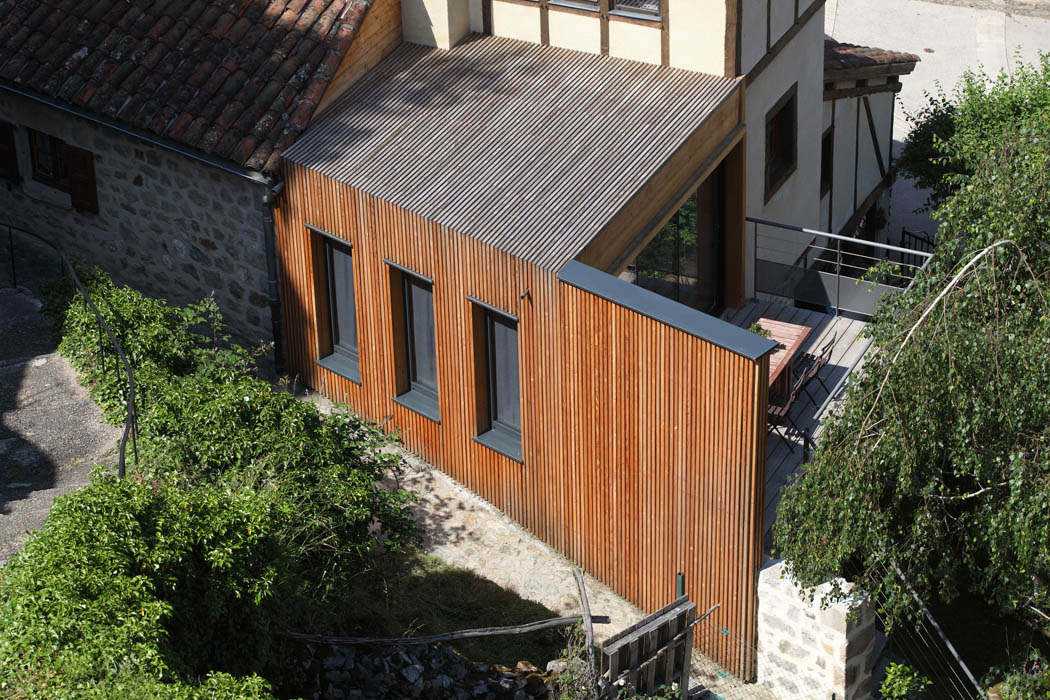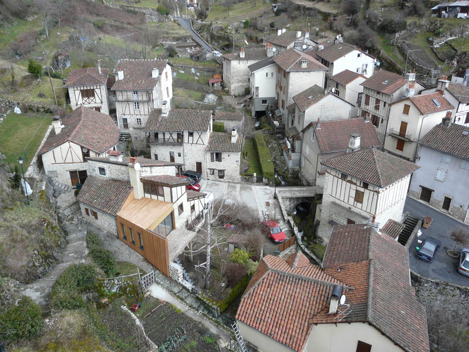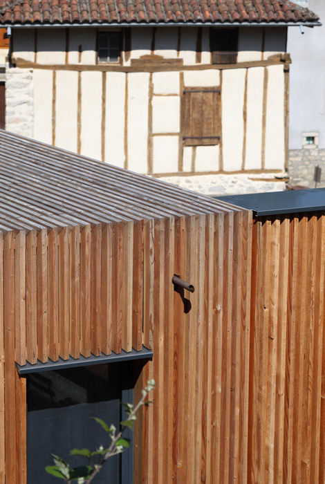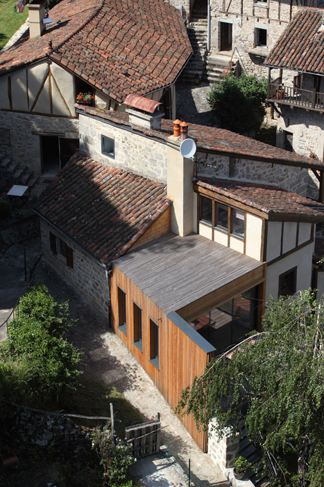 Il s’agissait pour ce projet d’agrandir une habitation existante au cœur du bourg médiéval de Laroquebrou. La maison possède, à l’origine, une terrasse située au bord du chemin d’accès au château qui domine le village. Ce chemin touristique est emprunté par les promeneurs et la terrasse souffre d’un manque d’intimité. Les clients souhaitaient réaliser une extension de leur habitation afin de profiter de ce lieu toute l’année. Il s’agissait donc de créer une salle à manger et une nouvelle terrasse ensoleillées et lumineuses à l’abri des regards indiscrets. L’étroitesse des ruelles de Laroquebrou a orienté notre choix vers une extension en ossature bois : matériau facilement transportable par petites sections et permettant la réalisation d’un chantier propre et sec. Notre choix s’est porté sur un bardage ajouré vertical en mélèze qui est appelé à patiner avec le temps. Cette patine gris argenté s’accorde parfaitement avec les dominantes grise et jaune des granites des habitations du bourg de Laroquebrou. Une unité de matière entre la toiture et les murs favorise la lecture de ce volume. Le nouveau volume créé remplace la terrasse existante, le bardage qui l’habille se prolonge en un mur ajouré protégeant la nouvelle terrasse du regard indiscret des promeneurs. La terrasse est aménagée à la manière d’un ponton, dominant le paysage et le village, un escalier permet d’accéder directement au jardin en contre bas.