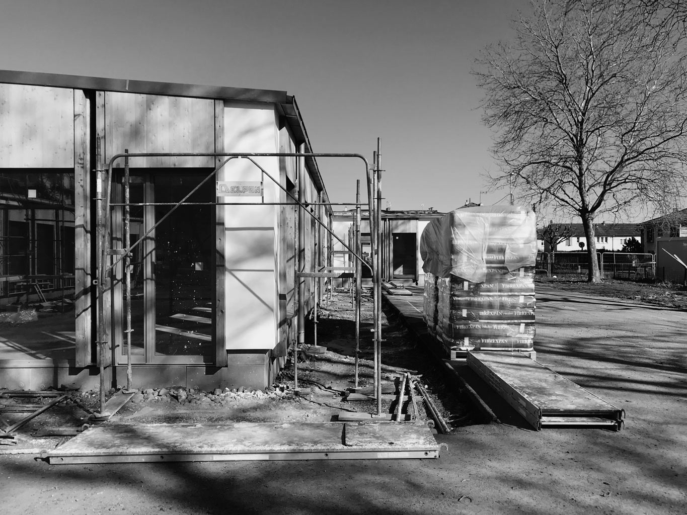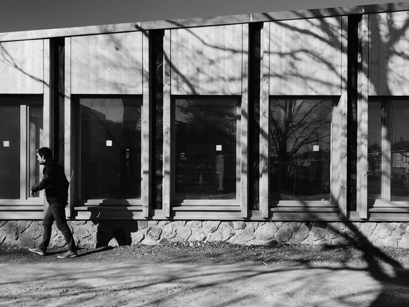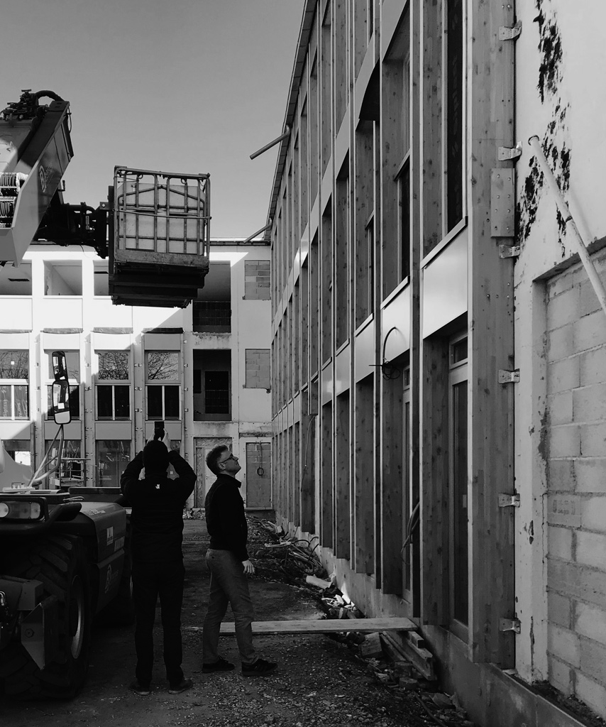 L’isolation thermique par l’extérieur reprend à son compte l’écriture tramée des façades existantes tout en hiérarchisant les percements en fonction des orientations, des vues et des programmes. La trame est incarnée par des montants en bois lamellé collé en douglas entre lesquels s’insèrent les châssis vitrés en pin sylvestre, les impostes et les allèges en douglas. Toutes les maçonneries sont isolées par l’extérieur par une fibre de bois recouverte d’un enduit à la chaux naturelle. Les murs d’origine en pierre sont conservés pour leur qualité matérielle.