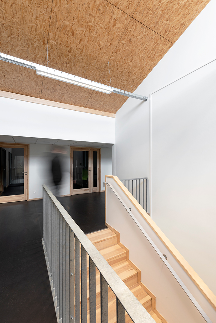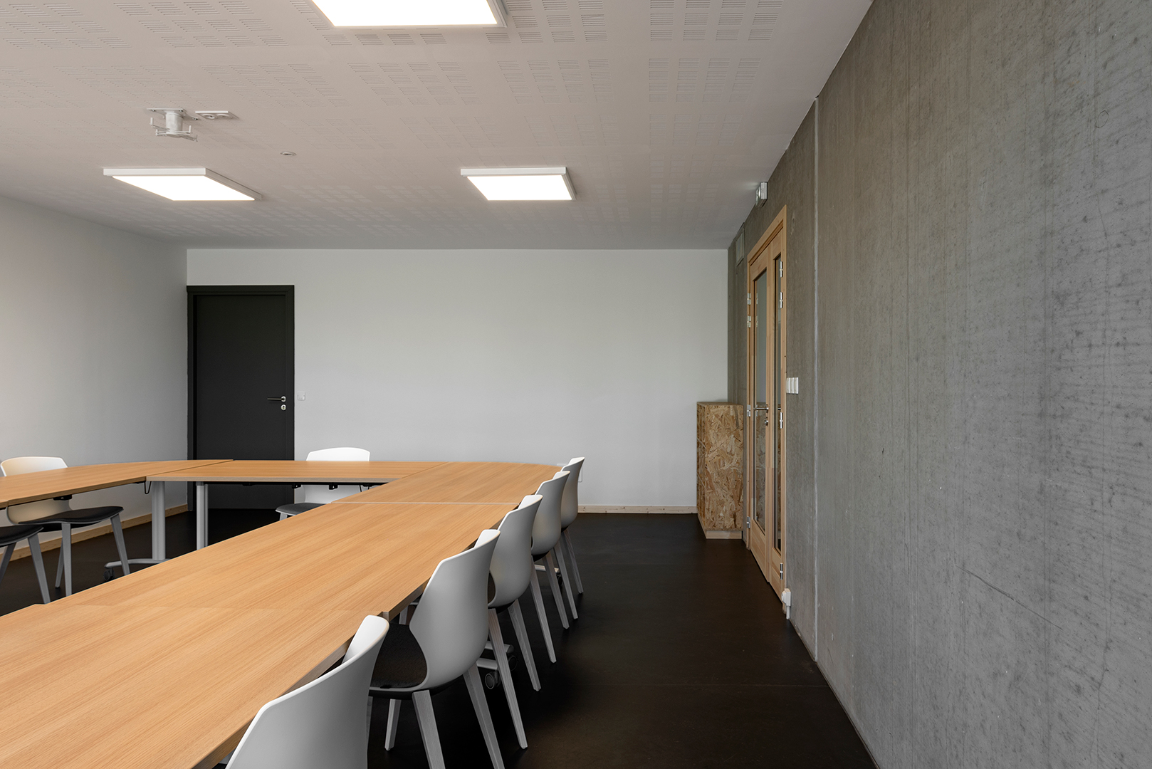 En outre, le bâtiment n’utilise que deux matériaux : le bois (également structurel sur la majorité du bâtiment) et l’acier galvanisé. Le premier, par sa teinte neutre, s’intègre aux teintes du site et est particulièrement qualitatif. L’acier galvanisé permet au bâtiment des couleurs changeantes au fil des saisons, prenant la couleur de son environnement.