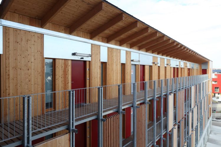 Pour garantir l’évolutivité des logements, l’ensemble des pièces humides, les deux circulations verticales et la majorité des entrées des logements sont implantées dans les volumes en béton, épines dorsales du projet, selon un principe de « bandes actives » ou d’espaces servants. Les logements sont desservis par des coursives qui donnent un intérêt plastique à la façade nord-est sur le boulevard. Les espaces nobles des logements sont idéalement placés dans les volumes en bois et s’ouvrent majoritairement sur l’intérieur de l’éco quartier.